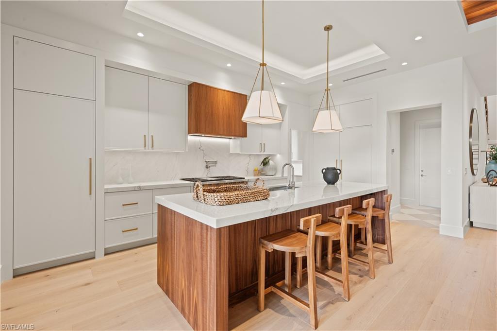 Welcome to 1199 12th Street North, an exquisite new construction in the prestigious Lake Park Community. Designed by the renowned MHK Architecture and W Design, and developed by Blue Horizon Construction, this luxurious two-story residence features four spacious bedrooms, including a ground-level master suite, and four elegantly designed bathrooms, along with two half bathrooms. The home also includes a versatile study den, perfect for a home office or library. Appointed with high-end finishes, this home boasts European white oak wide plank wood flooring, quartzite countertops, and custom ceiling designs. Experience state-of-the-art living with top-of-the-line Subzero and Wolf appliances that set a benchmark for gourmet standards. Every detail has been thoughtfully considered, exuding comfortable luxury with a flat tile roof, pool and spa, PGT hurricane windows and doors, and an above flood plain two and a half-car garage with upgraded custom doors and a custom paver driveway. The custom wet bar, featuring custom cabinetry adds to the home's allure. This home seamlessly blends functionality with exquisite style, offering a well-appointed bedroom and office on the ground floor, while the upper-level hosts three additional bedrooms paired with a versatile loft—a perfect retreat for family or guests. The built-in outdoor kitchen is perfect for entertaining, and the second-floor covered balcony offers stunning sunset views every night. Enjoy one of the best lake views in Naples, FL from your outdoor heated pool and spa or from the covered balcony, making every moment at home feel like a luxurious getaway. Safety and modern convenience are paramount, with hurricane impact windows and doors, home automation with lighting control, wired security, and surround sound. Ideally located just minutes from downtown Naples' Fifth Avenue South, 3rd Street South, Lake Park Diner, Venetian Village, Waterside Shops, Four Seasons, and Naples' world-class shopping, entertainment, and white sand beaches. This home is less than a ten-minute walk to both Fleischmann Park and Lake Park Elementary.