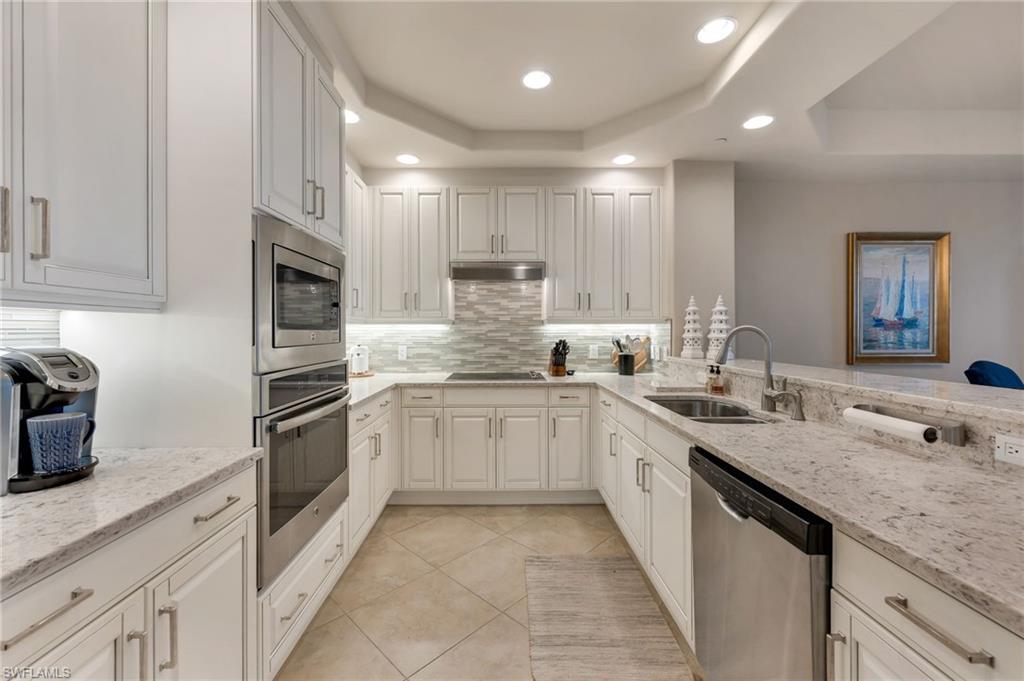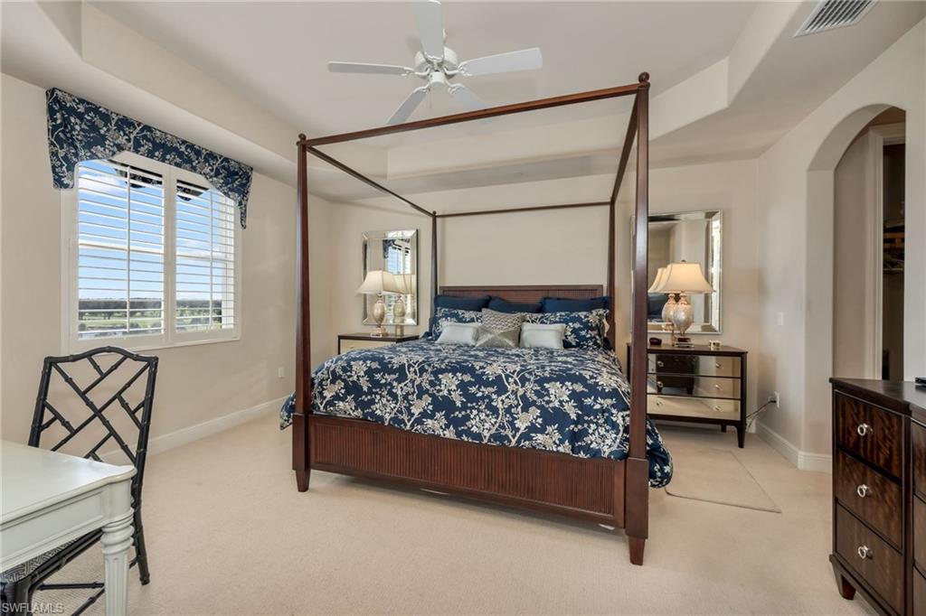 Vista Pointe Mid-Rise at The Vineyards offers panoramic golf course and lake views from this pristine fifth-floor residence. This beautifully appointed home features three bedrooms, three-and-a-half baths, deeded parking, and additional storage. A private elevator opens directly into your exclusive foyer, creating an immediate sense of privacy and elegance. The residence shows like a model and offers a spacious great-room floor plan with neutral, timeless finishes. The updated kitchen is thoughtfully designed with new cabinetry, quartz countertops, a custom backsplash, under-cabinet lighting, and additional upgrades. The home is decorator-furnished and enhanced by custom window treatments, tray ceilings, impact-resistant windows, and electric hurricane shutters for added peace of mind. Enjoy tranquil mornings on the spacious screened in lanai overlooking serene lake and golf course vistas. This residence offers numerous upgrades and an easy, maintenance-free lifestyle. Residents enjoy resort-style amenities, including a spectacular pool with cascading waterfalls and a beautifully appointed clubhouse featuring a caterer’s kitchen, fitness room, library, and picnic area. Conveniently located adjacent to The Vineyards Country Club, which offers optional private memberships with two levels of access, including 36 holes of newly renovated championship golf, 12 Har-Tru tennis courts, pickleball, bocce, and luxurious wellness and spa facility. The wellness center includes a state-of-the-art fitness center, café, halotherapy salt room, massage and salon services, and a saltwater lap pool.