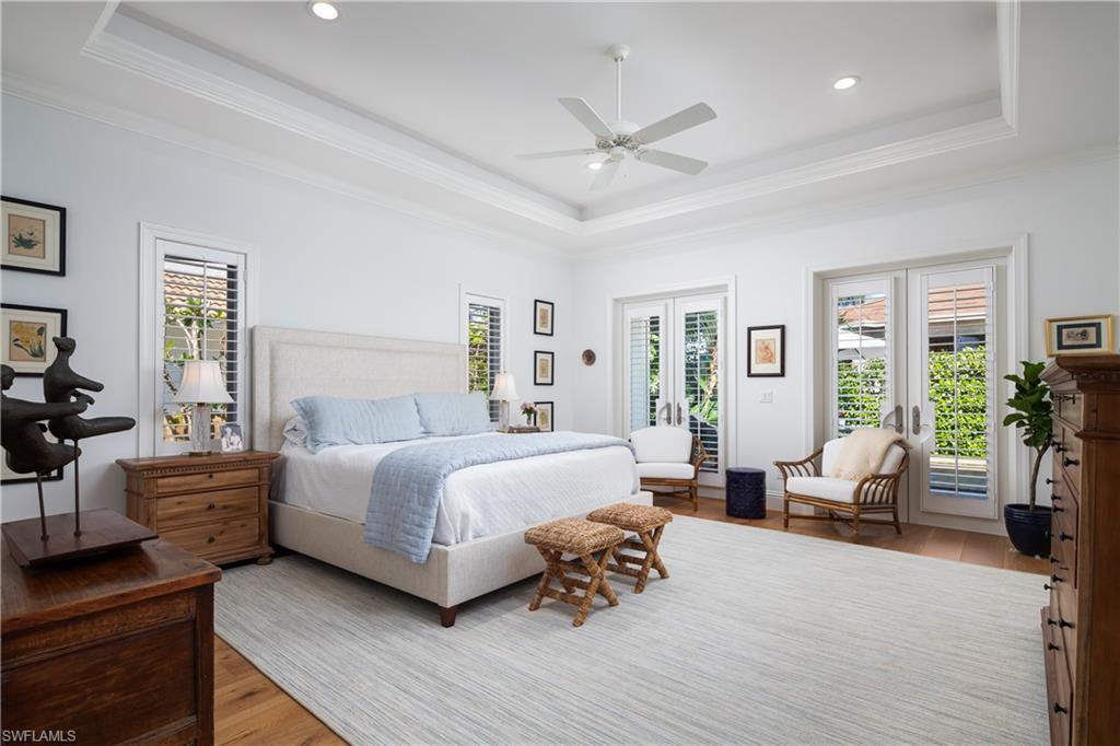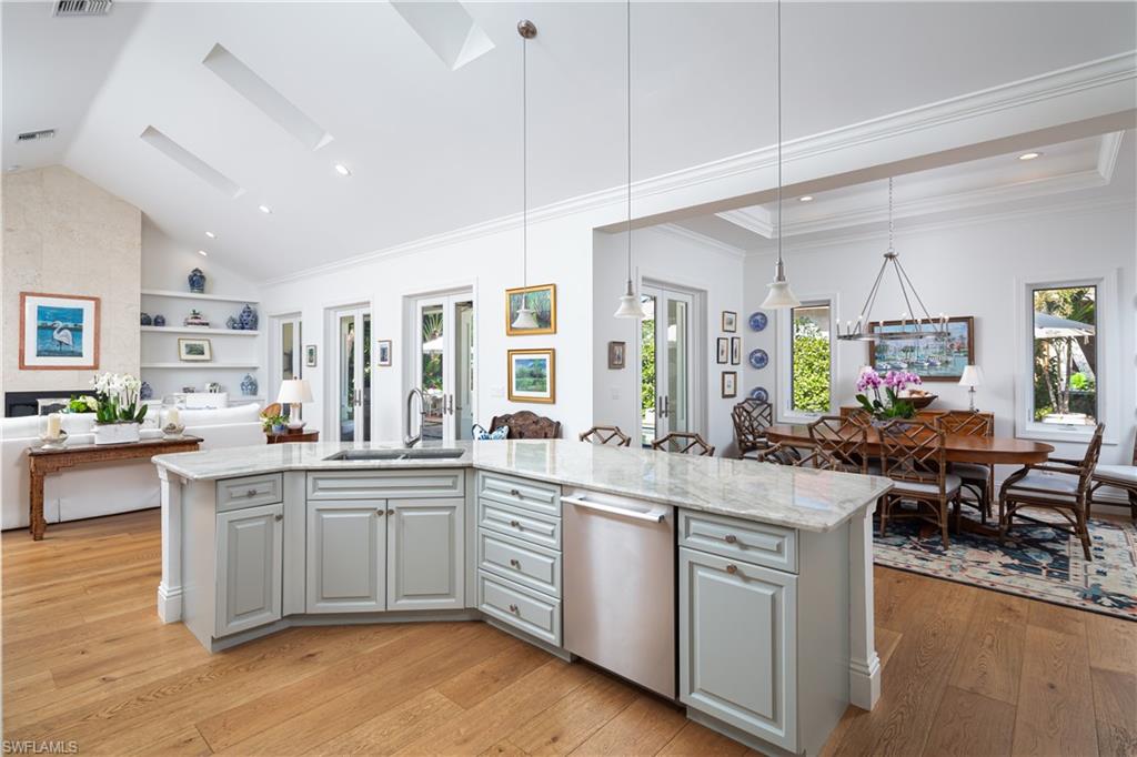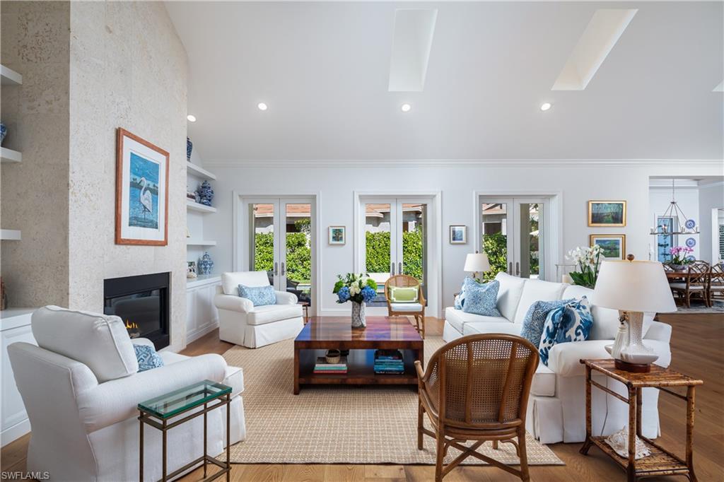 Located in the heart of The Moorings, this sophisticated tropical retreat blends timeless elegance with modern luxury, offering a rare opportunity to own a meticulously updated coastal residence just minutes from the beach. Renovated between 2019-2024, the home features an expansive great room with vaulted ceiling, a striking coral stone fireplace, and seamless indoor-outdoor flow through multiple French doors. The kitchen is designed for both entertaining and everyday living, showcasing custom cabinetry Thermador appliances including a 36 inch Induction cooktop, quartzite counter tops and generous storage. The first floor primary suite is a private sanctuary with a spa-inspired bath, and a large walk-in closet. A guest ensuite on the main level add flexibility, while two additional bedrooms upstairs provide comfort and privacy for family or guests. Step outside to a lushly landscaped backyard oasis featuring a covered lanai, heated pool and tranquil garden setting, ideal for year-round enjoyment. Additional highlights include a bar, with beverage refrigerator, impact-resistant windows and a new tile roof (2024). Residents enjoy optional access to the private Moorings Beach Park, enhancing the coastal lifestyle with exclusive beach parking and amenities. This exceptional home combines location, luxury, and livability - offering the very best of Naples living.