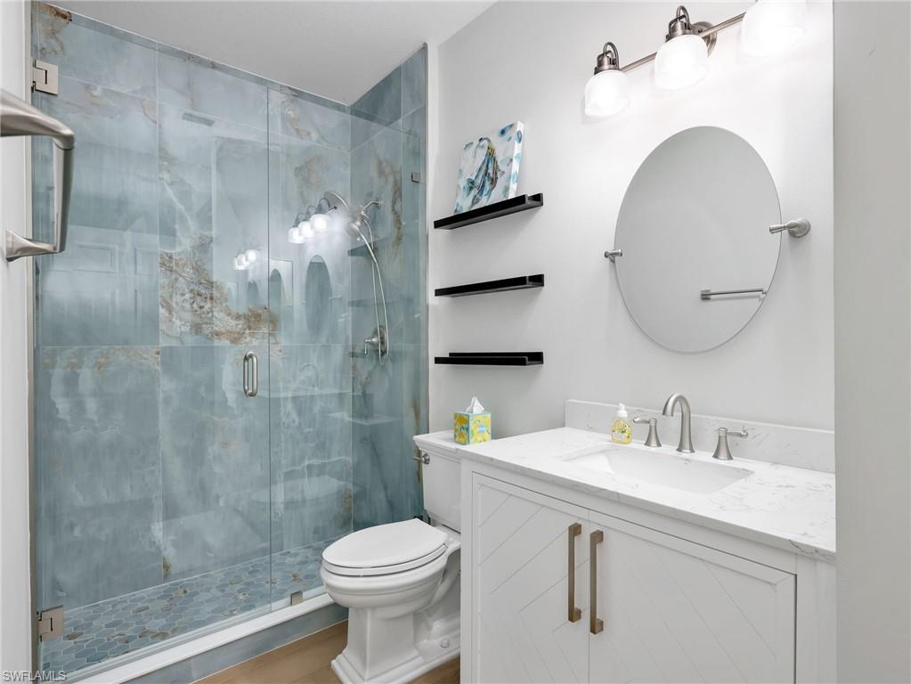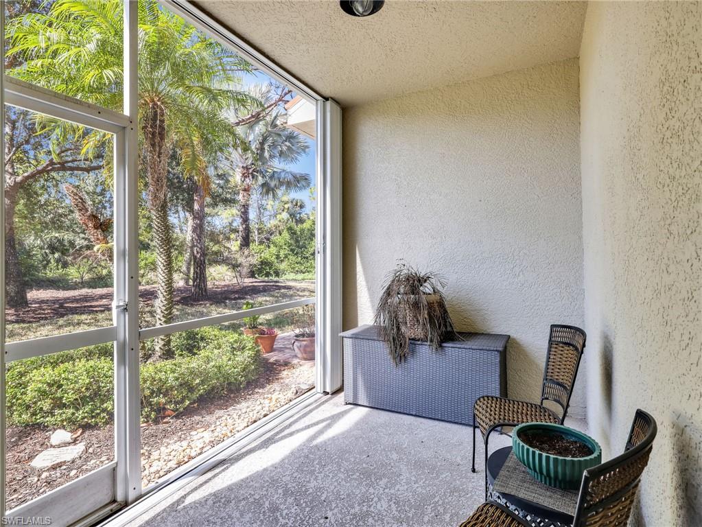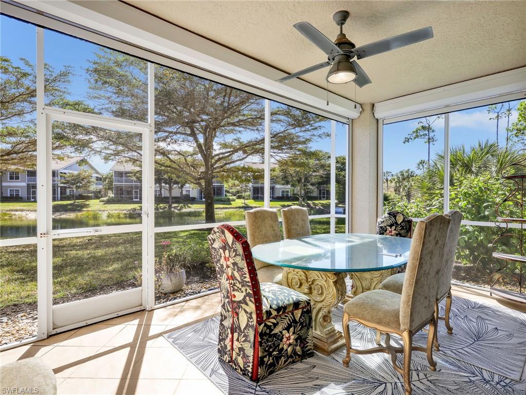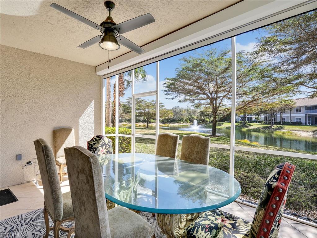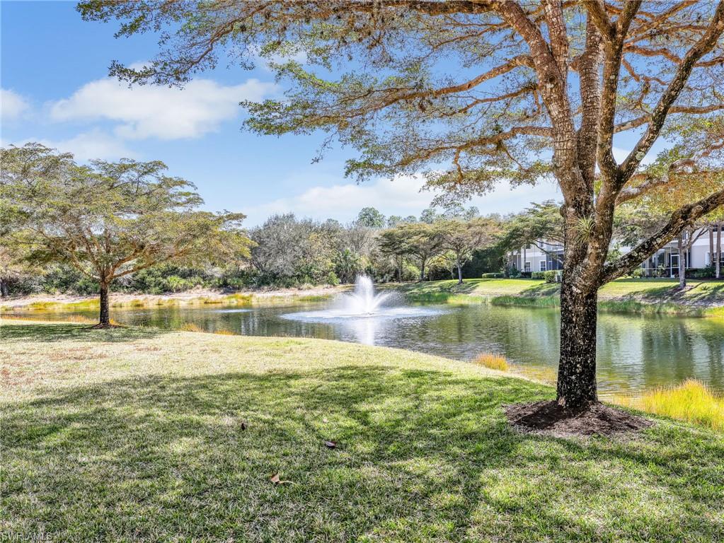 Beautifully updated 2 Bedroom + Den corner unit offering breathtaking lake and fountain views in the highly desirable community of Carlton Lakes. This light-filled residence features a fantastic split-bedroom floor plan with an open-concept design ideal for entertaining family and friends. Luxury Aquaguard walnut luxury vinyl flooring flows seamlessly throughout the home, enhancing the bright and airy layout. The beautifully appointed kitchen opens to the main living and dining areas and showcases quartz countertops, stainless steel appliances, and generous prep space—perfect for both everyday living and hosting. The expansive main lanai is accessible from the living and dining areas and provides stunning long-water views, creating the perfect setting for morning coffee or sunset gatherings. A second, private lanai off the den offers lush landscaping and a quiet retreat for relaxation. Both bathrooms offer a spa-like ambiance. The guest bath was fully remodeled in 2023, and a custom primary closet system was installed in 2024, adding both elegance and functionality. Hurricane protection is complete with accordion shutters installed on all windows and the smaller lanai in 2022, plus electric hurricane shutters on the larger lanai. The garage is equally impressive with a new door opener and epoxy-coated flooring. This residence requires no updates—move-in ready and meticulously maintained. Carlton Lakes Amenities Residents enjoy access to a master clubhouse featuring a 60-foot lap pool and hot tub, tennis courts, bocce courts, fitness room, tot lot, fishing pier, and beautifully maintained grounds. All lakes are stocked for catch-and-release fishing, enhancing the tranquil lifestyle this community is known for. Ideally located with exceptional walkability to grocery and dining options. Just minutes to Naples’ world-class shopping, fine dining, and stunning white sand Gulf beaches. This exceptional lakefront condo offers luxury, location, and lifestyle—all in one.