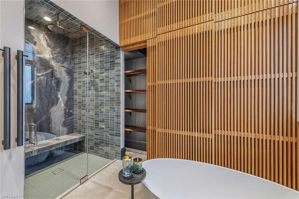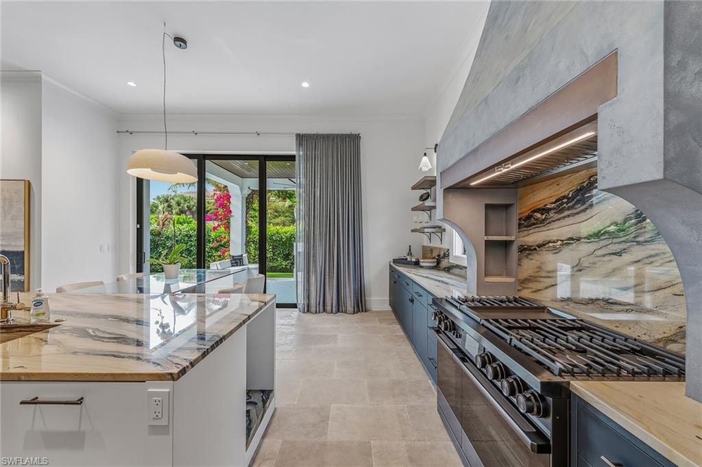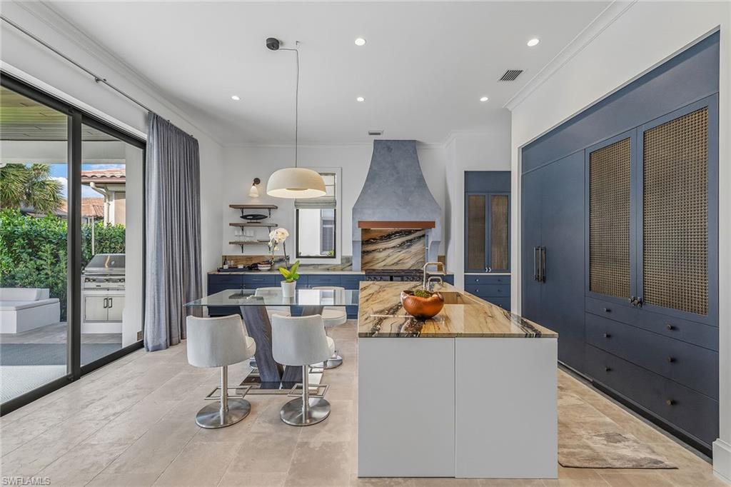 Beyond the gates of Grey Oaks, one of Naples prestigious communities, this 2024-renovated residence reveals a curated experience of architectural refinement and material excellence. Every element of this home has been redefined with purposeful design, where the essence of European craftsmanship converges with the subtle sophistication of quiet luxury. A gallery-style entry gives way to soaring ceilings and a dramatic, floor-to-ceiling picture window, drawing light across hand-selected French antique limestone floors. The interplay of stone and sunlight continues into the main living areas, while wide-plank European white oak from Spain softens the private quarters with understated elegance. The bespoke kitchen serves as a showpiece and gathering place, with European Eggersmann cabinetry concealing storage with architectural precision. Polished slabs of Azul Zumaia exotic quartzite cascade over countertops and the island, offering a natural work of art. A professional-grade gas range and custom-designed hood anchor the culinary experience, while curated details, including an integrated pet station, speak to a residence designed for elevated everyday living. The primary suite offers sanctuary. A spa-inspired bath with a walk-in steam shower, dry sauna and custom towel warmers creates a wellness retreat at home. Backlit mirrors, sculptural lighting, and Illusion exotic quartzite imbue the space with warmth and serenity. Throughout the residence, bespoke millwork, designer window treatments, and precision lighting create cohesion and refinement. Outdoors, the stunning French limestone continues, framing intimate spaces for conversation and celebration. A summer kitchen, sculptural seating with tailored cushions and a gas fireplace invite year-round alfresco living. Artificial turf and ample landscape lighting extend the home’s atmosphere into the garden, requiring minimal upkeep yet delivering maximum presence. Additional features include impact-resistant windows and doors, whole-house reverse-osmosis filtration, a tankless gas water heater, a 2.5-car garage with custom metallic flooring, and extensive built-in storage. Set within Grey Oaks, residents enjoy three championship golf courses, two clubhouses, tennis, pickleball, a 30,000-square-foot wellness center, resort-style pool and fine dining, all minutes from Fifth Avenue and Gulf beaches. This is not merely a renovation. It is a redefinition of what it means to live beautifully.