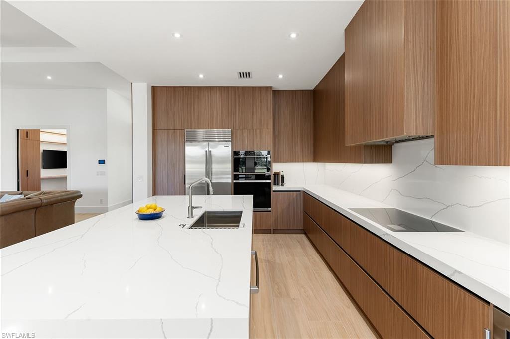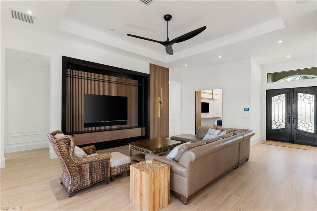 A one-of-a-kind retreat within Mustang Island, a private gated enclave in Lely Resort where refined design meets effortless Florida living. This completely reimagined and renovated smart home offers an ideal blend of sophistication and comfort for those seeking a resort-style lifestyle. Set on a private lakefront homesite surrounded by mature trees and palms, the three-bedroom-plus-den, two-bath residence features a spacious open-concept layout that transitions seamlessly from indoor living to extraordinary outdoor entertaining. The newly renovated kitchen showcases high-end appliances, including a Sub-Zero refrigerator, Wolf wall oven with a second stacked microwave/convection oven, 36-inch induction cooktop, premium quartz surfaces and sleek custom cabinetry. The primary suite offers panoramic lake and golf course views, a custom oversized walk-in closet, and a beautifully appointed spacious bath. Outdoors, the extended screened lanai overlooks wide water and golf course vistas and includes a heated saltwater pool and spa, refinished with tiled stone decking and tongue-and-groove hardwood ceilings over expansive covered lanai. Ideal for entertaining or quiet relaxation, this private retreat captures Naples signature sunset views. Recent upgrades provide peace of mind, including a new roof and gutters, impact-resistant windows and doors, electric rolldown storm shutters securing the covered lanai, new lanai cage and screening, refinished pool and spa, upgraded HVAC, water heater and pool equipment, 8-foot solid core interior doors, insulated interior walls and new laundry appliances. Immediate membership to The Player’s Club and Spa is included, offering access to three resort-style pools, tennis and bocce courts, a wellness center, dining venues and a full-service spa. Membership opportunities are also available at The Classics Golf Club, home to three championship courses. Minutes from downtown Naples and Marco Island, this home delivers the ultimate blend of luxury, privacy and resort living in one of Southwest Florida’s desirable communities.