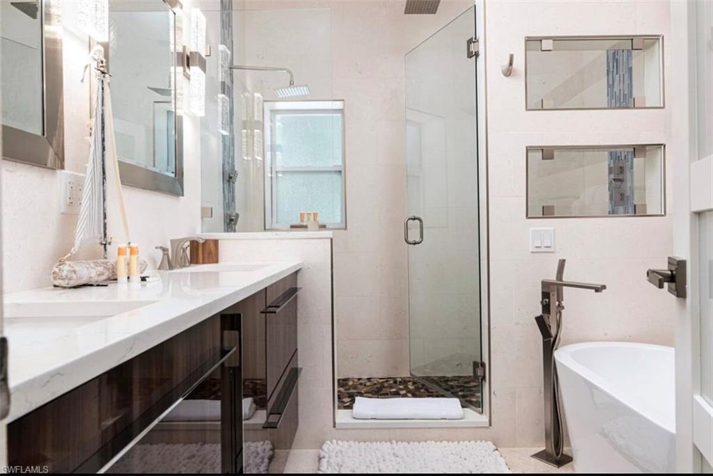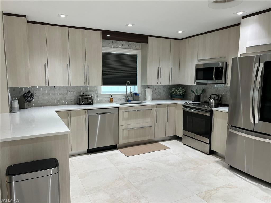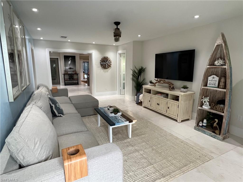 Stunning 4 bedroom 2 1/2 bath home in Naples Park less then mile to Vanderbilt Beach. Completely renovated in 2022, plumbing, electric, a/c, walls, metal roof, this property is amazing. Upgraded recessed LED lights in all rooms. Custom doors complement each room. Hugh chefs kitchen with 42" cabinets with deep drawers. Quartz counter top paired with beautiful backsplash and high end appliances. French doors to the covered patio with large picture window screen. Primary bedroom has sliders to the pool and a beautiful primary bathroom. Large screened in pool deck great for entertaining. Fenced backyard with PVC fencing. Low carry cost with no HOA, GREAT RENTAL INCOME property. Located minutes to so many popular Naples hot spots such as Vanderbilt Beach, Ritz-Carlton, Mercado shops and fine dinning restaurants. Home comes with/ one year home warranty for buyer comfort.