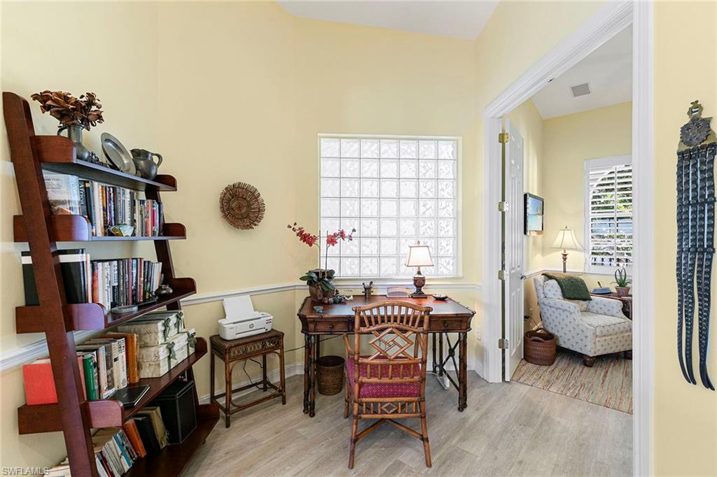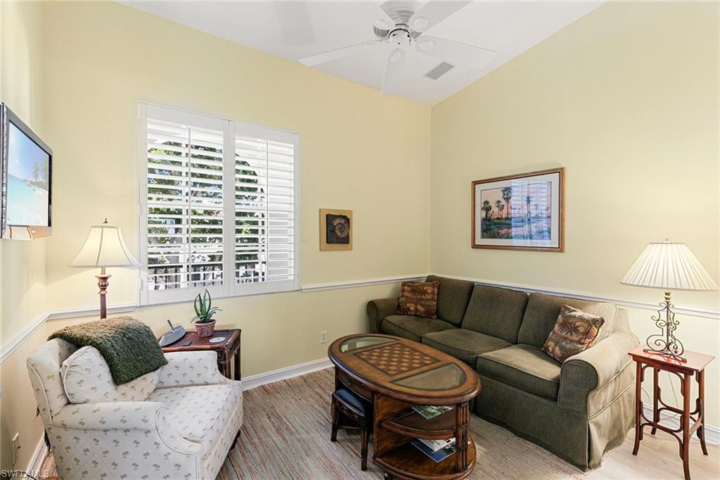 Perched on the top floor with soaring ceilings, this furnished three-bedroom, two-bath Breakwater residence delivers that bright, breezy Pelican Bay feeling the moment you walk in. Experience the essence of Naples beach resort living with a beautifully renovated kitchen and wood-look hard surface flooring throughout, creating a clean palette that's as low-maintenance as it is stylish, and making move-in truly effortless. Outside, the view is pure Naples as you look across an expansive lake to Pelican Bay Community Park, where mornings come with walkers, cyclists, and that easy vacation every day energy, all enjoyed in peaceful comfort from a generous screened balcony with electric grill and rolldown storm shutters. Breakwater offers oversized, private two-car garages, an uncommon luxury in Pelican Bay. Breakwater amenities include a gated entrance, clubhouse with pool and spa, and social and exercise rooms, and charming brick-paver streets. Pet owners love Breakwater's pet-friendly policy and enjoy all the perks of the Pelican Bay lifestyle, including a private beach club on the Gulf with two beachfront restaurants, beach attendant service, miles of pristine beaches with exclusive access, canoeing and kayaking in picturesque Clam Bay estuary, two tennis centers, pickleball, and fitness and wellness center. Exceptionally just minutes to Mercato and Waterside Shops vibrant dining and shopping scene as well as Artis-Naples offering a premier cultural experience, featuring world-class music, visual arts, and performances as the home of The Baker Museum and the Naples Philharmonic. Ideal for buyers who want a furnished retreat with an active setting, elegant updates, and the simplicity of arriving with a suitcase and starting season on day one.
