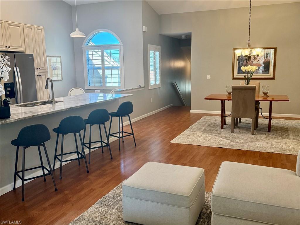 A RARE FIND: EXTENSIVELY RENOVATED KITCHEN CREATES AN OPEN FLOOR PLAN with brand new stainless appliances, granite countertops, soft close cabinets, new flooring. Light and bright turnkey home in desirable North Naples community of Huntington Lakes. Stylishly turnkey furnished coach home offers extraordinary living space. Fresh paint in serene colors, vaulted ceilings, new recessed lighting, and plantation shutters complete the experience. Newer roof, 2023 AC, impact windows and sliders, attached garage, wraparound lanai. This exceptional community offers three beautifully designed pools, one of which is just steps away from this home, lots of well-manicured green space, mature trees, five lakes. Activities include biking and walking space, tennis and bocce courts, and an extensive social calendar. Golf and pickleball groups gather to play together outside the community. The North Naples area is convenient to dining, shopping, and entertainment. Six miles to the beach, 15 minutes to Mercato center, 25 minutes to 5th Avenue, 20 minutes to the airport. You are going to love it here.