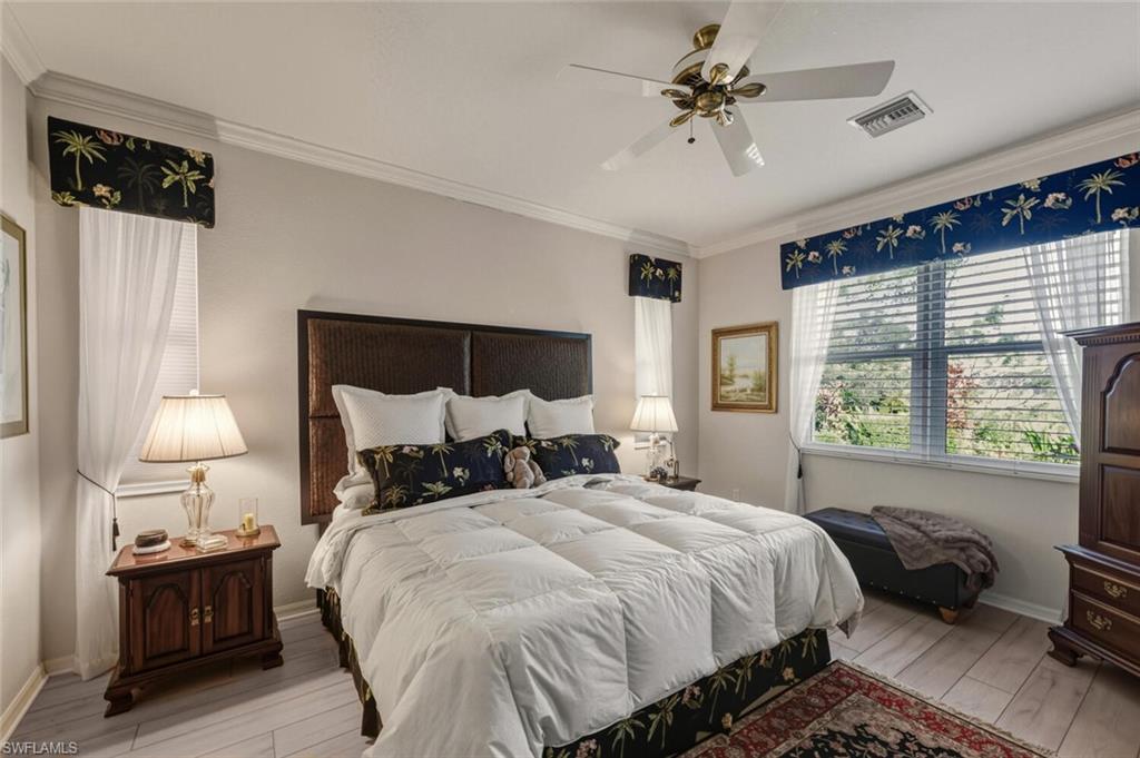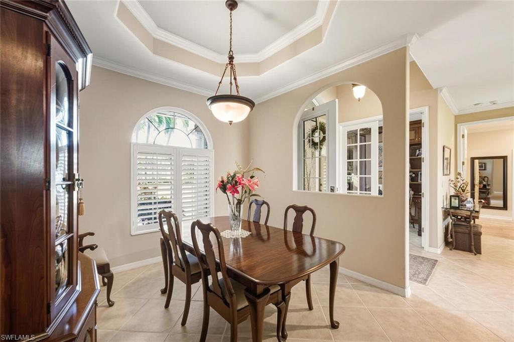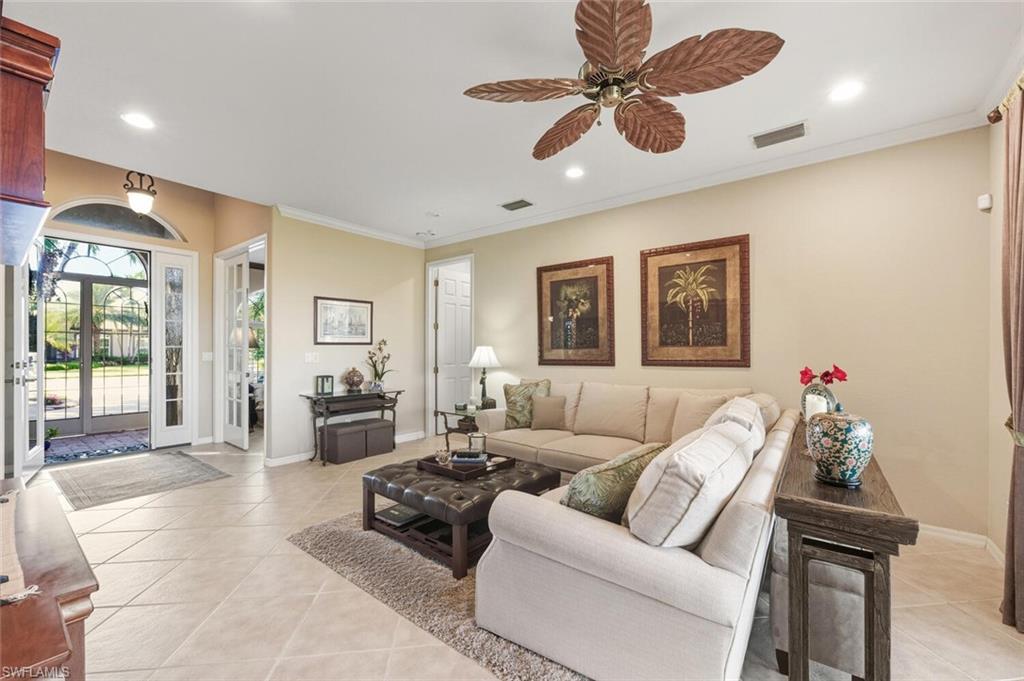 A beautiful upgraded, move in ready furnished home located in Forest Park is waiting for a new family. This property offers a bright, open floor plan with 3 bedrooms, 2 baths and a library style office located just off the entryway. Recent updates include a newer roof, HVAC system, impact windows, central vac system, leaf guard, electric roll down shutters on all front windows, accordion on side and back for double protection and electric shutters to protect the lanai area. The spacious primary suite includes a luxurious bathroom with separate soaking tub and walk-in shower. Enjoy the wonderful water views and landscaped yard from the very large screened in lanai perfect for relaxing or entertaining. Forest Park is a gated, pet-friendly community with amenities that include a community pool, fitness center, card and billiard rooms and library. Right next door is Golden Gate Park that features a boat ramp, personalized fitness center, tennis courts, walking and biking trails and an aquatic center for children and adults. Everything to make your life easy.