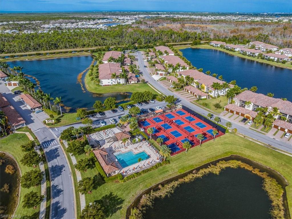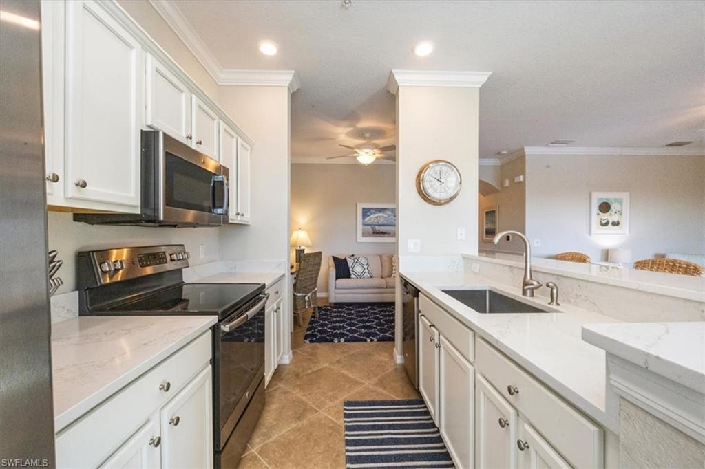 Perched on the top floor, this beautifully updated residence captures breathtaking long lake views and offers a light-filled, open floor plan designed for both comfort and style. The kitchen has been refreshed with white cabinetry, sleek quartz countertops, stainless steel appliances, and a charming breakfast nook that looks out over the water, while the adjacent formal dining room provides flexibility to serve as a home office or den. The kitchen and living area flow seamlessly to the private, screen-enclosed lanai, creating the perfect setting to relax and enjoy the tranquil views. The primary suite features two spacious closets and a tiled walk-in shower, while the guest bedroom and bathroom are thoughtfully positioned on the opposite side of the home to ensure privacy for all. Furnishings are negotiable, offering a seamless, move-in-ready opportunity! Impact windows and sliders provide peace of mind, and recent updates include a new air conditioning system and washer installed in 2023, a bead-board accent wall in the entry hallway, custom window treatments, plantation shutters, upgraded plumbing valves, custom lighting fixtures, a freshly painted interior, a new smart thermostat, and added tile flooring and a new fan on the lanai. The exterior of the building is scheduled to be painted in an attractive new color scheme, with no assessment , adding even more appeal. This residence has been lovingly maintained by the original owner and includes a deeded covered carport and an extra-large private storage unit. Located within the prestigious, guard-gated community of Treviso Bay, residents enjoy an exceptional resort-style lifestyle featuring a stunning clubhouse with dining and social spaces, a resort pool with poolside service, a state-of-the-art fitness center, full-service spa, tennis courts, pickleball and bocce, and an active calendar of social events. All of this is set just minutes from downtown Naples, world-class dining and shopping, and the white sand beaches of the Gulf, making this an ideal opportunity to experience the very best of Naples living.