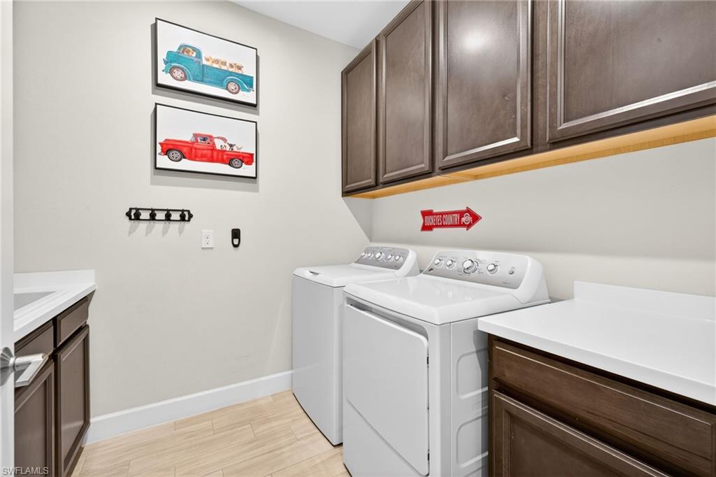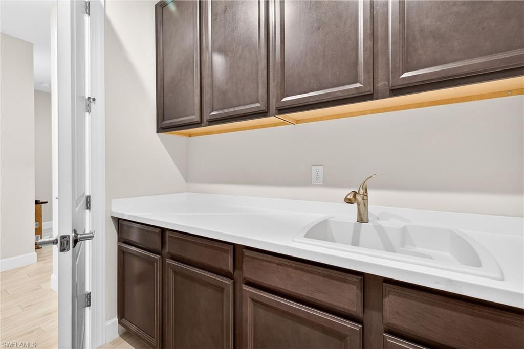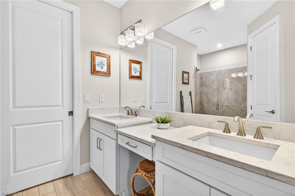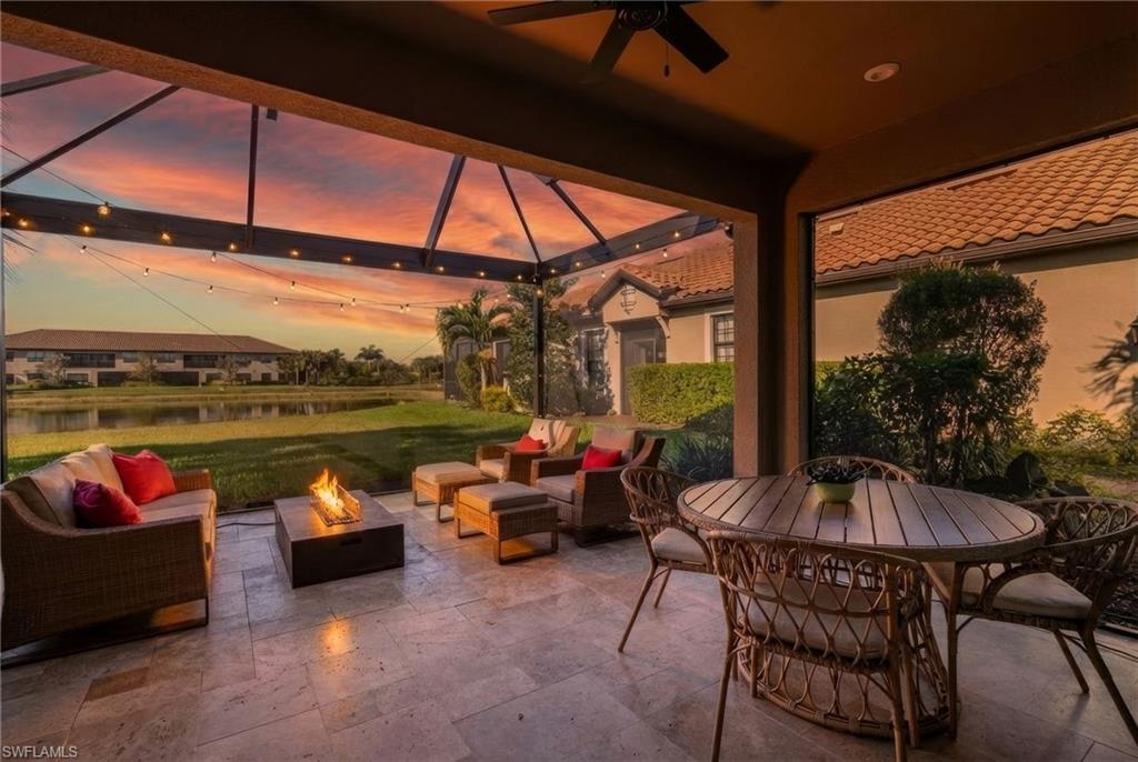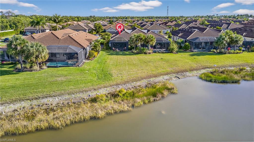 LAKESIDE VILLA- This 3 bedrooms plus a den, 2 bathrooms villa, offers 1,912 square feet of thoughtfully designed living space. The den features pocket doors, allowing it to easily function as a private office or optional fourth bedroom. Tile flooring runs throughout the home with NO CARPET, complemented by updated lighting and fixtures for a clean, modern feel. The kitchen is both bright and functional, featuring quartz countertops, stainless steel GE appliances, white shaker cabinetry with soft-close convenience, and an abundance of windows that fill the space with natural light. For added peace of mind, the home is equipped with a 22 KW GENERAC GENERATOR, ideal for Florida’s storm season. Outdoor living is a standout, with an extended lanai finished in upgraded travertine pavers overlooking the lake with desirable SOUTHWESTERN EXPOSURE for afternoon sun and colorful sunsets. The lanai is roughed-in and ready for an outdoor kitchen, and the spacious rear lot offers ample space to build your own pool/spa or further expand the lanai. Located within Esplanade by the Islands, a sought-after Taylor Morrison community known for its modern, resort-style amenities, residents enjoy a beautifully appointed clubhouse with a large fitness center, stretch room with group classes, locker rooms with towel service, and the Toasted Café for coffee, tea, and light bites. Additional amenities include a resort-style pool and spa, the "Bahama Bar" with full food and drink service, tennis and pickleball courts, a dog park, game room, and a full-service salon and spa offering aesthetic treatments and massage therapy. A future culinary arts center with wine tastings and formal dining is planned, with an anticipated opening in 2027. Ideally situated just 15 minutes from Marco Island, 20 minutes from downtown Naples, and only minutes to Publix, Walmart, shopping plazas, and a variety of local restaurants, this home offers the perfect balance of comfort, convenience, and elevated Southwest Florida living.