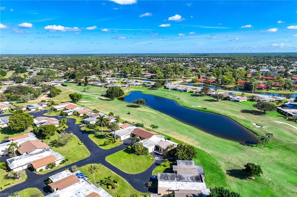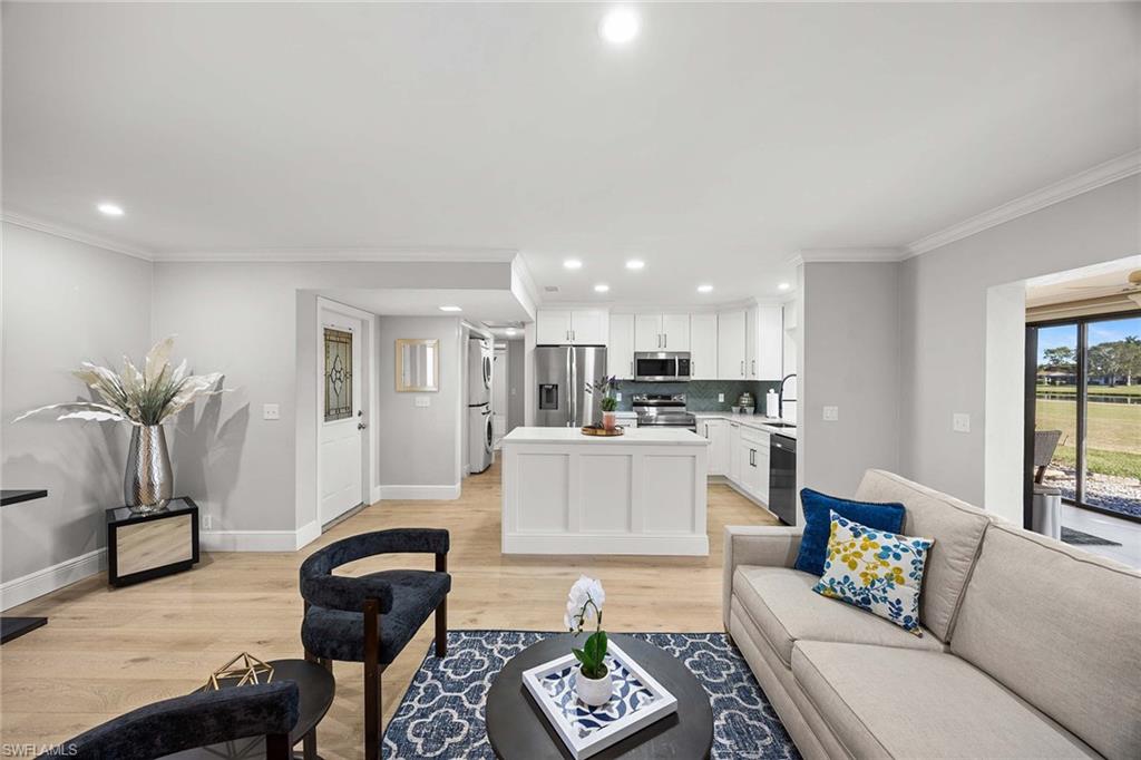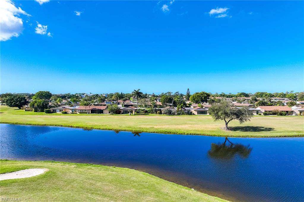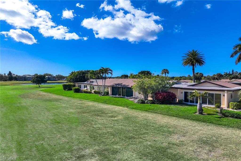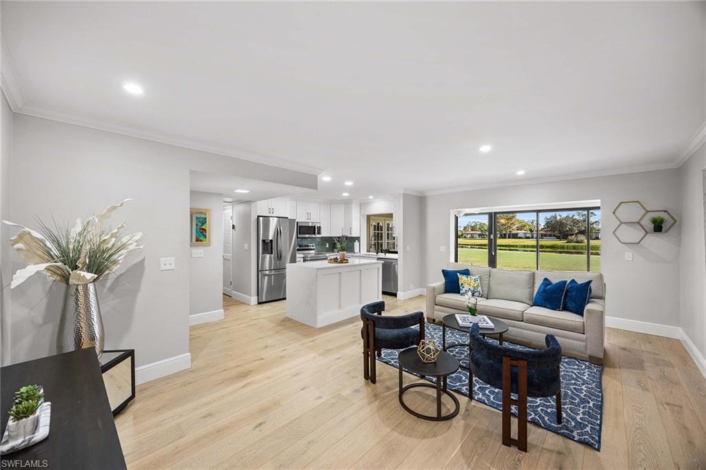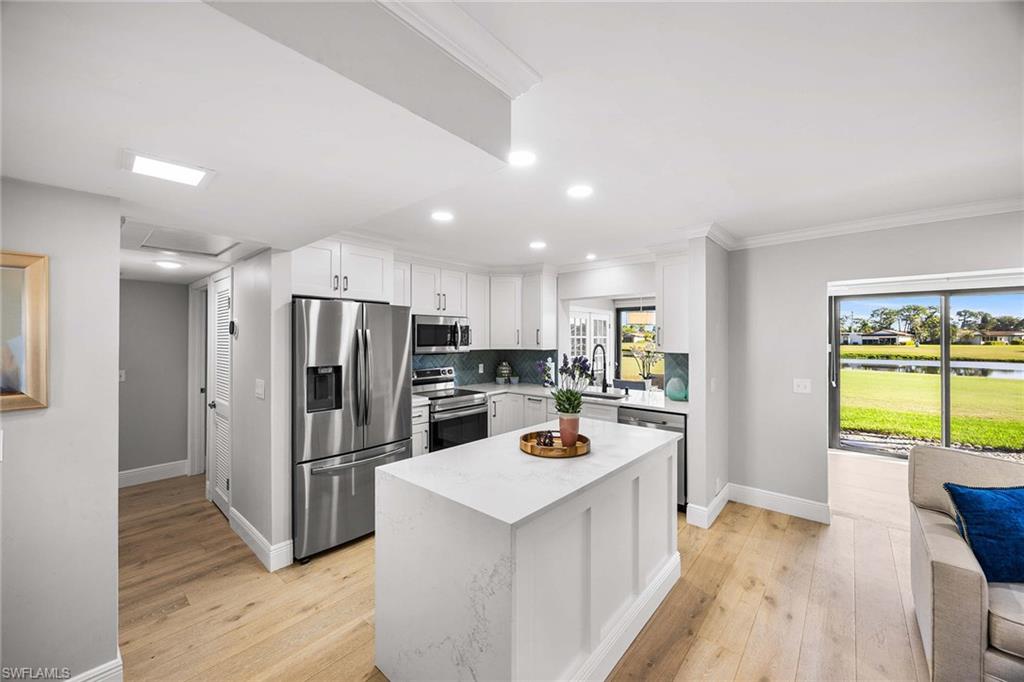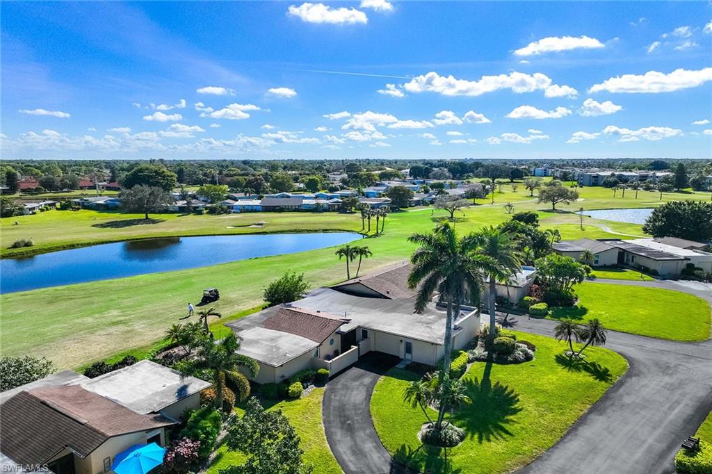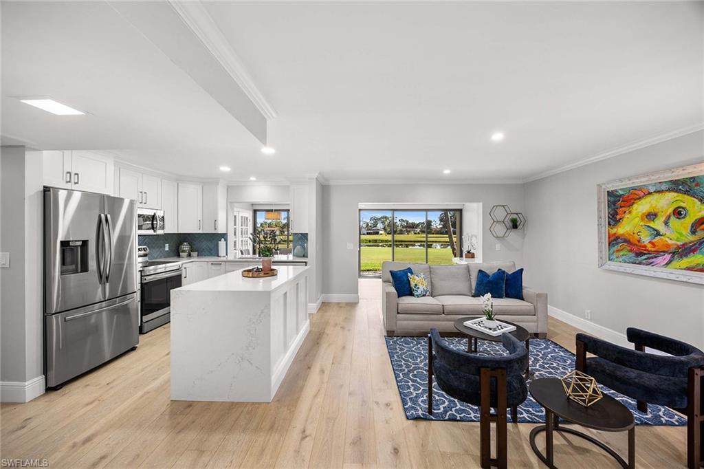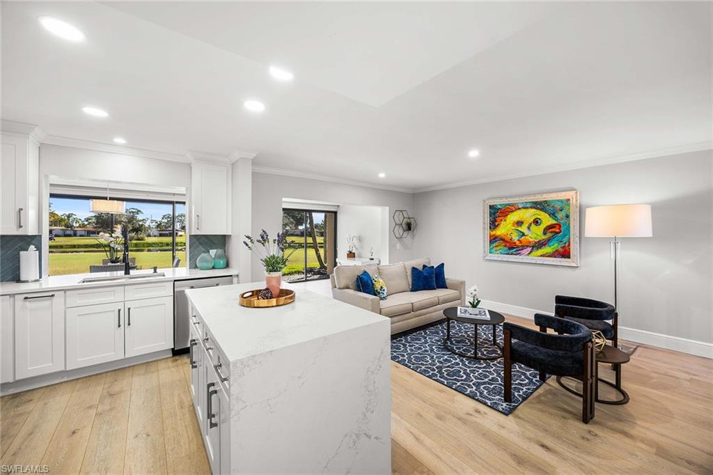 Location, location, location! With high-end upgrades, this expanded coastal cottage has an expansive golf course view. On a cozy side street just off the boulevard, this villa lives like a single-family home. French oak floors and luxury stone look porcelain tile give the home low-maintenance elegance. The kitchen has been upgraded with a waterfall quartz island, new stainless appliances and sparkling white shaker cabinets. Full-size Samsung front-load washer and dryer convenient to hall pantry. Primary suite has golf course view and double French doors to enclosed patio. The low maintenance exterior features impact windows, except sliding glass doors, oversized 1.5-car garage with storage for beach toys, golf cart or a workshop, extra-long driveway and convenient guest parking. At the heart of the community is the Lakewood Golf and Country Club, with optional memberships and public tee times. Enjoy the best of Naples beaches, shopping and dining with a gorgeous view. New roof in 2016. No damage to property from Hurricane Ian, according to owner. Lakewood Villas is a homeowner's association with low fees and single-family ownership.