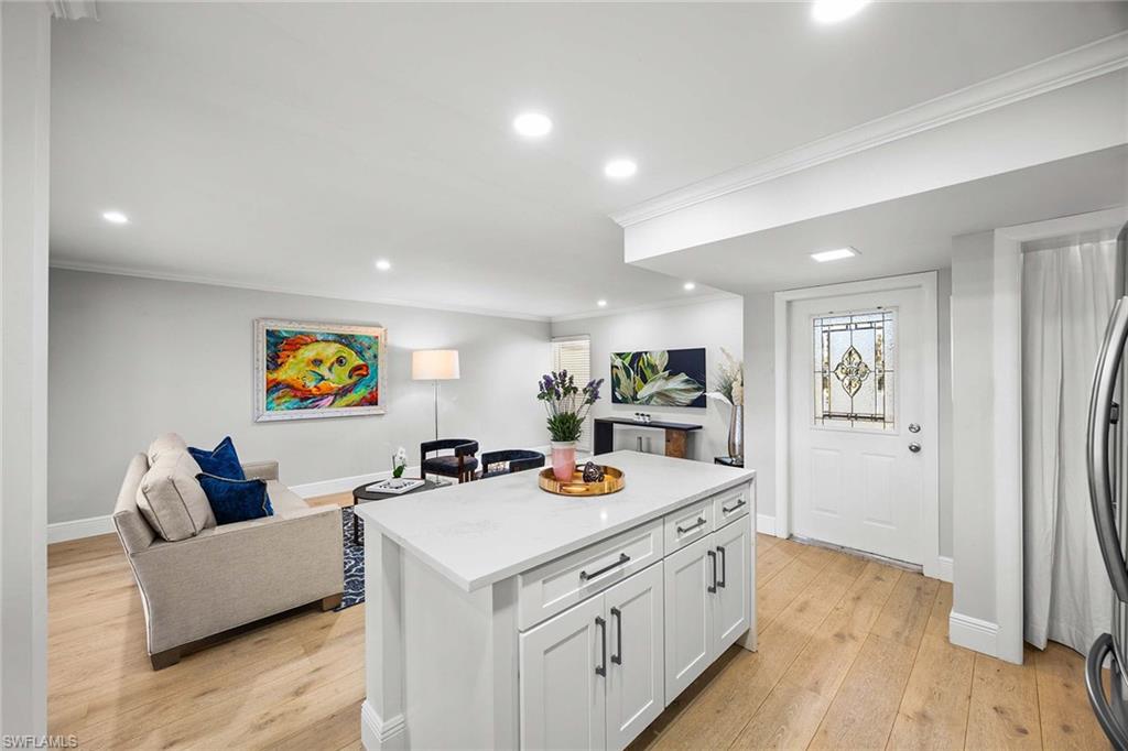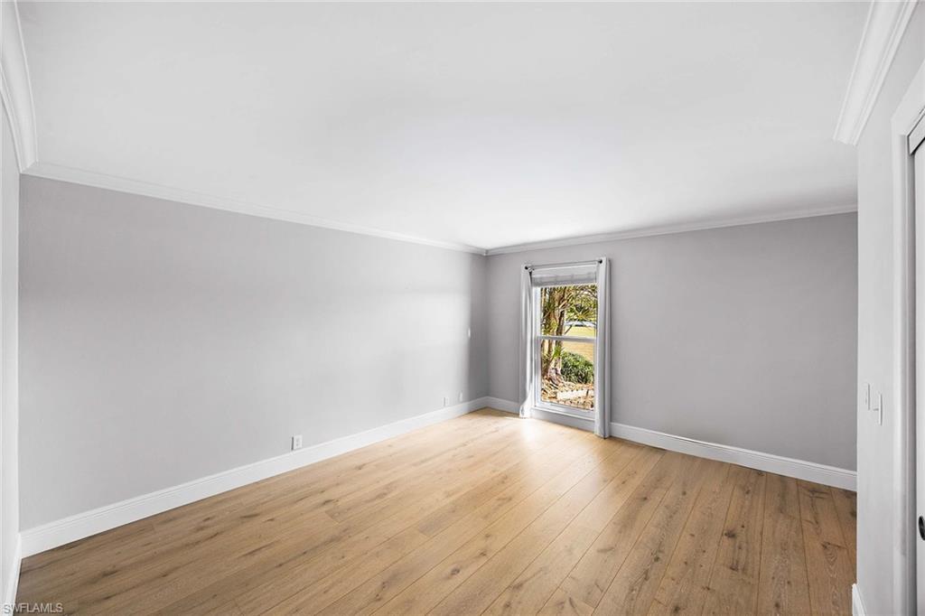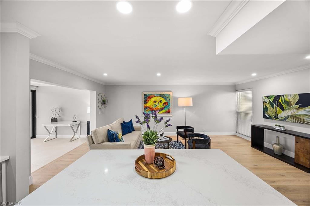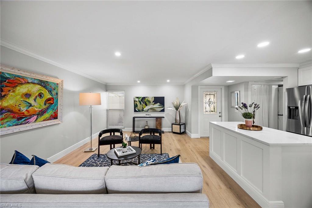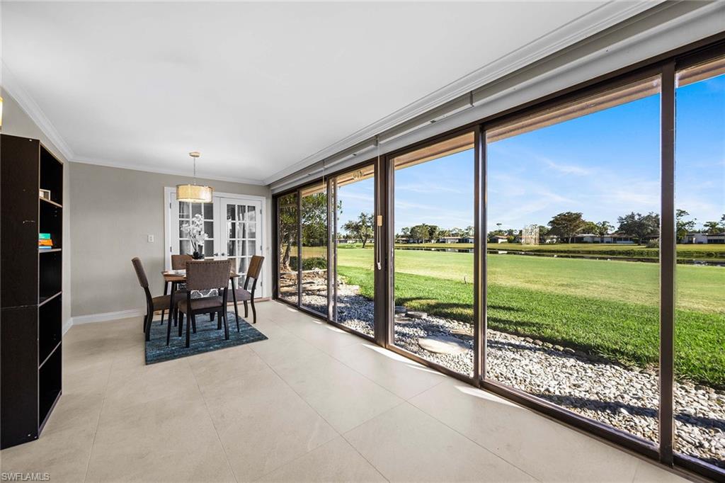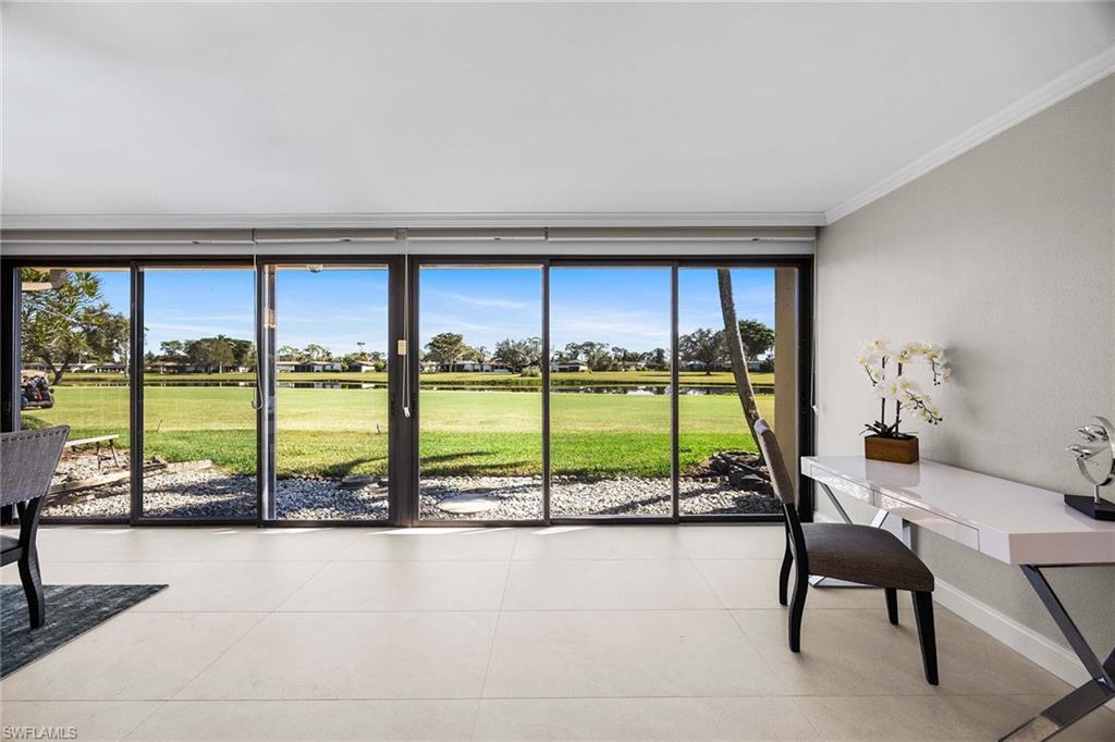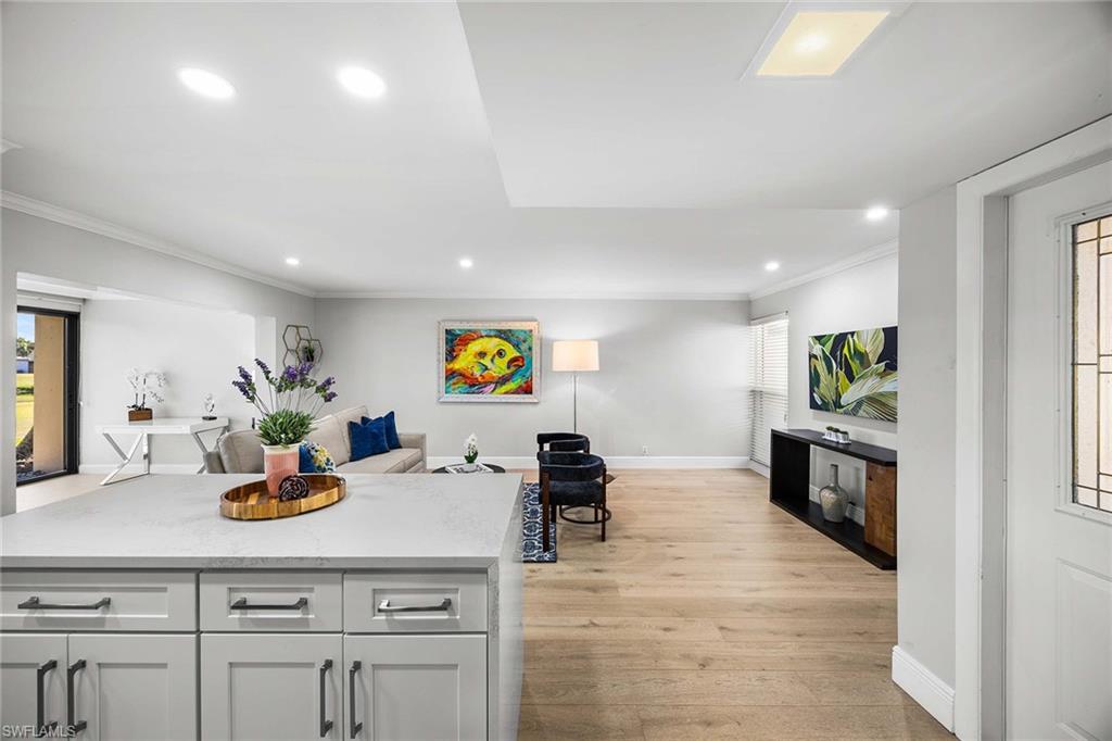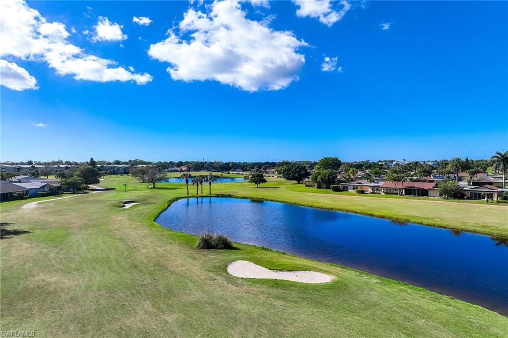 Location, location, location! With high-end upgrades, this expanded coastal cottage has an expansive golf course view. On a cozy side street just off the boulevard, this villa lives like a single-family home. French oak floors and luxury stone look porcelain tile give the home low-maintenance elegance. The kitchen has been upgraded with a waterfall quartz island, new stainless appliances and sparkling white shaker cabinets. Full-size Samsung front-load washer and dryer convenient to hall pantry. Primary suite has golf course view and double French doors to enclosed patio. The low maintenance exterior features impact windows, except sliding glass doors, oversized 1.5-car garage with storage for beach toys, golf cart or a workshop, extra-long driveway and convenient guest parking. At the heart of the community is the Lakewood Golf and Country Club, with optional memberships and public tee times. Enjoy the best of Naples beaches, shopping and dining with a gorgeous view. New roof in 2016. No damage to property from Hurricane Ian, according to owner. Lakewood Villas is a homeowner's association with low fees and single-family ownership.