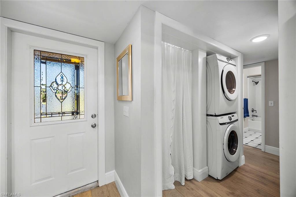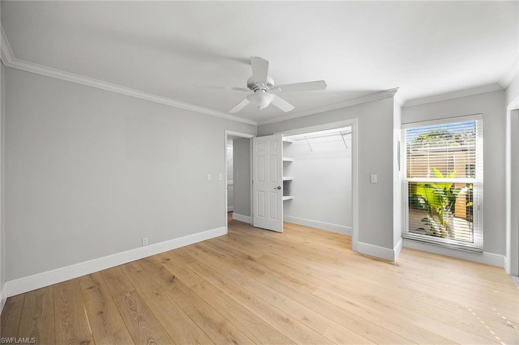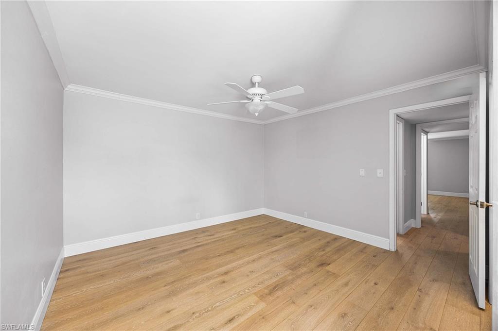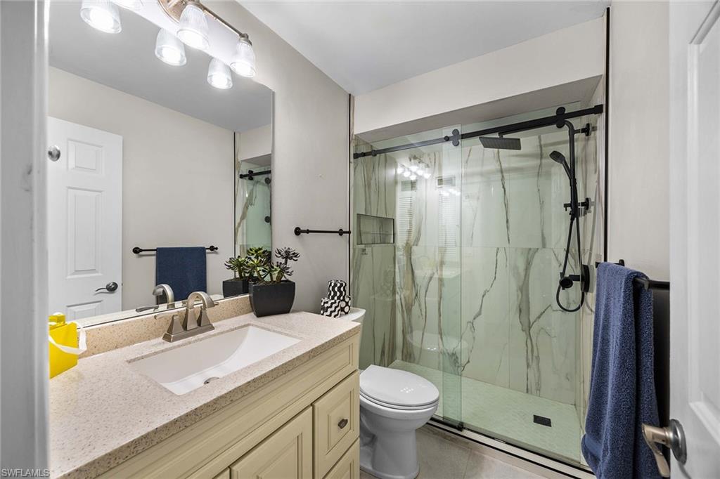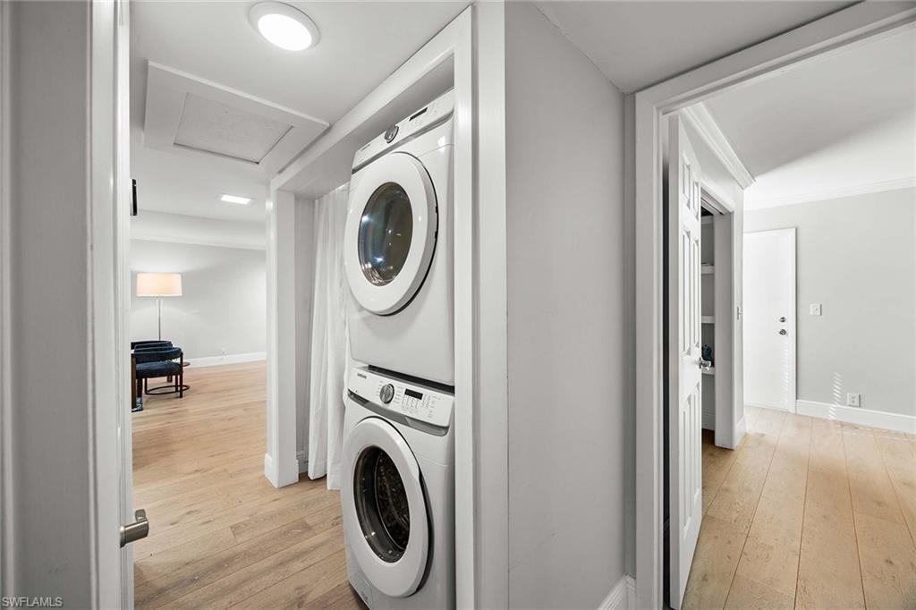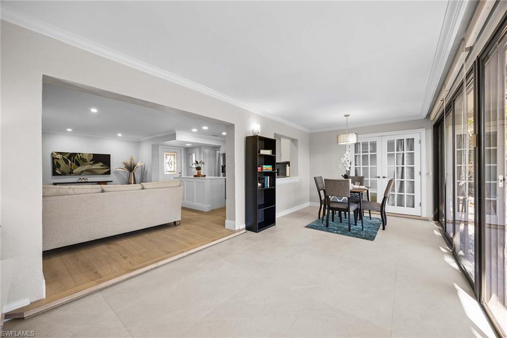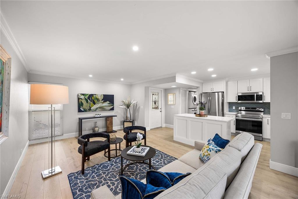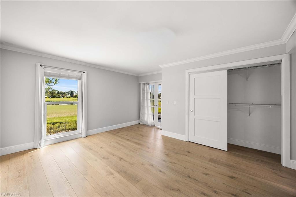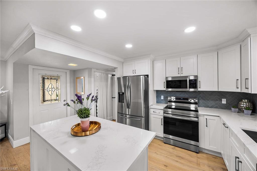 Location, location, location! With high-end upgrades, this expanded coastal cottage has an expansive golf course view. On a cozy side street just off the boulevard, this villa lives like a single-family home. French oak floors and luxury stone look porcelain tile give the home low-maintenance elegance. The kitchen has been upgraded with a waterfall quartz island, new stainless appliances and sparkling white shaker cabinets. Full-size Samsung front-load washer and dryer convenient to hall pantry. Primary suite has golf course view and double French doors to enclosed patio. The low maintenance exterior features impact windows, except sliding glass doors, oversized 1.5-car garage with storage for beach toys, golf cart or a workshop, extra-long driveway and convenient guest parking. At the heart of the community is the Lakewood Golf and Country Club, with optional memberships and public tee times. Enjoy the best of Naples beaches, shopping and dining with a gorgeous view. New roof in 2016. No damage to property from Hurricane Ian, according to owner. Lakewood Villas is a homeowner's association with low fees and single-family ownership.