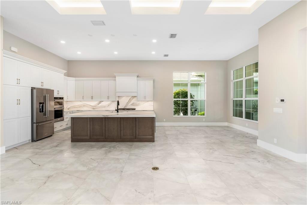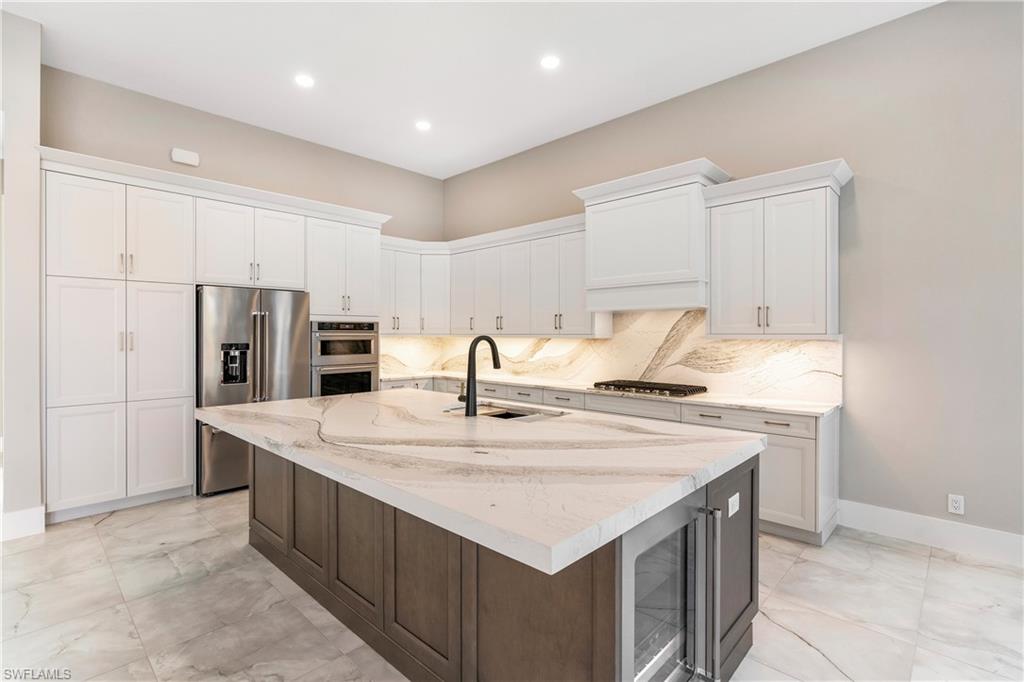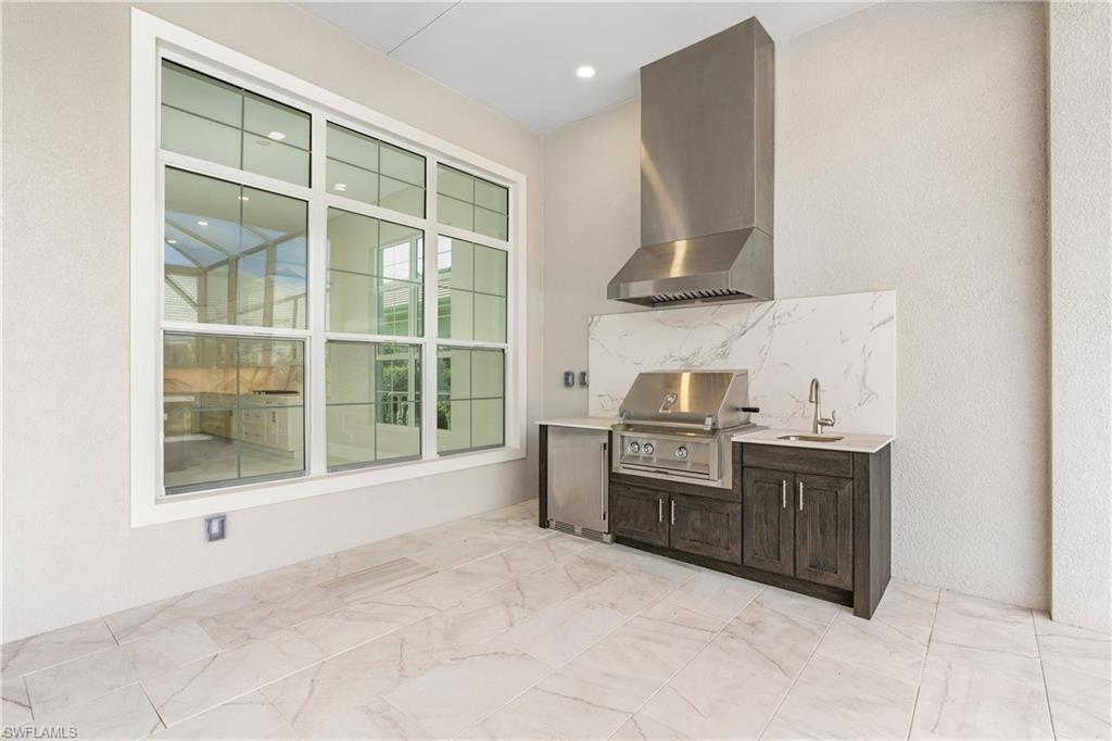 Be the first to live in this brand-new construction home by Stock Homes in Caymas, featuring the highly sought-after Birchwood III floor plan. Situated on a corner lot with no neighbors on the right side, this residence offers enhanced privacy along with over 2,400 square feet of living space, including 3 bedrooms, 2.5 baths, a den, and a 3-car garage with an epoxy-finished floor, thoughtfully designed for comfort and entertaining. The Birchwood III showcases a gas kitchen with upgraded quartz countertops and backsplash, enhanced cabinetry, custom hood, KitchenAid appliances, wine/beverage refrigerator, and a large center island ideal for gatherings. The open-concept floor plan features custom tray ceilings with integrated lighting and built-in speakers throughout the home and on the lanai. High-end tile flooring extends through all main living areas and bedrooms. Exceptional indoor-outdoor living awaits with nearly 1,000 square feet of covered lanai space, complete with an outdoor kitchen, fireplace, and a custom gas-heated pool and spa. The primary suite features his-and-hers walk-in closets, dual vanities, a soaking tub, and a frameless glass shower. Caymas spans 780 acres in a prime Naples location, offering a resort-style lifestyle with outstanding amenities including kayak launch, pickleball and tennis courts, golf simulator, private theater, billiards, indoor and outdoor dining, bocce courts, and a dog park. The impressive 25,000-square-foot clubhouse provides endless opportunities to connect and socialize. Ideally located near Naples and Marco Island beaches, shopping, and dining, this home delivers luxury living in an exceptional setting.