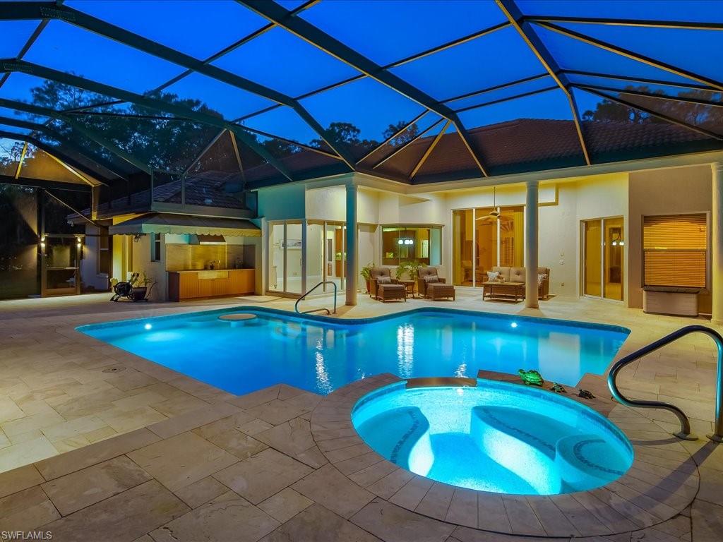 Privately set on an exceptionally rare and beautifully proportioned acreage, 5410 Mahogany Ridge Drive presents a compelling blend of space, craftsmanship, and effortless Naples living within the coveted Logan Woods community, where estate-style homes enjoy freedom from HOA fees and a sense of quiet seclusion. This solidly built DIVCO residence rests on approximately two point five seven acres of lushly landscaped grounds, offering a square, highly usable homesite with a fenced side yard and total privacy. Designed with entertaining and flexibility in mind, the home’s recently renovated southern-exposure pool and spa enjoy sun throughout the day, enhanced by an upgraded picture-screen enclosure and a dedicated pool bath. Zero-corner sliding glass doors dissolve the boundary between indoors and out, creating a seamless flow to an expansive open-air deck ideal for large gatherings, alfresco dining, or tranquil evenings beneath the stars. Inside, nearly two thousand nine hundred fifty-three square feet of thoughtfully designed living space unfolds in a four-bedroom, three-bath split floor plan. New tile flooring, plantation shutters, and custom cabinetry elevate the interiors, while the gourmet kitchen anchors the home with an induction cooktop, double convection wall ovens, generous prep space, and an inviting layout tailored for both everyday living and hosting. A distinctive highlight is the five hundred seventy-six square foot air-conditioned outbuilding, complete with a full bath and space for refrigeration, offering exceptional versatility as a guest suite, private office, workshop, or potential income-producing efficiency. Additional features include a whole-house water filtration system, mature fruit trees, a circular driveway with dual access points, and ample room for boat or recreational vehicle parking. Ideally positioned just minutes from the beaches, dining, and shopping that define the Naples lifestyle, this is a rare opportunity to enjoy privacy, flexibility, and refined outdoor living on one of Logan Woods’ most desirable homesites.