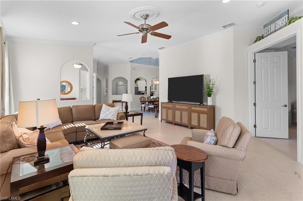 Welcome to this beautifully maintained 3-bedroom, 2-bath deeded condo home tucked away on a quiet cul-de-sac in the highly desirable Tarpon Bay community—offering easy, low-maintenance living without sacrificing space or privacy. Lightly used on a seasonal basis, this residence provides exceptional peace of mind with major updates already completed, including a brand-new roof, impact windows, and fresh exterior paint in 2025. The home features a bright, open great room floor plan filled with natural light thanks to its desirable southern exposure, creating an inviting and airy living space throughout the day. A side-load garage with an extended driveway enhances curb appeal and provides ample parking. Inside, refined architectural details such as crown molding throughout add an elegant touch, while both bathrooms have been upgraded with frameless glass shower enclosures. Designed for comfort and efficiency, the property includes a 5-year-old A/C system with new copper lines, gas cooking, gas hot water, and a gas dryer. A dedicated gas connection for a generator adds an extra level of preparedness and convenience. Outdoor living is a standout feature. The extended lanai enjoys cool evening shade, making it ideal for relaxing or entertaining, and is fully protected with storm shutters for all windows and doors. This move-in-ready home combines thoughtful upgrades, minimal wear, and the convenience of deeded condo living—perfect for enjoying the Florida lifestyle with confidence, comfort, and ease. Tarpon Bay is a gated, resort-style community with world-class amenities, including clay tennis courts, pickleball, basketball, volleyball, billiards, gas grills, infinity-edge pool, spa, and fishing pier. Ideally located near I-75 and just minutes to Naples’ pristine beaches, shopping, and dining, this community offers the ultimate Naples lifestyle