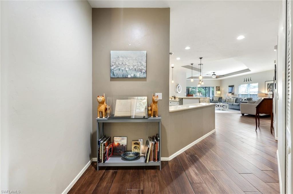 With picturesque golf course views as its backdrop, this modern condo retreat in the renowned Quail Creek Village community offers a relaxed, elevated way of living. The spacious great room floorplan is filled with natural light and features a desirable split bedroom design, complemented by stylish wood look tile flooring throughout. For home chefs, the kitchen is thoughtfully arranged with generous cabinet space, stainless steel appliances, and an open layout making it easy to entertain and enjoy the scenic golf views. Enjoy your tranquil owner's suite complete with an updated bathroom and sizable walk in closet. Outside on the screened lanai, relax with morning coffee, al fresco dinners, or open the sliding glass doors to welcome fresh air in. An oversized one car garage provides exceptional storage and boasts all new Epoxy flooring and custom built in cabinetry. Electric Storm Smart screens installed in 2023 and a full repipe in 2021 are also terrific added values for the new owner. Included with this condo is an Equity Social Membership to the Quail Village Golf Club granting access to the newly renovated clubhouse, unlimited summer golf, six rounds in season, tennis, bocce, pickleball, and the poolside pub Bogeys. Full Golf Memberships are available with no initiation fee for residents or waitlist. Whether you've been seeking a seasonal retreat, golf community, or simply a slice of Naples paradise, your exceptional residence awaits!