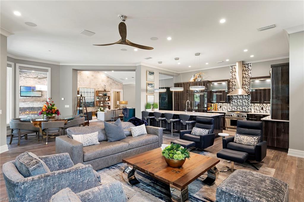 Warm sophistication defines this exceptional, fully renovated estate in the heart of Collier’s Reserve, set on nearly a half-acre with golf membership available. Inside and out, 927 Barcarmil Way showcases refined finishes, an open great room floor plan, soaring ceilings, intimate retreat spaces, and a timeless palette of warm, neutral décor. Seamless indoor-outdoor living is at the forefront, with the home flowing organically to an expansive outdoor oasis featuring generous covered areas, a charming fireplace gathering space with rustic mantel and stone accent wall, outdoor kitchen, electric awning, imbedded sun-shelf lounge chairs, soothing water feature, large pool and spa, picture-frame lanai cage, and manicured lawn space, all set against a tranquil riverfront backdrop with private dock. The chef’s kitchen is the heart of the home and is thoughtfully designed with state-of-the-art appliances, including a Thermador gas range with stainless hood, Sub-Zero paneled refrigerator, wine refrigerator, massive stone island, stylish backsplash, under-counter lighting, chic high-gloss cabinetry with frosted glass accents and a paneled dishwasher. The generous owner’s suite offers a serene retreat with a Zen-inspired, spa-like bath. All five baths are impeccably appointed with designer finishes that balance sophistication and comfort. An upstairs VIP guest suite provides exceptional privacy with a large bedroom, private screened balcony and adjoining open study. Additional highlights include an oversized garage with third bay for golf cart, air conditioning, epoxy flooring and custom storage built-ins. Major systems, including roof, HVACs and water heater, are newer, and the home’s overall condition is absolutely immaculate and pristine. Furnishings are negotiable. Collier’s Reserve spans 450 acres of natural beauty and is recognized as the world’s first Audubon Signature Sanctuary community, offering championship golf, world-class club amenities, active tennis, pickleball and bocce, a newer fitness center, outstanding dining and a prime Naples location less than two miles from Vanderbilt Beach.