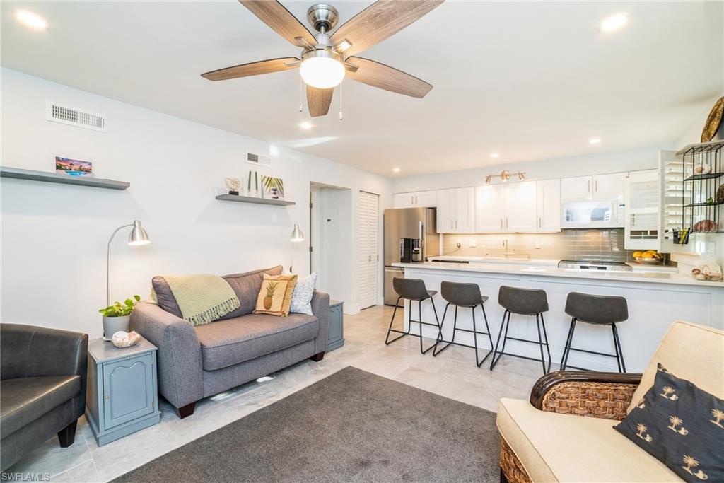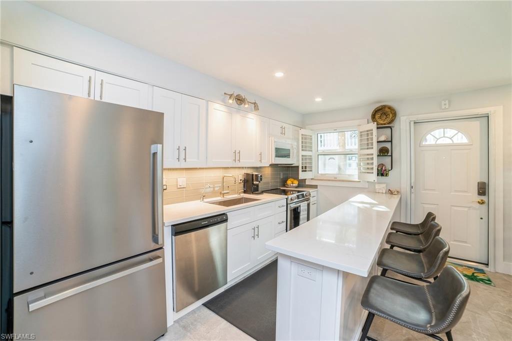 Welcome to an exquisite property nestled in the vibrant city of Naples, offering an unparalleled blend of luxury and convenience. This gated community features exceptional amenities, including a community pool and spa, providing a serene oasis for relaxation. The residence boasts stunning views of Downtown Naples and an inviting outdoor space featuring a grilling area, perfect for entertaining. The interior is thoughtfully renovated with upscale touches such as quartz countertops, an undermounted sink, and sleek new ceramic flooring. The kitchen is equipped with premium stainless steel appliances, complemented by modern cabinets and enhanced by designer lighting and fans. The bathroom showcases a seamless glass shower door, adding to the sense of elegance, while hurricane windows throughout ensure safety and peace of mind. Ample storage is achieved with expertly installed closet organizers. Ideally located, this home offers proximity to the vibrant Naples beaches, pier, lively nightlife, refined restaurants, bustling art district, and the local theater, promising a lifestyle of sophistication and excitement.
