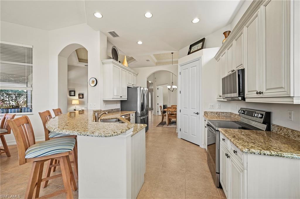 This home feels good the moment you walk in. A bright, open floor plan with oversized windows fills every space with natural light and creates an easy, comfortable flow throughout. Tile flooring, soft white cabinetry, and granite countertops give the home a clean, timeless look that works beautifully with any style. Hurricane impact windows and front door protect the front of the home while the electric hurricane shutters on the rear, offer peace of mind and security. The family room is the heart of the home—cozy yet open, with an impressive wall of windows overlooking the lake and saltwater pool. It’s the space everyone naturally gathers, where everyday moments turn into lasting memories. Architectural ceiling details elevate the home, including tray ceilings in the living and dining rooms and a coffered ceiling in the family room. Step outside to a southern-facing pool and lanai, a highly coveted feature. Enjoy sun on the salt water pool all day, plenty of room for lounge chairs, and a spacious covered lanai that stays shaded—perfect for entertaining or unwinding at the end of the day. The primary suite is a peaceful retreat featuring tray ceilings, two walk-in closets, and a bright, well-appointed bath with double vanities and a soaking tub. A few major updates are already done with a new roof (2021), and new appliances (2024) and impact windows, door and shutters. Offered fully turnkey furnished, this home is ready to be enjoyed from day one.