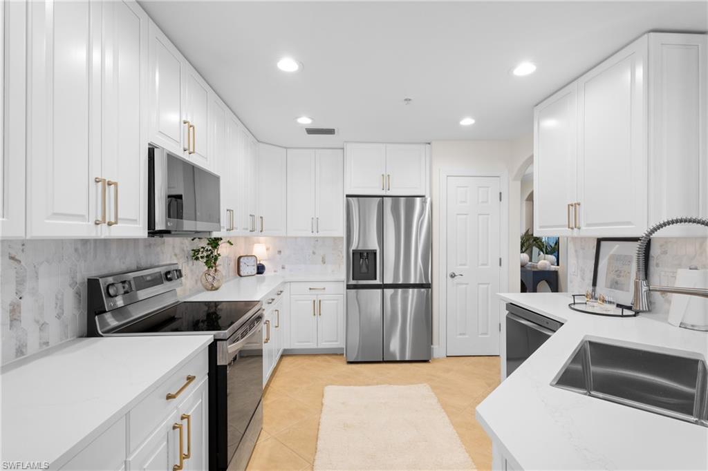 LIVE A VACATION LIFESTYLE IN THE QUARRY! This BETTER THAN NEW first floor end unit coach home features 2 Bedrooms plus Den, 2 Baths, and attached 2 car garage and is situated overlooking the 18th fairway & lake and is just steps away from both clubhouses. Recently renovated from top to bottom, this spacious condo offers a great room style floorplan with two sets of sliding glass doors to the lanai where one can watch the boats go by and enjoy the warm Naples weather. A long list of special features include: BRAND NEW quartz countertops in the kitchen, baths, and laundry room including new sinks; BRAND NEW kitchen tile backsplash; BRAND NEW plantation shutters on all windows; BRAND NEW ceilings fans & bath lighting throughout; FRESHLY PAINTED interior/garage walls and cabinets including NEW cabinet hardware; NEW AC (2022); NEW Stainless Steel Appliances (2023); two walk in showers with frameless shower enclosure in the Master Bath; diagonal tile & engineered hardwood floors throughout (no carpet); and more! Furniture & decor package available! The Quarry is a unique lakefront community offering something for everyone: Boating, Golf, Tennis, Pickleball, Bocce, Tiki Bar, Restaurant, Pool-Side Food/Drink Service, Fitness/health center, Social Activities, and more! The Quarry offers a lifestyle like no other at the BRAND NEW "Lake Lodge & Beach Club", over 500 acres of navigable lakes (boat slips available for lease), and a private 18 hole Golf Club (social/golf memberships 100% optional).
