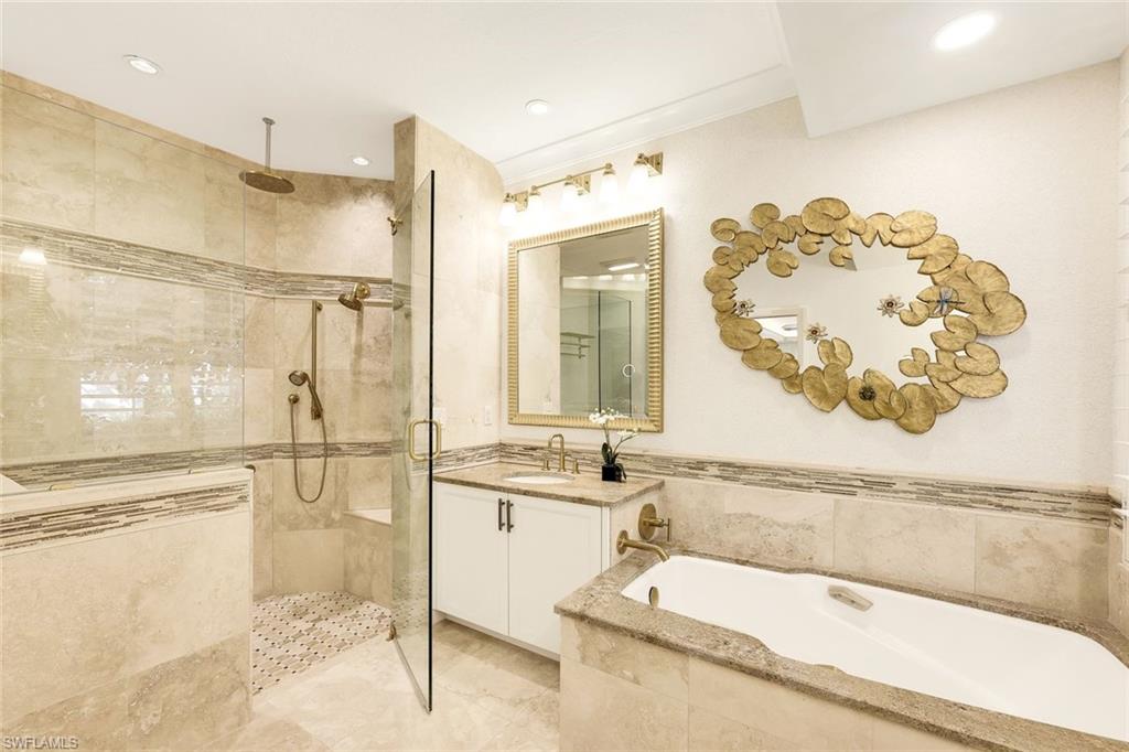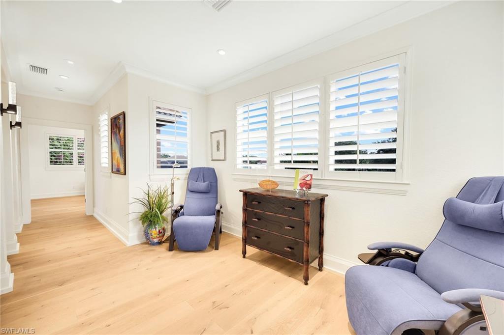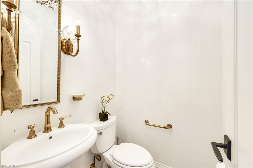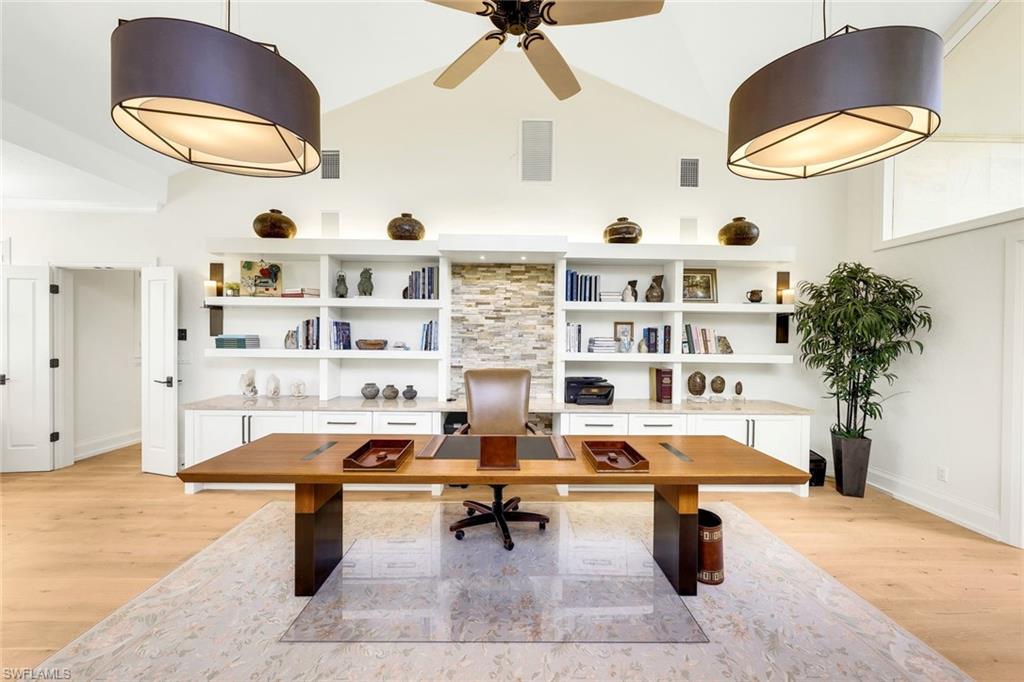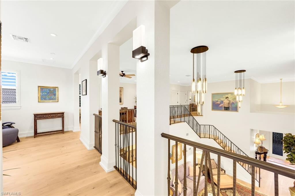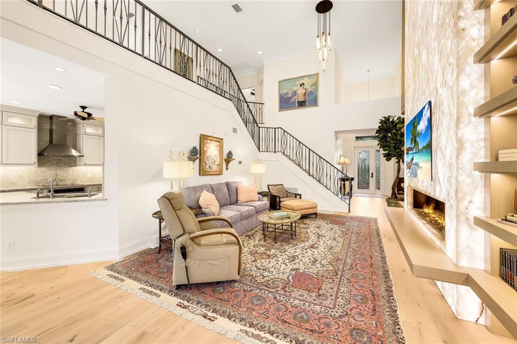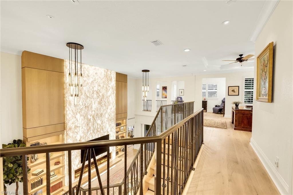 A rare and refined masterpiece nestled within one of North Naples most sought after communities. This extraordinary residence is the result of an inspired vision brought to life through meticulous craftsmanship and uncompromising attention to detail. From the moment you enter, the home makes a striking impression anchored by a dramatic 19 foot, floor-to-ceiling backlit Crystallo Quartz feature wall that serves as a stunning work of art. Soft illumination radiates through the quartz, creating a warm, inviting ambiance that elevates the great room into an unforgettable living experience. At its base, an Aquafire electric fireplace delivers the beauty of dancing flames, adding both drama and serenity. Solid white oak floors flow seamlessly throughout, complemented by custom millwork, refined crown molding, and carefully curated designer lighting most notably the double cut-crystal and bronze Jonathan Browning chandeliers in the Great Room. The kitchen is a true showpiece, featuring premium Taj Mahal quartz countertops, custom cabinetry with illuminated glass display accents, a professional-grade GE Profile appliance suite, double ovens, and a thoughtfully designed pantry. Custom built-in pull-out shelves and hidden slide-out spice organizers further enhance both form and function. Motorized Conrad Grass Shades, among the finest available, adorn the FIRST FLOOR primary bedroom, great room, and breakfast room sliders, providing effortless light control and refined texture. The home’s thoughtful design continues upstairs, where a grand executive office addition offers cathedral ceilings, Apex windows, and extraordinary natural light creating an inspiring space for work, a creative retreat or second master suite. A private elevator, discreetly integrated into the home, ensures effortless access to the second floor and enhances long-term livability. Each Bathroom throughout the home reflect a refined, spa-like aesthetic, showcasing natural stone finishes, custom floating cabinetry, frameless glass showers, elevated designer fixtures, and a Venetian plaster finished powder bath. Recent enhancements bring peace of mind and modern convenience, including a 32kW Generac whole-house generator, a 1,000-gallon propane tank, New tile roof, fresh exterior paint, and an integrated security camera system. Set within the lush, gated surroundings of Autumn Woods, residents enjoy mature landscaping, scenic walking paths, tennis and pickleball courts, resort style community pool, clubhouse amenities, all within close proximity to Naples’ renowned beaches, dining, and shopping offering an unmatched lifestyle of elegance and ease. Rarely does a home of this caliber, craftsmanship, and location become available an extraordinary opportunity to own a timeless masterpiece in the heart of North Naples. Schedule your private tour today!