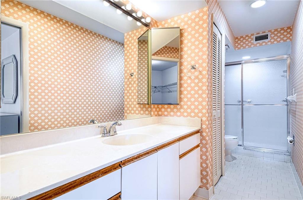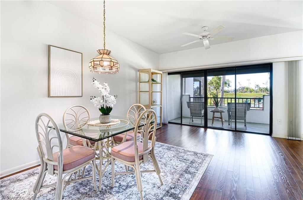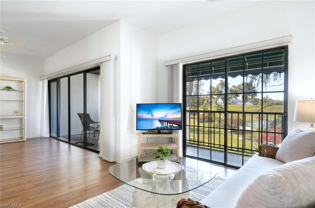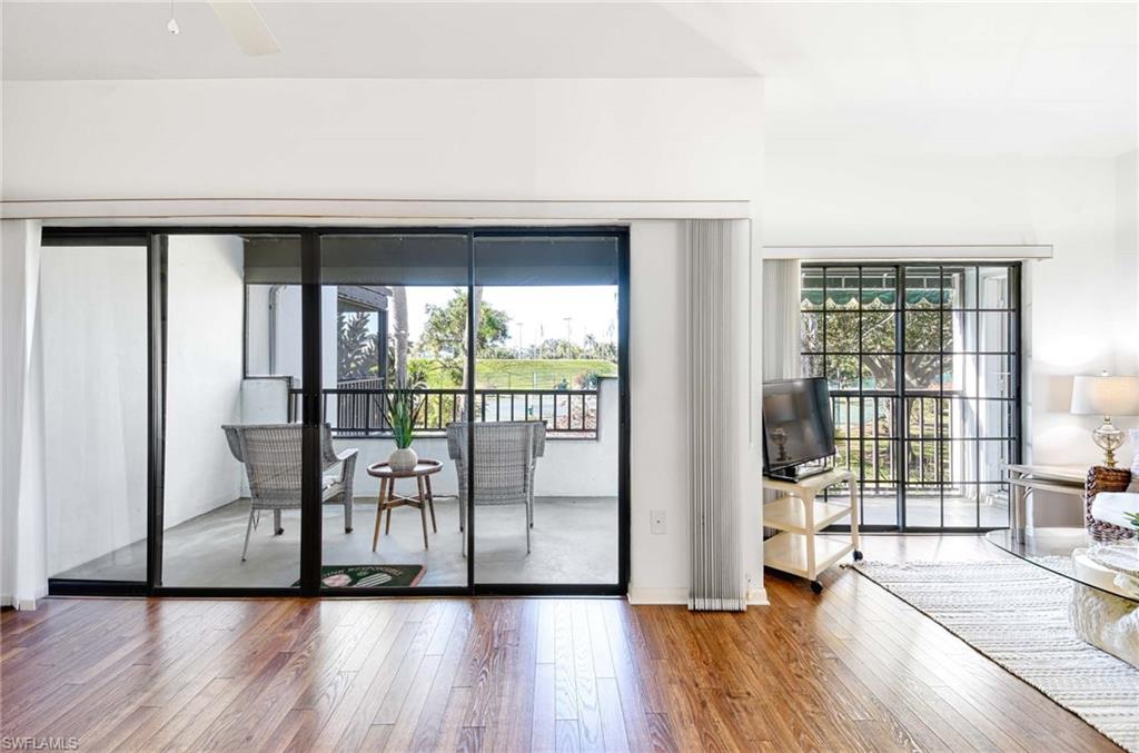 RARELY AVAILABLE! This extra large, 2 bedroom unit is one of only a few in the community and is conveniently located next to the walking path to all of the wonderful amenities. Enjoy the southwest view looking out to the tennis courts from the expansive rear lanai and an assigned parking space just steps from the front door. Wood laminate flooring in the great room and guest bedroom add a warm and charming feel to this top floor, end unit. A full-size laundry room with storage closet sets this unit apart from others in the community. World Tennis Club is a gated community centrally located in North Naples and features 2 community pools, poolside cafe'/bar, 14 tennis courts and 4 pickleball courts with fully staffed pro shop, bocce, basketball play area, saunas and a wonderful social calendar of events. The fees include all of the amenities, including unlimited tennis and pickleball as well as your landscaping, cable, wi-fi, water and sewage. NO INITIATION FEES and NO EXTRA MEMBERSHIP FEES. All-inclusive and in the heart of town, just minutes to Clam Pass Beach Park, Waterside Shops, Mercato, and Old Naples. Walk or bike to the local grocery stores and restaurants and enjoy a home with easy access to I-75, but in a peaceful, quiet and quaint gated community. Can be packaged together with #21, which is located just below. MLS#226000316