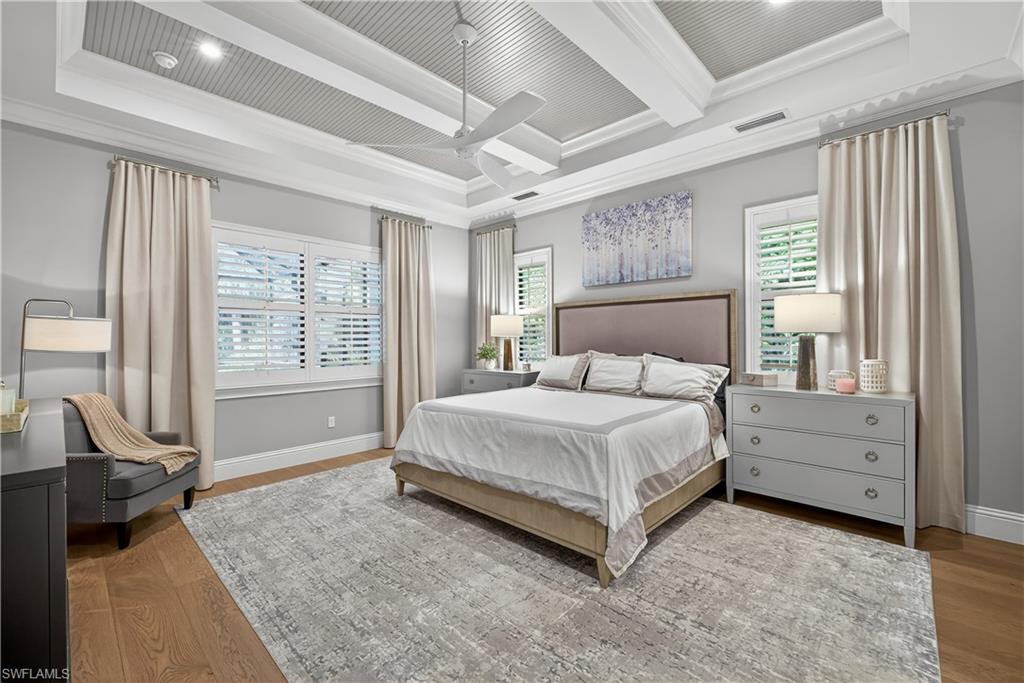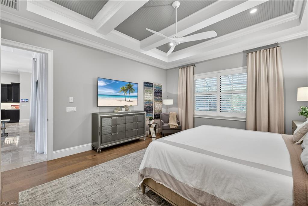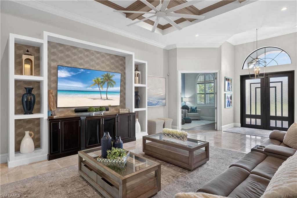 Thoughtfully designed and expertly crafted by the renowned STOCK Development team, this exceptional semi-custom residence reflects the quality and attention to detail the builder is known for. It has been thoughtfully designed and enhanced with over $100,000 in recent improvements (2022), creating a full turnkey opportunity that blends refined design, modern technology, and effortless indoor-outdoor living. The newly furnished interior is complemented by updated designer lighting, freshly painted interior and exterior, and a striking custom iron front door that sets a sophisticated first impression. Inside, the home features engineered oak wood flooring throughout all bedrooms, paired beautifully with natural stone flooring in the main living spaces. A custom-built-in feature wall anchors the great room, enhanced by hidden surround-sound speakers and Lutron lighting controls in the main living areas and primary suite, offering both ambiance and convenience. The gourmet kitchen is elevated with an updated backsplash, generous island seating, and seamless flow to the main living areas—ideal for entertaining. Plantation shutters grace the majority of windows, accented by custom window treatments, providing both elegance and privacy throughout the home. The primary suite delivers a true spa experience, featuring a Moen smart shower system with programmable controls for the rain head, body sprays, handheld, and main shower—bringing luxury and innovation together effortlessly. Outdoor living is equally impressive. The expansive screened lanai showcases a resin tongue-and-groove ceiling, integrated ceiling speakers, and a fully equipped outdoor kitchen with Wolf grill, creating the perfect setting for gatherings. A heated saltwater pool and spa, fire pit pad, and serene private preserve views complete this exceptional outdoor retreat, further enhanced by professionally designed landscape lighting. Additional upgrades include a whole-house Kinetico water softener system, full impact glass and doors, and a three-car garage with additional area for storage, workshop or golf cart. Positioned on the largest and most private lot within this boutique gated community of just 100 homes, this turnkey furnished residence offers both exclusivity and comfort, along with access to community clubhouse amenities. High-speed Xfinity cable and internet are included in the HOA fees, along with access to the community’s clubhouse, resort-style pool, fitness center, and social gathering spaces. Amenities also include a yoga room, playground, and lakeview gathering areas, creating an inviting setting for both wellness and connection. All of this is ideally located just minutes from premier shopping, dining, private and public schools, and Naples’ world-renowned beaches. Experience the perfect blend of sophistication, comfort, and coastal tranquility within one of North Naples’ most private and desirable communities.