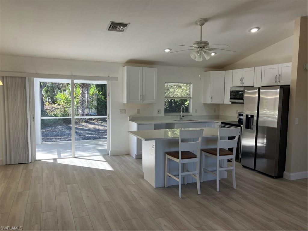 Adorable single family. Open floor plan, new kitchen and new master shower. New flooring throughout. Oversized two car garage, quiet back screened lanai. Laundry room, the living room has a fireplace for those chilly evenings in January.. Great lot with no landscaping. New roof 2019 , New AC 2024 ( under warrantee ). Quiet street for walking and biking. 10 minutes to Barefoot Beach, 15 minutes to RSW Ft Myers Intl Airport. More interior photos to follow, kitchen is waiting for new quartz counter tops to be installed.