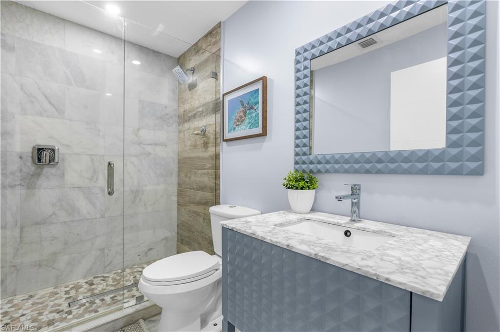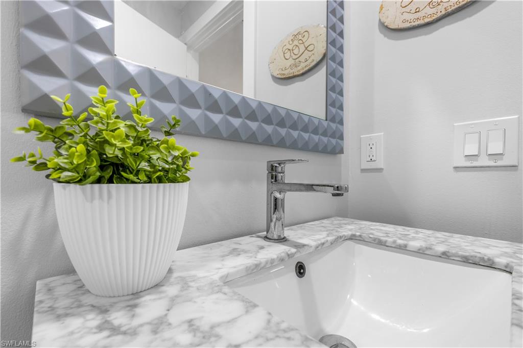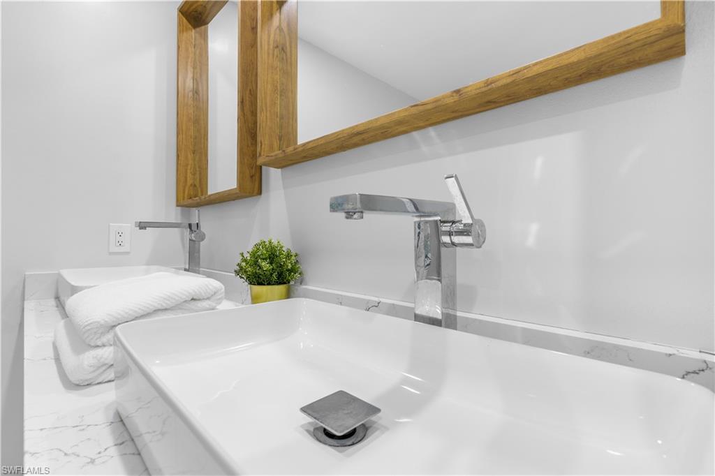 Tucked away in the intimate waterfront community of Henderson Creek Village, this beautifully redesigned residence offers indirect Gulf access and a rare opportunity to enjoy luxury coastal living in a boutique setting of just 20 homes. This fully renovated 2-bedroom, 2-bath single-story villa is rich with upscale finishes and thoughtful details throughout, and includes two deeded parking spaces directly in front of the unit. Residents enjoy access to a heated community pool, convenient boat storage, and a private boat ramp with indirect access to the Gulf—perfect for boating enthusiasts. Inside, the home impresses with a modern European-style kitchen featuring granite countertops, a farmhouse sink, and a spacious center island ideal for entertaining and storage. Porcelain wood-look tile enhances the main living areas, while the primary suite feels like a private retreat with Brazilian teak flooring and custom his-and-hers California closets. Both bathrooms are elegantly appointed with marble finishes, quartz-topped vanities, and a spa-inspired walk-in shower with frameless glass in the primary bath. Impact windows, new interior doors, custom trim, and well-designed storage complete the home. Ideally located within walking distance to shopping and dining, and just six miles from the beaches of Marco Island, this residence delivers the perfect balance of style, convenience, and relaxed waterfront living.