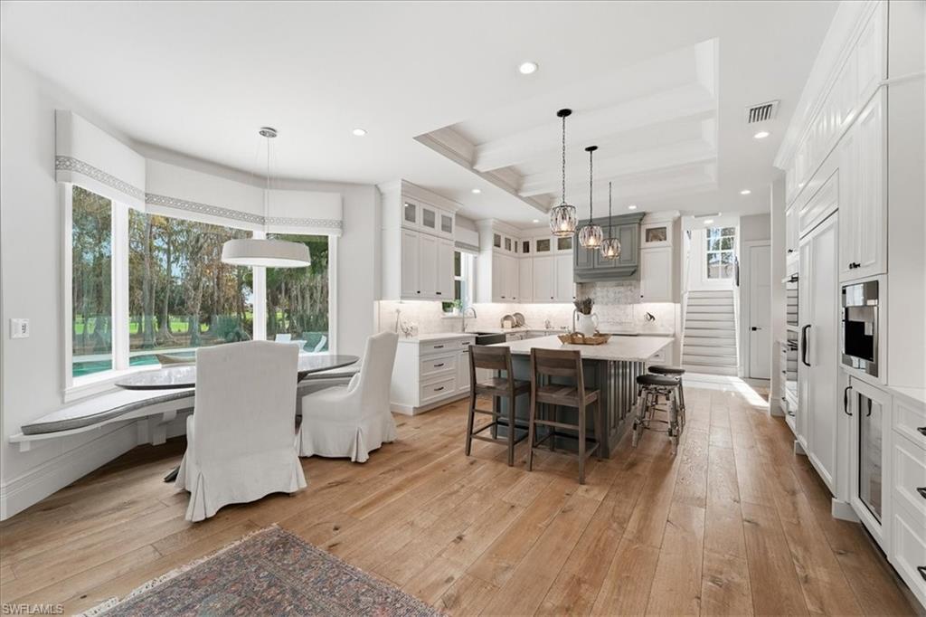 Welcome to 12888 Pond Apple Drive West, a stunning 4-bedroom plus den, 4.5-bath residence that combines timeless architecture with refined interiors, all set within a lush and private oasis. The stately exterior, featuring manicured landscaping, mature palms, and a paver circular driveway, makes an unforgettable first impression. Inside, light-filled living spaces boast soaring ceilings, intricate millwork, and dramatic coffered ceiling designs, exuding elegance and sophistication. The main living area is centered around a striking stone fireplace with custom built-ins, creating a warm yet polished focal point for both everyday living and entertaining. Wide-plank wood flooring flows seamlessly through the main living areas, enhancing the home’s inviting coastal charm. The gourmet kitchen is a chef’s dream, offering custom cabinetry, a spacious center island with seating, premium appliances, and designer lighting. Its open-concept design effortlessly connects to the living and dining areas, making it perfect for hosting gatherings of any size. Expansive windows and sliding glass doors flood the home with natural light and provide serene views of the outdoors. Designed for both comfort and versatility, the home also features an upstairs family room, ideal for additional living or recreational space. Step outside to your private outdoor retreat, where a resort-style pool and spa create the ultimate setting for relaxation and entertaining in true Southwest Florida style. Located in the prestigious Quail Creek community, this home offers access to a gated golf lifestyle with 36 holes of golf, which are set to undergo a complete renovation by 2027. Additionally, estate homes in the community will be updated within the next 24 months, further enhancing the neighborhood’s appeal. Just minutes from world-class shopping, dining, beaches, and top-rated schools, this residence delivers the perfect balance of luxury, privacy, and convenience.