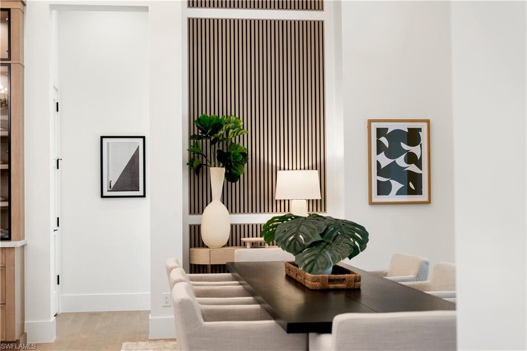 Just completed custom estate set on an expansive approx. 0.69-acre homesite within the gated enclave of Naples Club Estates, directly adjacent to Naples National Golf Course. Preserved views and exceptional privacy offer estate-level scale rarely found this close to Naples’ beaches and downtown. The thoughtfully designed single-story residence offers nearly 9,700 sq ft of total living space, featuring 5 bedrooms arranged in a well-defined layout that balances openness with privacy. Interiors are finished with wide-plank Legno Bastone European French Oak flooring, soaring ceilings with custom beam detailing, refined millwork, and a cohesive designer palette throughout. Living spaces are thoughtfully delineated rather than fully open, creating a sense of architectural structure while maintaining seamless flow to the outdoor areas. The designer kitchen is a standout, featuring custom wood cabinetry with reeded detailing, glass-front display uppers, and integrated lighting. A waterfall Perla Venata quartzite island and matching countertops,, anchor the space and pair beautifully with a walk-through pantry for optimal function. The professional appliance suite includes Sub-Zero refrigeration and wine storage, Wolf induction cooking and wall ovens.. A built-in wet bar with stone surfaces, beverage refrigeration, and wine storage enhances entertaining while maintaining a tailored, architectural aesthetic.The primary suite is a serene retreat with tranquil preserve views and direct lanai access. Architectural wall detailing, layered lighting, and generous proportions create a calm, refined atmosphere. The spa-inspired primary bath features a freestanding soaking tub, oversized glass-enclosed shower with dual rain heads and hand shower, large-format stone and porcelain tile, custom dual vanities with stone countertops, & custom closets. Additional en-suite bedrooms are generously sized, each offering private baths finished with custom cabinetry, stone surfaces, & curated tile selections. providing comfort and privacy for family and guests. Outdoor living is a true resort-style experience, with a large screen-enclosed pool and spa featuring illuminated water elements and a dramatic linear fire feature. The covered lanai includes a fireplace, fully equipped outdoor kitchen, dedicated bar area, pool bath, and outdoor shower, with multiple lounge zones for dining, entertaining, and relaxation surrounded by tranquil preserve. Built by Forge Construction to increadible standards, the home includes impact-rated windows and doors, smart-home integration, dual-zone HVAC with dehumidification, tankless gas water heaters, a whole-house generator prep, and premium materials throughout. Naples Club Estates is prized for gated privacy, estate-sized homesites, and preserved natural surroundings, offering a rare blend of exclusivity and convenience in one of Naples’ most discreet luxury communities.