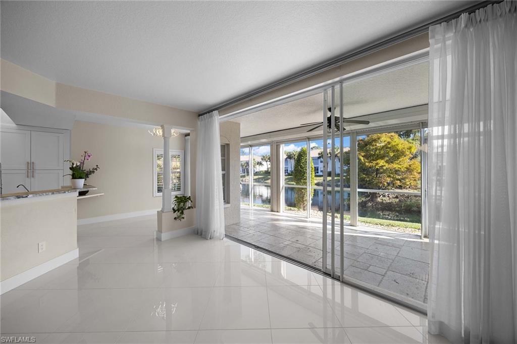 Perfectly positioned on a quiet interior street within the gated community of Calusa Bay in North Naples, this reimagined lakefront, end-unit coach home offers privacy, walkability, and a true lock-and-leave lifestyle. One of the few residences with an attached two-car garage, it is ideal for seasonal or full-time living. Completely renovated and move-in ready, the home features elegant tile flooring throughout, sleek ceiling fans and lighting, and updated interior doors and hardware for a clean, modern coastal feel. The open living area flows to a large screened lanai with electric storm shutters, overlooking peaceful lake and water-feature views. Calusa Bay is pet friendly, allowing up to two small dogs, and the home offers abundant interior storage, unusual for a condominium. As an end unit, additional windows enhance natural light and privacy. Residents enjoy a clubhouse, pool with lap lanes and spa, sundeck and pier, fitness center, two lighted Har-Tru tennis courts, on-site management, and an active social calendar. With two gated entrances and close proximity to beaches, shopping, dining, cultural venues, and excellent schools, this home offers effortless Naples living.