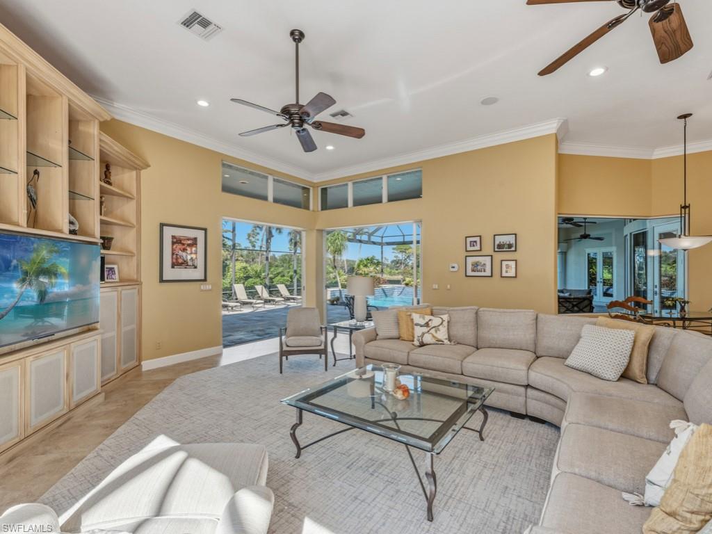 Welcome to this beautifully updated estate home in Ridge at Pelican Landing, a rarely available, highly sought after section of Pelican Landing. Truly one of a kind, this home offers over 4,900 sq ft of air-conditioned living space and more than 10,000 sq ft including the lanai and 3-car garage. Ideally positioned to showcase breathtaking sunset views over the lake and golf course, this stunning residence features 4 bedrooms plus a den and 5 full bathrooms. Designed for seamless indoor-outdoor living, grand sliders open to an expansive screened lanai with covered lounging and dining areas, a fully equipped outdoor kitchen, bar, and a private pool and spa. Inside, volume ceilings, bright natural light, and an elegant French door entry set the tone. The renovated chef’s kitchen includes an island, pantry, stainless steel appliances, a Sub-Zero refrigerator, and a custom dry bar with wine cooler and built-in desk. The spacious primary suite is a true sanctuary with a sitting area, outdoor access, a walk-in closet, and a spa-inspired bath with dual vanities, soaking tub, and walk-in shower. All guest bedrooms have en-suite baths, including a private upstairs suite ideal for guests. A versatile den currently serves as a home office. Extensively improved, the home features a newer roof (2017), pool cage, gutters, A/C handlers, a whole house generator, 500 gallon propane tank, solar panels, and newer water heaters. Pelican Landing offers an impressive range of amenities, including a top-notch tennis program, a private beach park accessible by water taxi, scenic kayaking and canoeing on Spring Creek, a lively community center, a state-of-the-art fitness center, sailing, bocce, pickleball courts, and miles of scenic walking and biking trails. Golf enthusiasts can also take advantage of membership opportunities at The Nest Golf Club. Enjoy effortless access to Naples, Southwest Florida International Airport, Coconut Point, Miromar Outlets, and the pristine Gulf of Mexico beaches. This is a rare opportunity to own a meticulously maintained, move-in ready home in one of Pelican Landing’s most desirable enclaves.