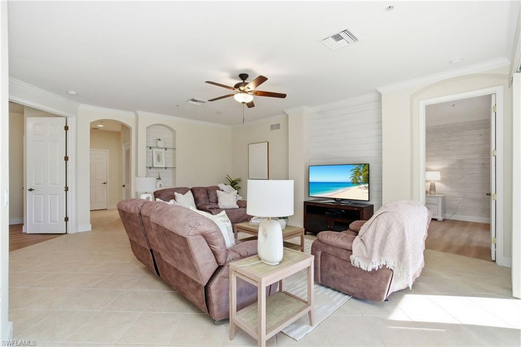 Welcome to this beautifully upgraded end-unit condo in the highly desirable Chesapeake Cove of Hawthorne, offering privacy, functionality, and turnkey convenience. Being sold furnished, this 3-bedroom, 2-bath residence with a 2-car garage is truly move-in ready and thoughtfully enhanced throughout. The open living space is warm and inviting, highlighted by luxury vinyl plank flooring throughout—no carpet anywhere, fresh interior paint (2025), shiplap accent walls in the family room, elegant crown molding, custom window trim, and wide baseboards that add a polished, upscale feel. The kitchen blends style and practicality with stainless steel appliances, a new electric cook stove (2024), under-cabinet lighting, a beadboard accent wall, and the added convenience of instant hot water at the kitchen sink. A great split floor plan provides three true bedrooms, offering privacy for both owners and guests. The primary suite is a relaxing retreat featuring a shiplap accent wall, a recoated bathtub, and a new shower surround with a raindrop glass shower door. Additional interior highlights include a large storage closet for everyday organization. Step out to the screened lanai, upgraded with new screens in 2025, tile flooring, and automatic hurricane shutters. The home also features whole-house hurricane protection, with automatic shutters on the lanai and accordion shutters elsewhere installed around 2023, along with radon mitigation and a new HVAC system installed in 2022 for added peace of mind. The oversized 2-car garage is a standout, featuring an amazing and highly functional built-in workshop, ideal for hobbies, projects, or additional storage. Ideally located just minutes from Naples’ finest amenities, this home offers easy access to white sand beaches, public and private golf courses, upscale shopping, renowned dining, and everyday conveniences. Residents of Hawthorne enjoy an impressive amenity package including two resort-style pools, a clubhouse, fitness center, and tennis courts, creating a vibrant, active community lifestyle. This meticulously maintained end unit combines comfort, quality upgrades, and low-maintenance living in one of the area’s most sought-after communities—a rare opportunity to own a furnished, move-in-ready condo near everything Naples has to offer.