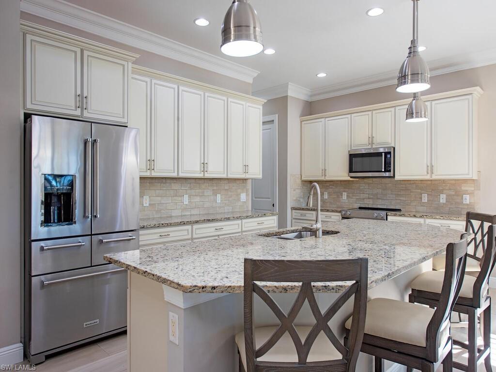 Welcome to your own slice of lakefront paradise in this casually elegant home, perfectly positioned at the center of a wide lake for front-row views of radiant western sunsets. Step outside to the screened lanai—an inviting space for morning coffee, sun-soaked afternoons by the pool, or unwinding in the spa as the day comes to a close. The outdoor kitchen makes it easy to host casual dinners while enjoying peaceful water views. Inside, a welcoming foyer with a wood plank ceiling leads into a bright, open-concept Heron floor plan designed for easy living and effortless entertaining. The spacious great room features a custom trim coffer-detail ceiling and a shiplap accent wall, creating a warm and welcoming focal point. It flows naturally into the dining area and a light, inviting kitchen with a large center island, newer KitchenAid appliances (2023), white wood cabinetry, granite countertops, and a stylish tile backsplash—perfect for everything from weeknight meals to weekend get-togethers. With 2,258 square feet of thoughtfully laid-out space, the home includes two guest bedrooms, a flexible den, and a relaxing primary suite with lake views. The primary suite features a paneled accent wall with integrated mirrors and pendant lighting, a large walk-in closet, and a well-appointed ensuite bath. Additional highlights include porcelain tile throughout the main living areas, LVP flooring in the bedrooms, double crown molding, a custom trim coffer detail ceiling in the den, plantation shutters, decorator lighting and ceiling fans, newer washer and dryer (2024), and a new water heater (2025). Impact windows and doors make storm prep simple, while the finished garage includes PVC tile flooring, an EV charger, and attic access with drop-down stairs and plywood flooring for extra storage. Whether you’re entertaining friends, enjoying a lazy pool day, or catching another beautiful sunset, this home makes everyday living feel easy, comfortable, and unmistakably Naples. Raffia Preserve offers the perfect blend of resort-style living and everyday convenience in the heart of North Naples. This gated community features a clubhouse, sparkling pool with lap lanes, fitness center, playground, and basketball court; all with low HOA fees and no CDD. Just minutes from top-rated schools, shopping, dining, and only 15 minutes to the white sands of Vanderbilt Beach. Raffia Preserve puts everyday conveniences and beach days well within reach.