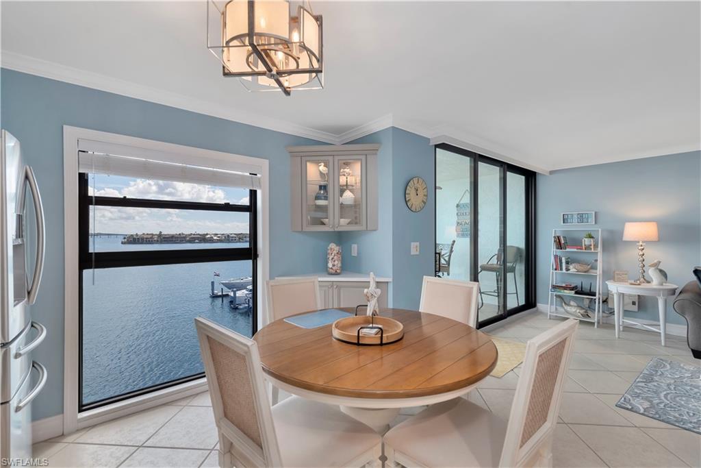 Gorgeous views from this updated 1 bedroom, 1 bath, top floor condo in highly desired A building. Sit on your lanai that captures big views of the Marco River leading into the Gulf of America in just minutes and watch the boats go by. Amenities are endless; on site Marina with boat slips available for lease only $600 per year. Tennis / pickleball courts, 2 pools and hot tubs, fishing pier,new community clubhouse at marina that is on site, and close proximity to restaurants and shopping. This updated coastal condo is the perfect getaway or investment with electric included in monthly fees. This complex also allows nightly, weekly ,and monthly rentals. New updated lanai railings and screens, A/C updated in 2017, hot Water Heater updated in 2021, gorgeous quartz countertops, sinks and faucets updated in 2021. All lighting and switch plate and outlet covers updated in 2021. All windows replaced in 2022 that are hurricane impact for maximum protection. Newer SS Appliances, and stove in 2021. New glass/screen door at the entrance added in 2021 along with Washer/Dryer hook-up in condo. This turnkey unit in this gated community is a prime location for you're next home