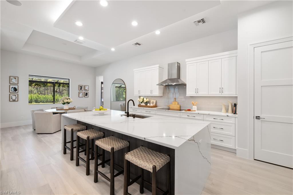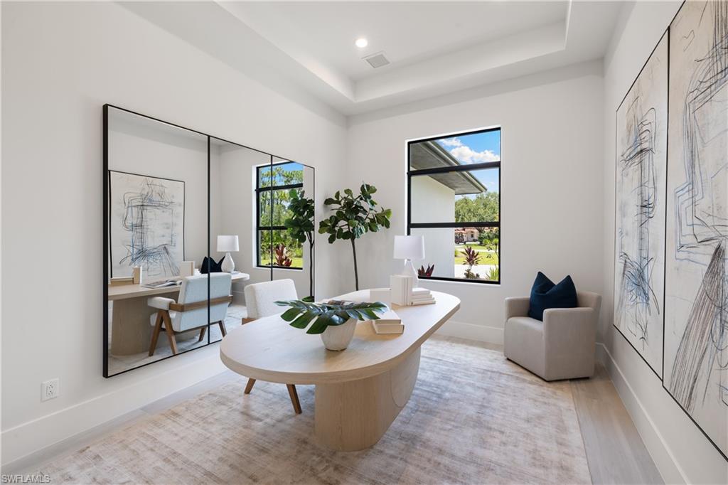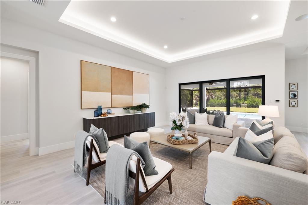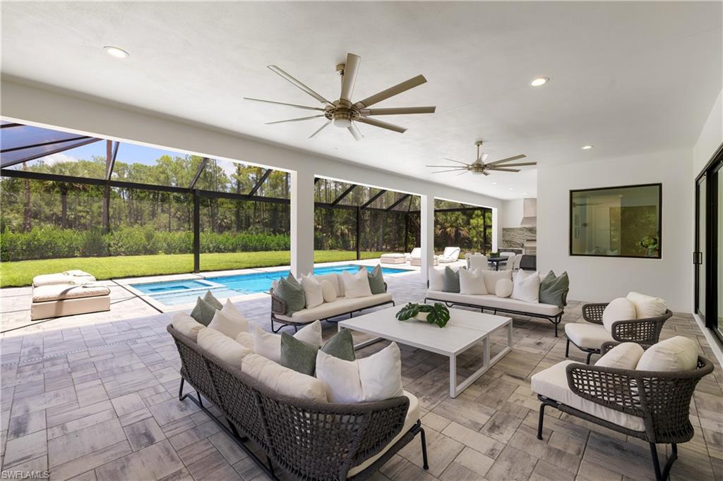 Welcome to this exceptional new construction residence by Forge Construction, set on a serene and private 3.07-acre homesite in an X Flood Zone with 100% UPLANDS west of 951. Designed for both refined living and future flexibility, the expansive property offers ample room for a pickleball court, additional garage, guest cottage, or barn. The thoughtfully designed interior features four bedrooms, a dedicated office, three full baths, and a convenient pool bath. At the heart of the home, the gourmet kitchen is equipped with Thermador appliances including an induction cooktop, custom built-in cabinetry, a walk-in pantry, and sleek quartz countertops. Open-concept living spaces flow seamlessly to the screened, fully automated saltwater pool and spa, complete with Pentair equipment and lighting, an outdoor shower, and a built-in summer kitchen ideal for effortless outdoor entertaining. The primary suite opens directly to the pool and offers generous walk-in closets and a spa-inspired bath with dual vanities, a walk-in shower, and a freestanding soaking tub accented by elegant coastal tile. Additional highlights include a whole-home reverse osmosis system, PGT aluminum impact windows and sliders, a three-car epoxy-finished garage, programmable exterior lighting, and a state-of-the-art audio, video, and security system with Sonos integration. Constructed to current standards, this residence delivers exceptional craftsmanship, comfort, and peace of mind. Ideally located west of Collier Boulevard between Vanderbilt Beach Road and Pine Ridge Road, this private retreat is zoned for highly sought-after A-rated schools and offers the rare combination of acreage, tranquility, and convenient access to Naples’ beaches, dining, and lifestyle destinations.