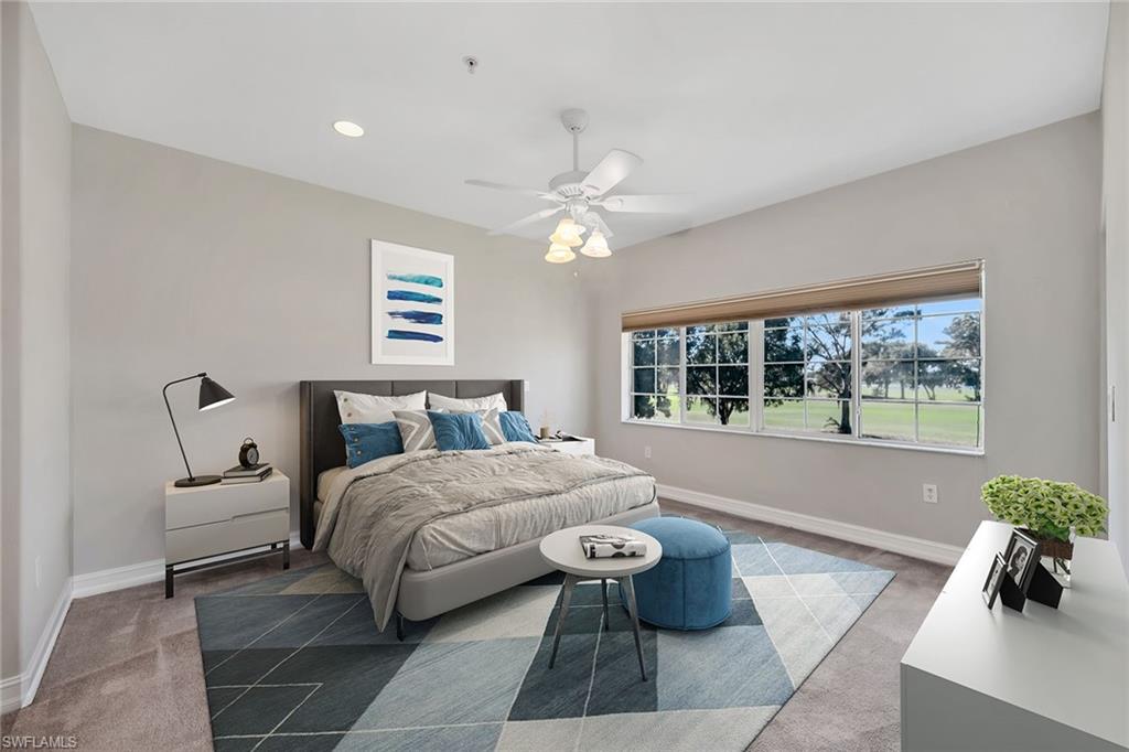 Privately positioned with tranquil lake and golf course views and desirable western exposure, this second-floor residence offers a peaceful retreat in Peridot at Sunstone on the Fairways in Lely Resort. The thoughtfully designed floor plan includes two bedrooms plus a versatile den or flex space, two baths and one assigned car space, delivering comfort, functionality and flexibility. Enjoy serene surroundings and beautiful sunsets from a quiet setting in one of Lely's desirable golfside communities. Inside, recessed lighting enhances the bright and inviting interior, while diagonal tile flooring flows throughout the main living areas. The kitchen features a convenient bar counter with a pass-through window to the living room, white appliances including a dishwasher, range, microwave and refrigerator with icemaker, a pantry and a charming breakfast area set by a window. The living room offers sliding glass door access to the screened lanai, framing peaceful lake views. The covered, screened lanai provides an inviting outdoor living space with relaxing views of the lake and golf course. The spacious primary suite enjoys lanai access along with lake and golf course views and is complemented by two walk-in closets with wooden shelving. The en-suite bath is well-appointed with dual sink vanities featuring full-width mirrors, a walk-in shower with niche and glass enclosure, and a separate soaking tub. The guest bedroom is conveniently near a full bath with a tub and shower combination, niche, and glass enclosure. A den with pocket doors functions ideally as a study or home office, while the dedicated laundry room includes a GE top-load washer and GE front-load dryer. Storm protection with shutters adds peace of mind. Residents enjoy access to a private community pool and spa, along with required membership to The Players Club and Spa, offering three resort-style pools, a full-service spa, state-of-the-art fitness center with classes and instructors, bocce, tennis and pickleball courts, two restaurants, a dog park and an expanded tiki bar. Two nearby public golf courses further enhance the lifestyle, completing the exceptional Lely Resort experience.