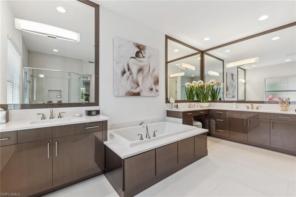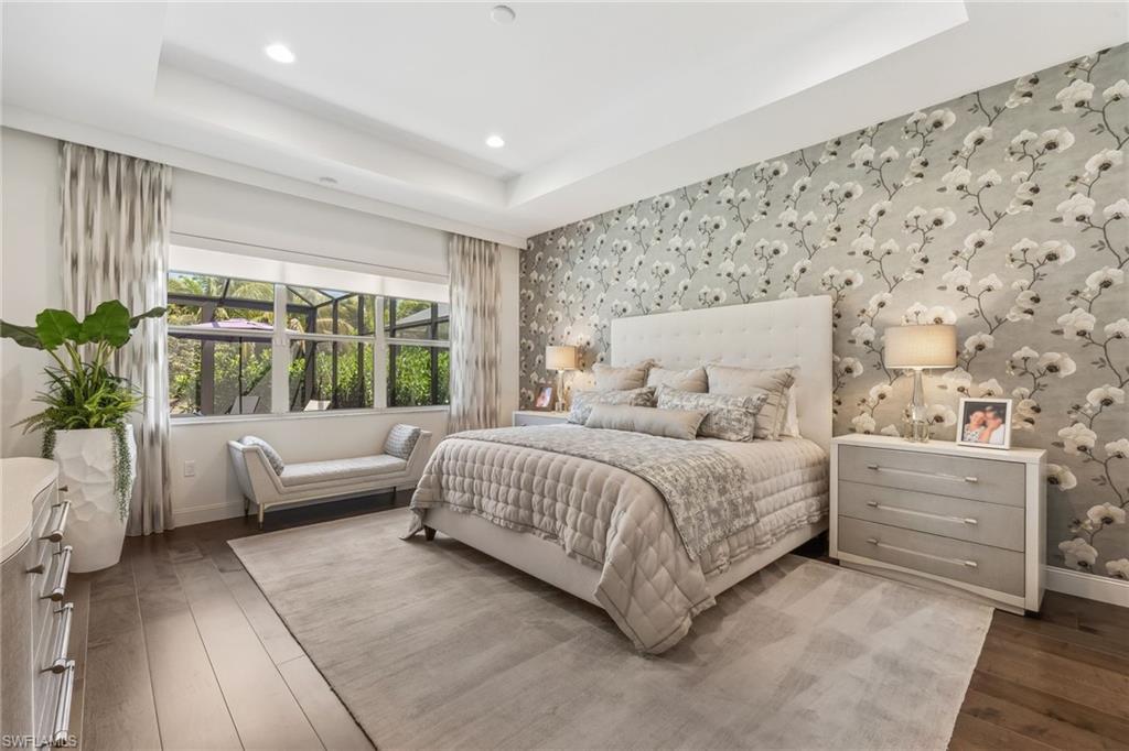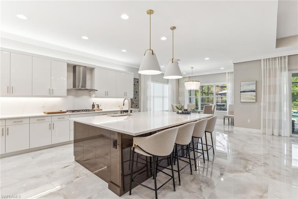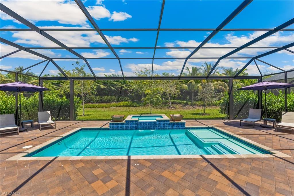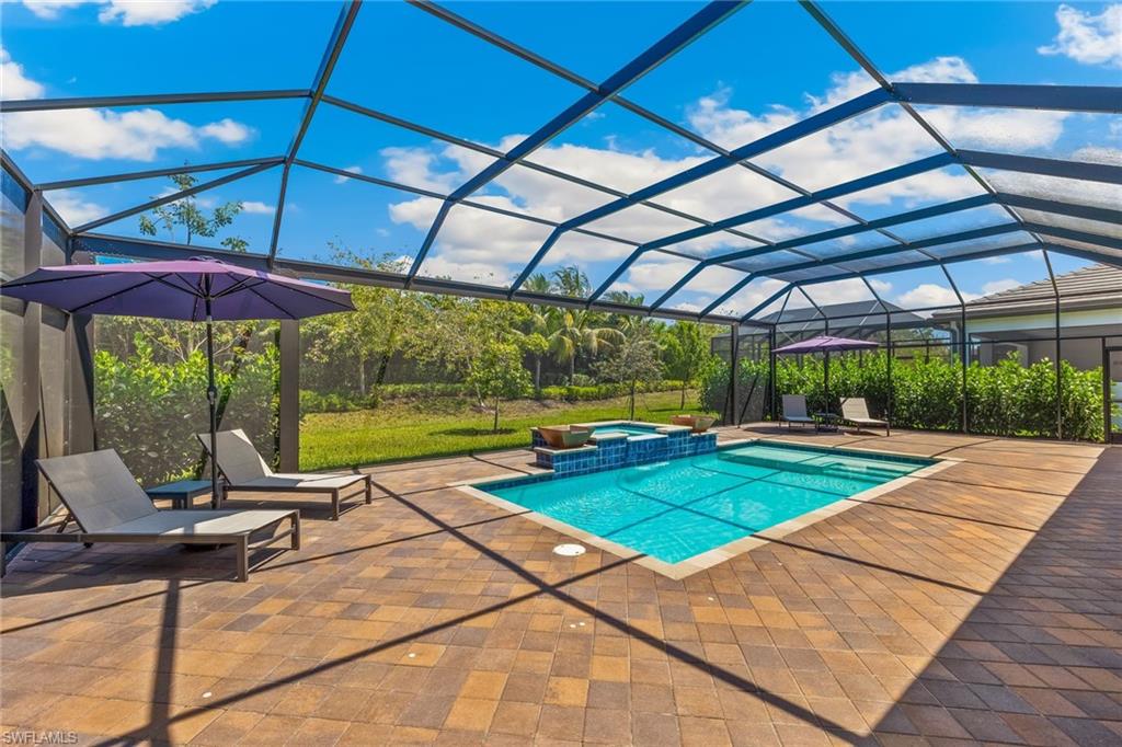 Welcome to an exquisite "Sanibel" model in the highly coveted Valencia Trails community of Naples. This 3-bedroom plus den, 3-bathroom stunning home features a thoughtfully crafted open floor plan, soaring ceilings, and custom luxury finishes throughout with no carpeting in sight, offered furnished and ready for immediate enjoyment! The chef inspired kitchen stuns with quartz countertops, a massive entertaining island, stainless steel appliances including a gas cooktop, wall oven, a wine refrigerator, and top of the line cabinetry tailored for both beauty and functionality. The spa-like owner's suite is your private sanctuary, offering dual vanities, a soaking tub, an impressive glass walk-in shower, and exceptional natural light. Curated interiors are furnished with pieces from Robb & Stucky and Clive Daniel, elevating each room with comfort and style. Step outside to your private oasis featuring an extended screened lanai, fully equipped summer kitchen, and a sparkling saltwater pool and spa, perfect for relaxing or entertaining. Included are storm smart hurricane screens. Living in Valencia Trails means world-class amenities at your doorstep: a 43,000 sq ft clubhouse, resort-style and lap pools, shaded cabanas, a poolside restaurant and bar, state-of-the-art fitness center, and courts for tennis, pickleball, and bocce. Scenic walking and biking trails meander through lush, tropical landscaping for the ultimate in active adult living. don't miss this rare opportunity to own a move-in ready, furnished, luxury retreat in one of Naples' premier active lifestyle communities.