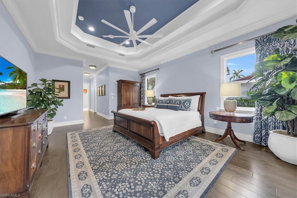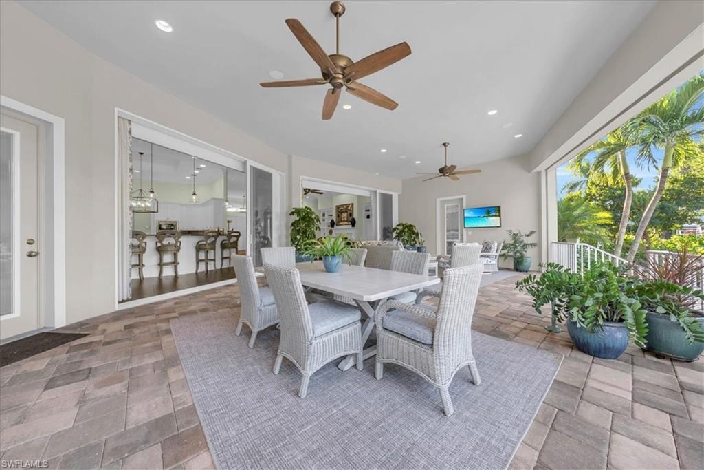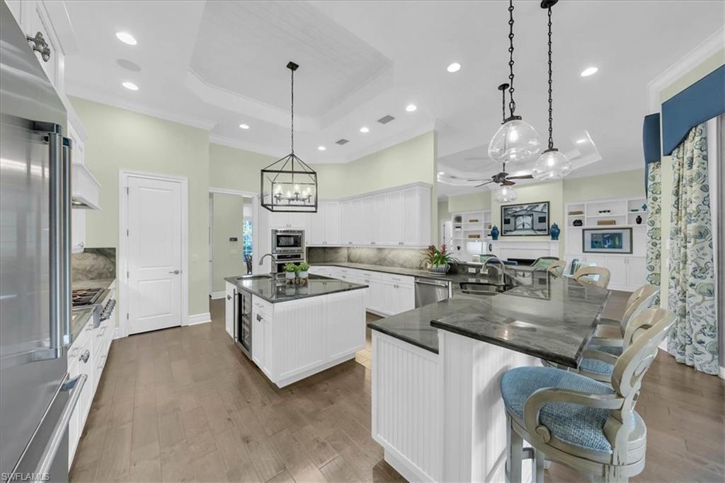Nestled on one of the Moorings most prestigious streets, step inside 455 Bow Line Dr where timeless sophistication meets modern coastal living. This impeccably custom designed 3 Bedroom + Den, 3 and a half Bath residence delivers an effortless luxury. Rich wood floors, tray ceilings, and a well-designed open floor plan creates a flow for both everyday living and entertaining. The chef’s kitchen features premium Thermador appliances, including a French-door refrigerator, triple combination oven, and built-in wine cooler, complemented by formal and casual dining spaces. With ease of indoor/outdoor living, enjoy your private outdoor retreat with covered expansive lanai, resort-style saltwater pool, outdoor kitchen, and lush custom landscaping. Additional highlights include a Control4 Smart Home system, TV lift, electric roll-down screen with hurricane shutter, upgraded lighting, and extensive enhancements throughout. Built in 2015, this home showcases quality craftsmanship and modern efficiency. Enjoy optional private Moorings beach access and a prime location just minutes from world-class dining, shopping, and Naples’ iconic white-sand beaches. A short stroll or bike ride takes you to the Gulf, passing beneath a picturesque canopy of mature banyan trees—one of the Moorings’ most beautiful and sought-after streets.