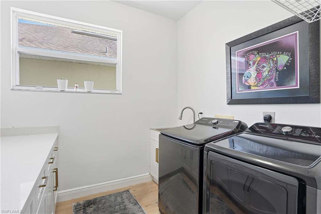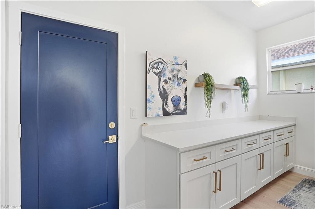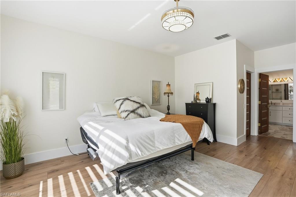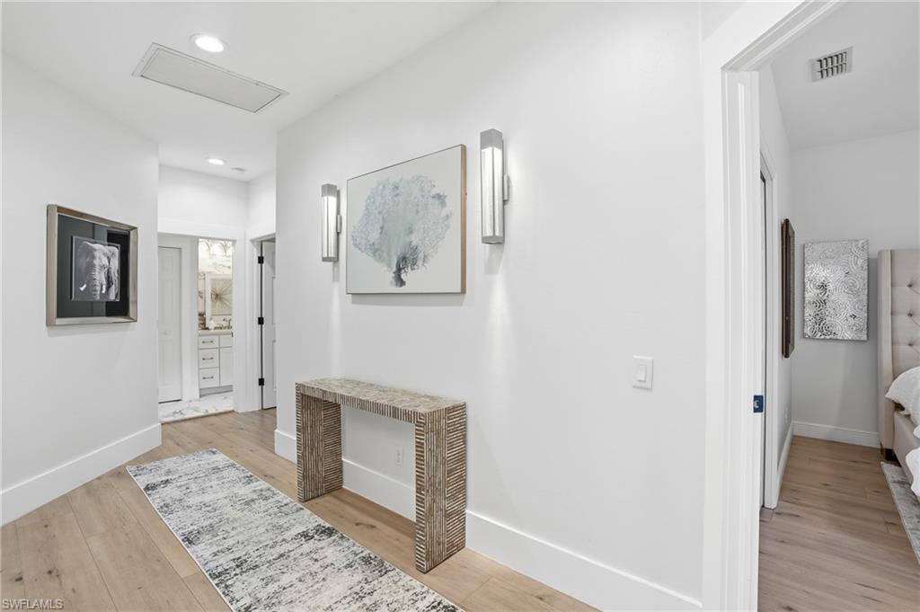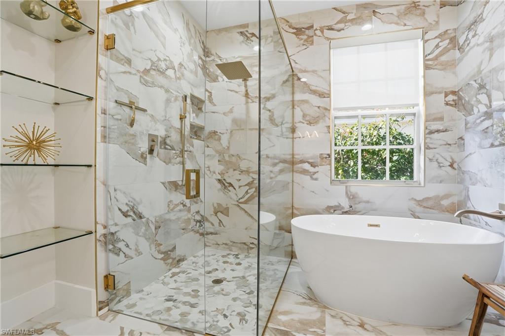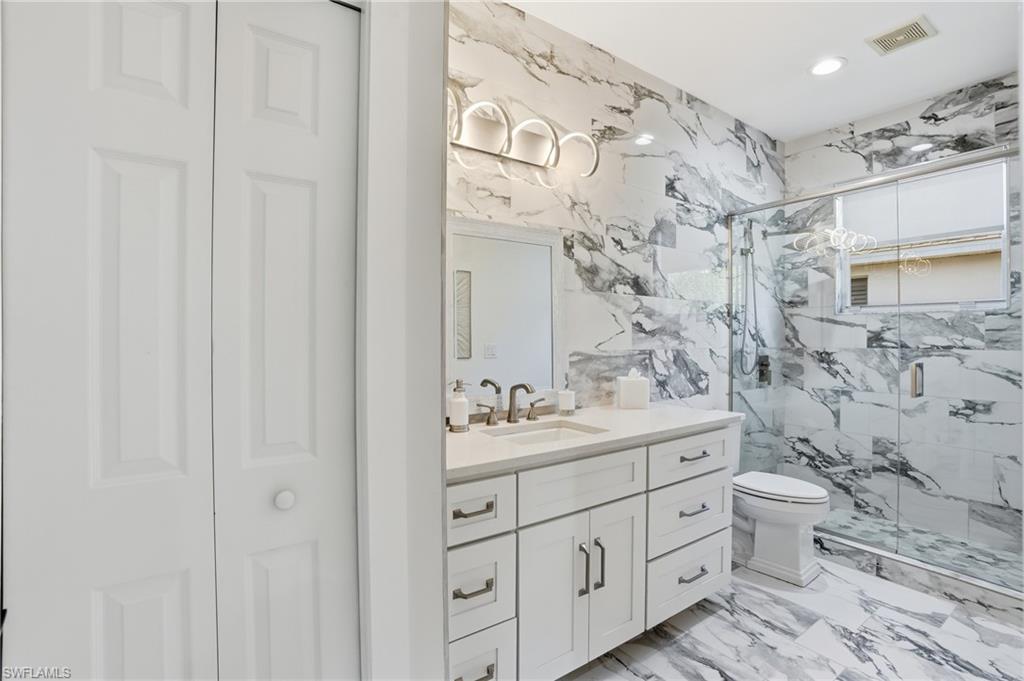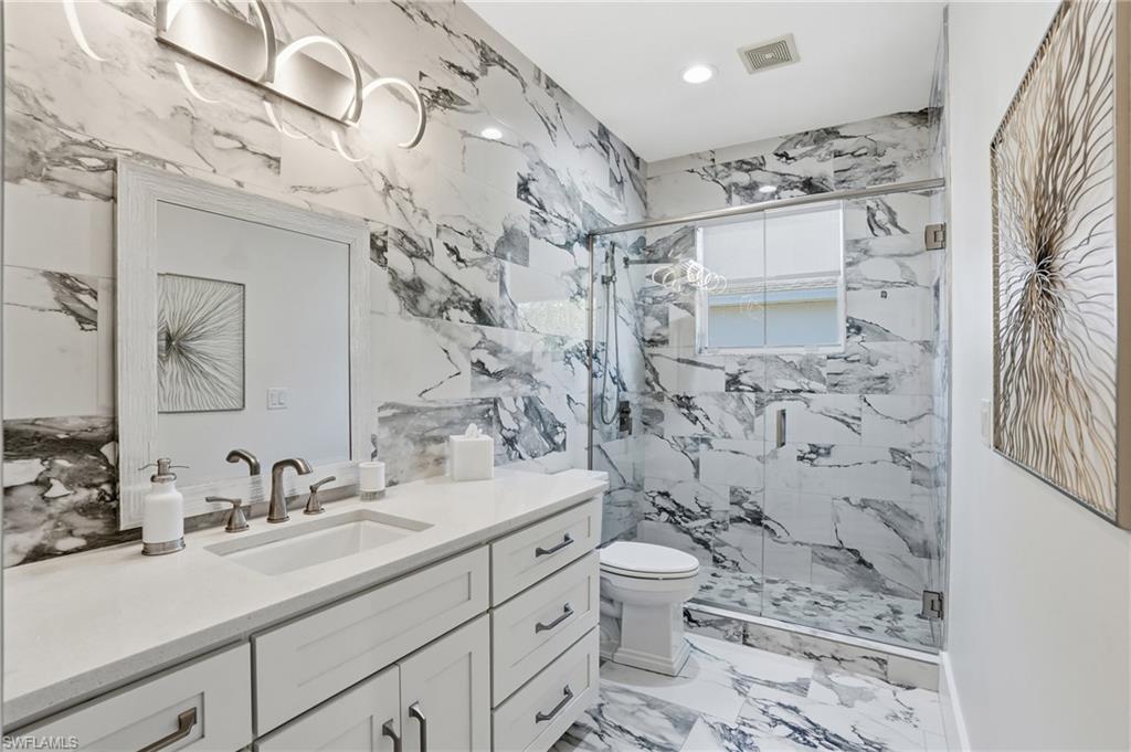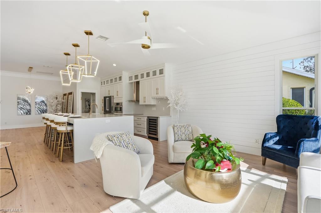 Set against panoramic lake and preserve views, this beautifully updated Marsh Landing home delivers the kind of tranquil, private setting buyers crave—paired with a modern interior made for everyday comfort and effortless entertaining. This home was thoughtfully reconfigured into a spacious 3-bedroom, 2-bath layout with larger bedrooms and an airy, open feel. You’ll love the light oak laminated wood flooring throughout the living areas and bedrooms, volume ceilings, and the inviting great room that flows into a showstopping kitchen featuring a huge quartz waterfall island, Bosch appliances with built-in microwave/oven, electric cooktop, wine cooler and custom cabinetry with imported Italian hardware—all accented by elegant, updated designer LED lighting. The owner’s suite is a true retreat with a walk-in closet, his-and-her vanities, and a spa-like bath with a freestanding soaking tub and enclosed shower. A pocket door creates privacy for the guest wing, where two generously sized bedrooms and modern updated guest bath are complemented by a wide hallway—perfect for a library or computer desk. Outside, enjoy an extended lanai with peaceful long lake views and birdwatching, plus charming touches like shiplap accent wall and french doors—and there’s plenty of room to add a pool if you wish. Practical upgrades add serious value: new roof (2019), new water heater (2020), new A/C (2024), water filtration system, and a generator hookup at the electrical panel. Plus, the home has an oversized 2.5-car garage with epoxy floor and a huge laundry area with nearly new Samsung washer/dryer with utility sink, and you have a home that truly checks every box. Marsh Landing residents enjoy tennis, pickleball, bocce, exercise room, and a heated resort-style pool and spa, all in an unbeatable location near Coconut Point’s shopping and dining, and just a quick drive to area beaches.