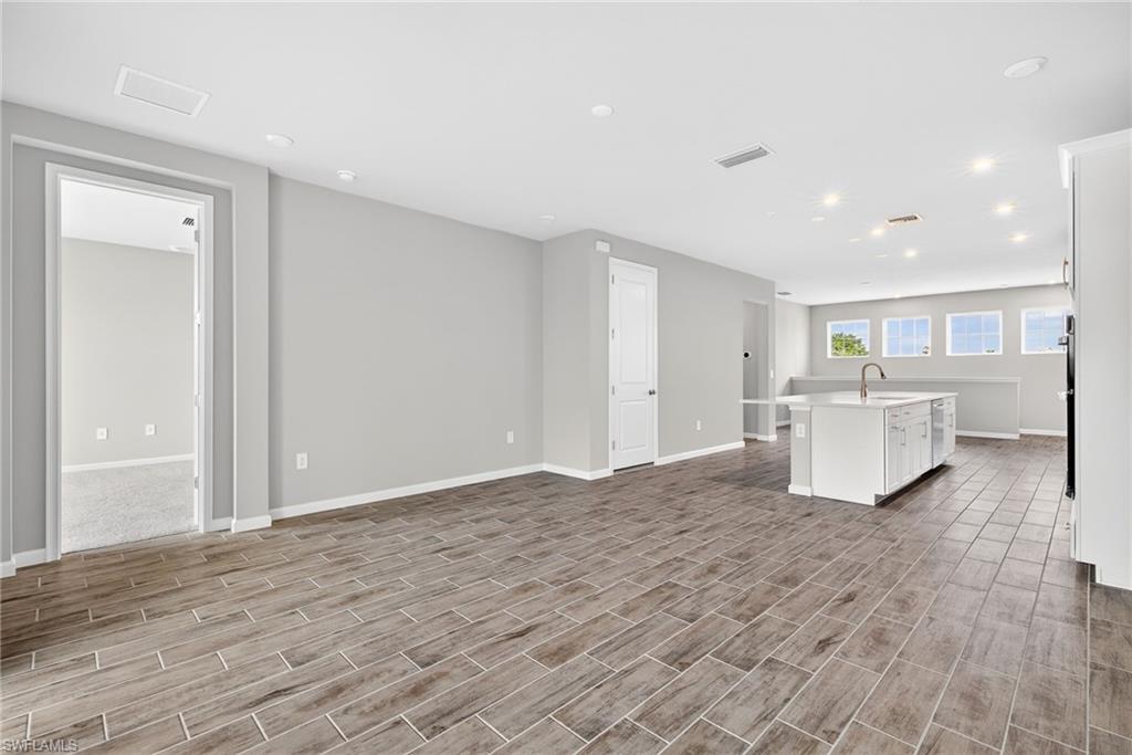 This bright and airy second-floor coach home offers 1,480 sq. ft. of thoughtfully designed living space, featuring 2 bedrooms, 2 baths, a 1-car garage, and a screened lanai. The open layout is ideal for both everyday living and entertaining, with a dining area that flows seamlessly into the kitchen. The kitchen showcases white quartz countertops with subtle gray veining, a glass tile backsplash, 42" white cabinetry, and a spacious island with seating for 5–6. Gray tile flooring runs throughout the main living areas, with carpeted bedrooms and staircase. Three large windows over the staircase and expansive sliders in the great room fill the home with natural light. The second bedroom includes its own private balcony—perfect for morning coffee or evening relaxation. Additional highlights include smart home features such as a video doorbell, touchscreen keypad, and an Ecobee smart thermostat compatible with Alexa. Conveniently located near shopping, dining, recreation, beaches, and schools.