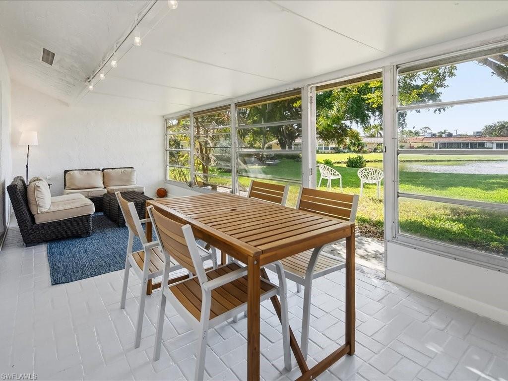 Beautiful Glades Golf & Country Club villa with SW exposure lake view. The Spanish style villa offers 2 bedroom / 2 bath and a large enclosed sun room overlooking the lake. The newly renovated kitchen features custom cabinetry, granite countertops, and brand-new appliances, while LED lighting adds a modern touch throughout. New luxury vinyl flooring with ProTech insulation enhances the space, providing both style and energy efficiency. Impact-resistant hurricane glass windows and doors offer added protection. A new roof was installed in 2019. Enjoy your morning coffee, entertaining friends and family from the oversized sunroom year round or enjoy watching the natural wildlife such as turtles, ducks and herons. The villa is in walking distance to the pro shop, golf, clubhouse & the main pool with restaurant, pickleball & tennis. Offered furnished. Included in the HOA fees are water & sewer, cable TV & Wifi internet, a bundled golf-membership, only 10 minutes from Old Naples, 5th Ave S shopping & restaurants. The resort style amenities of The Glades Golf & Country Club include 2 beautiful Gordon Lewis designed golf courses, pickleball, tennis courts, 9 pools, bocce, shuffleboard, a restaurant on the 19th hole with in- and outdoor seating, a clubhouse, library, crafts room, pro shop, a vehicle wash station and so much more. Walk to public transportation & shopping. Shared laundry - only used by unit H2. Additional Storage outside.