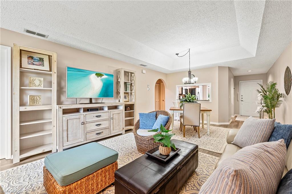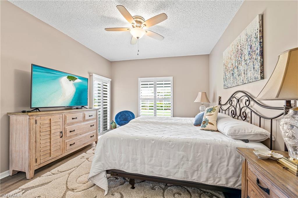 Welcome to 529 Mardel Drive #304, a beautifully maintained, turn-key furnished 2-bedroom, 2-bath condo in the sought-after community of The Colonies at Berkshire Lakes in Naples, Fl. This first-floor end-unit offers a peaceful setting, smart upgrades, and full storm protection, making it an ideal home for full-time living, seasonal getaways, or investment. This 1,093 sq ft condo features a split-bedroom layout with vinyl plank flooring throughout and tasteful furnishings that are included with the sale-just bring your suitcase. One of its most valuable features is the storm-ready setup: all windows and the lanai are equipped with both electric and manual hurricane shutters, providing year-round peace of mind. Inside, you'll find elegant plantation shutters throughout the unit, offering classic style and excellent light control. The kitchen has been updated with white cabinetry, light stone countertops, a center island, pantry, and stainless steel appliances including a refrigerator, cooktop, dishwasher, and microwave. It opens seamlessly into the dining and living area, which flows onto a screened-in lanai overlooking a peaceful lake and the community pool-perfect for enjoying morning coffee or Florida's famous sunsets. The primary suite features lake views, dual closets and an ensuite bath with dual vanities and a walk-in shower. The second bedroom is located on the opposite end of the condo, offering privacy for guests and convenient access to the second full bath. Additional highlights include a full-sized washer and dryer in-unit, tray ceilings, built-in cabinetry, ceilings fans, and assigned paved parking just steps from your front door. The condo also includes cable and internet prewiring. Located within the low-density Colonies community-part of the Berkshire Lakes development- resident enjoys access to a heated community pool, tennis courts, clubhouse, and scenic bike and walking paths around the lakes. The HOA is pet friendly with approval and allows 3 leases per year(30-day minimum), offering great rental flexibility. With an unbeatable Naples location, you'll be just minutes to grocery stores, restaurants, and I-75, and a short drive to Downtown Naples, 5th Avenue, and the Gulf beaches. HOA fees are 1,543 quarterly plus a $640 annual master fee, covering water, cable, trash, irrigation, lawn care, and professional management. If you're looking for a secure, stylish, and move-in ready home with essential features like hurricane shutters, plantation shutters, and furnishings included, this unit delivers exceptional value.
