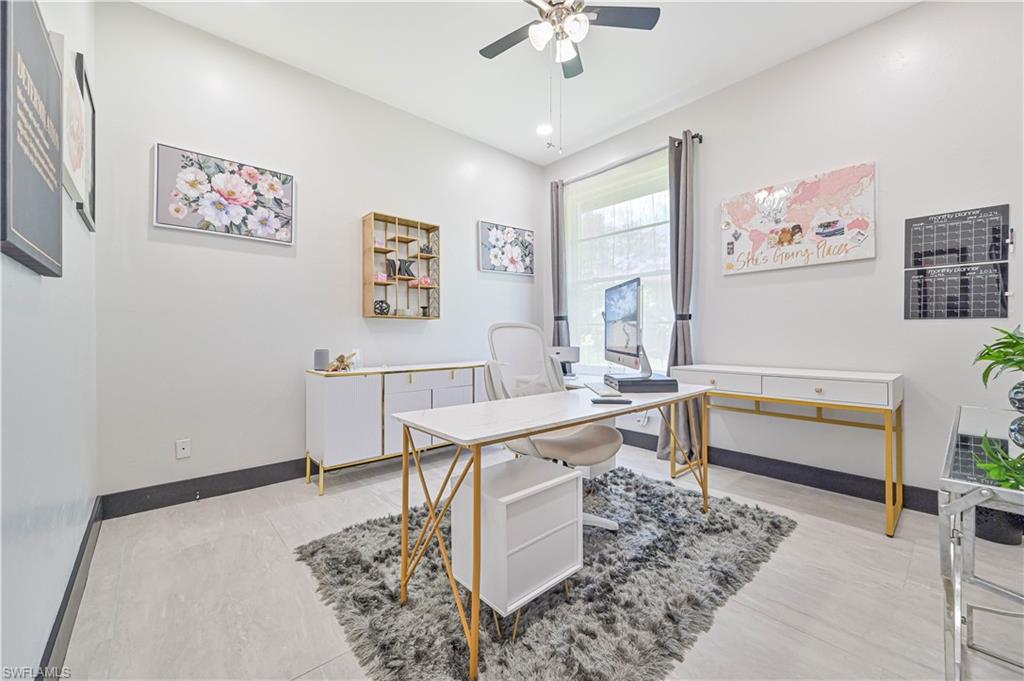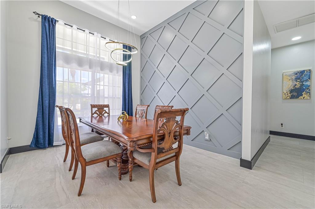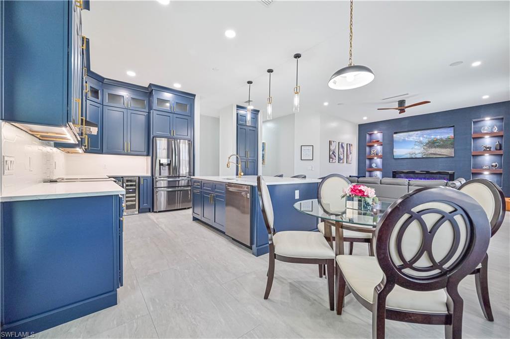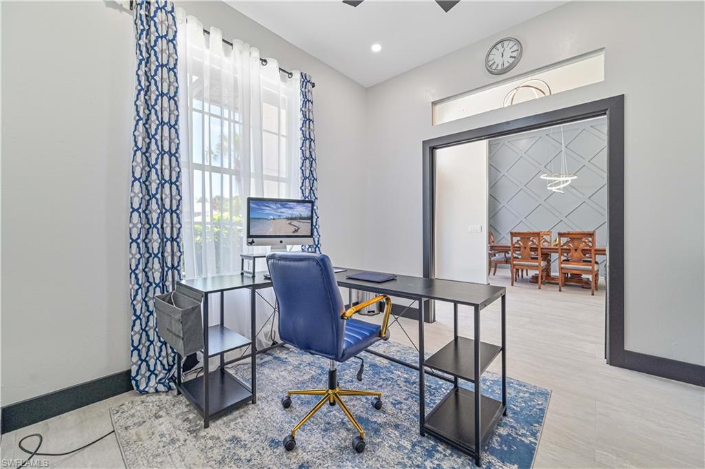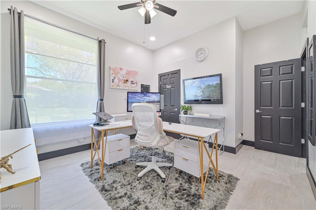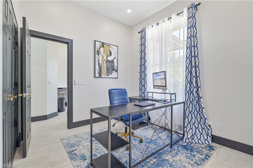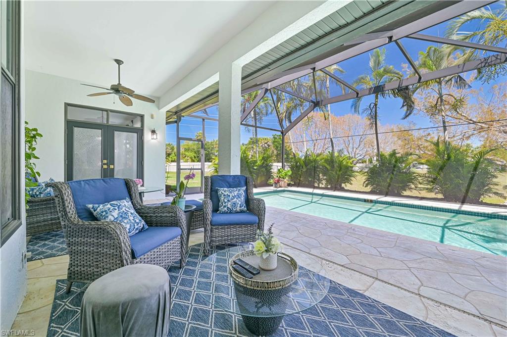 Welcome to this impeccably updated residence, which has 3BRs plus a versatile den, and 3BAs, an encompasses 2,396 square feet of indoor living space. Set on an oversized lot with beautifully landscaped grounds and white exterior, this home offers curb appeal and privacy. Step inside to discover the large porcelain tiles, with complementary interior paint, and stylish 5-inch baseboards that grace every room. The updated kitchen is a chef's delight, featuring sleek cabinets, quartz countertops, and top-of-the-line appliances including a refrigerator, range, dishwasher, microwave, and a wine fridge. The home's interior is illuminated by recessed lights and light fixtures, designed for both functionality and style. The primary bedroom is a haven of comfort with French doors that open to a covered lanai and sparkling pool, overlooking a serene pond. The primary bathroom is a serene retreat with its modern cabinets, quartz countertop, Bluetooth ventilation fan, and a glass-enclosed shower adorned with gold-accented faucets. The primary closet features a custom organizational system with shelves, drawers, and hangers, catering to all your wardrobe needs. The dining room captivates with its diamond-inspired feature wall and modern light fixture, while the living room offers a stunning focal point with grass cloth wallpaper, an electric fireplace, and lighted shelving. The guest bath has been transformed with contemporary updates, including cabinets, quartz countertops, black fixtures, Bluetooth ventilation fan, and a tiled shower with a sleek sliding glass door. Updates to the laundry room include cabinets, sink, quartz countertop, and a stylish tiled backsplash. The backyard is fully fenced, ideal for small dogs. Enjoy the privacy of your covered lanai, offered by the uniquely-shaped lot. This home is a perfect blend of elegance and practicality, designed to offer unparalleled comfort and style. Centrally located within SWFL, with a short drive along the major thoroughfares of I-75 and US-41 to malls, restaurants, shops, beaches, golf, and other fun activities. HOA is only $500/Year!