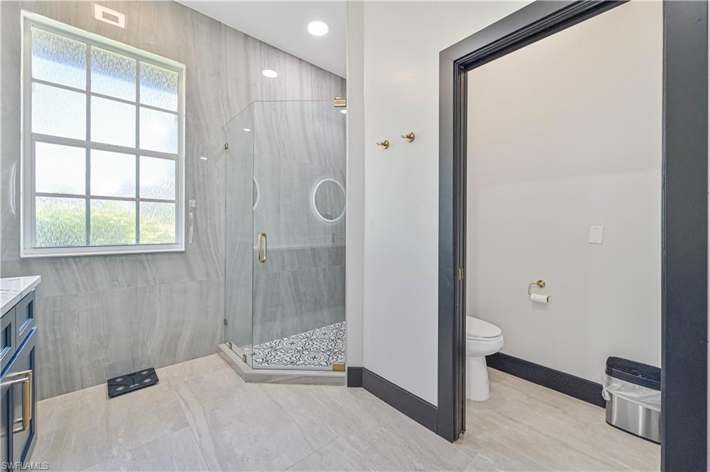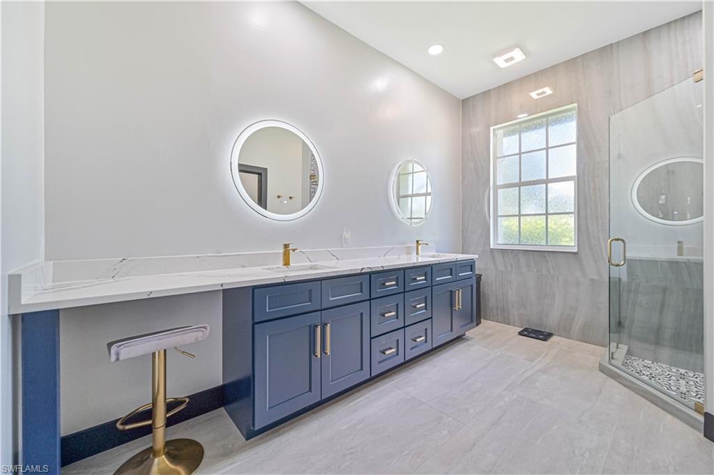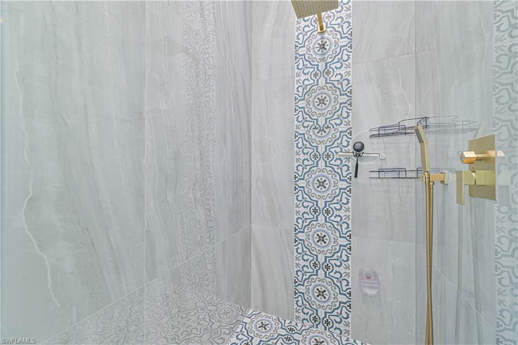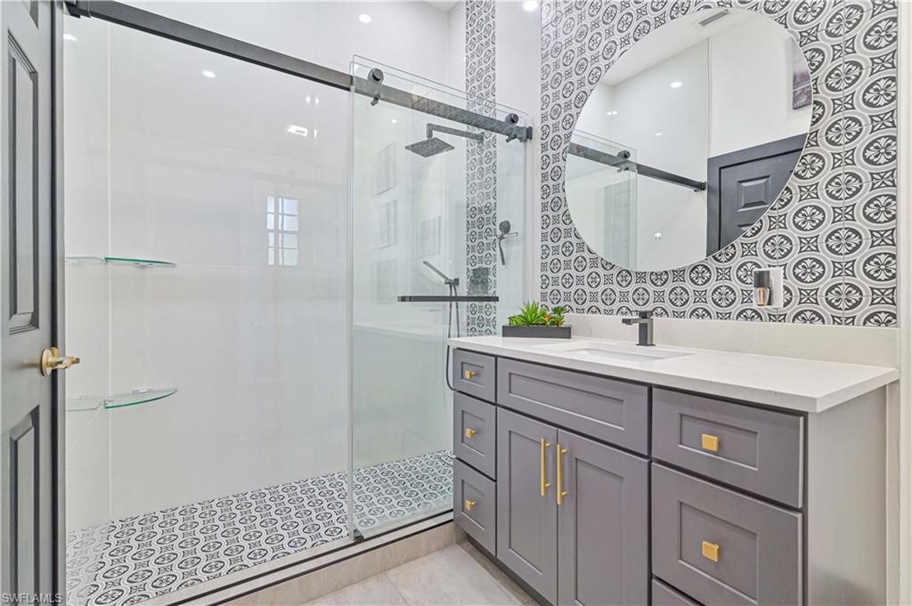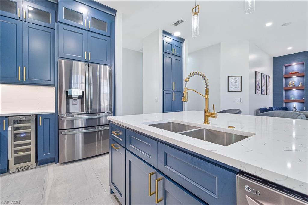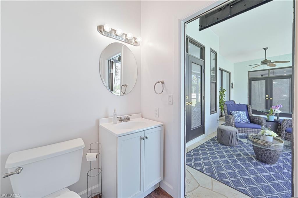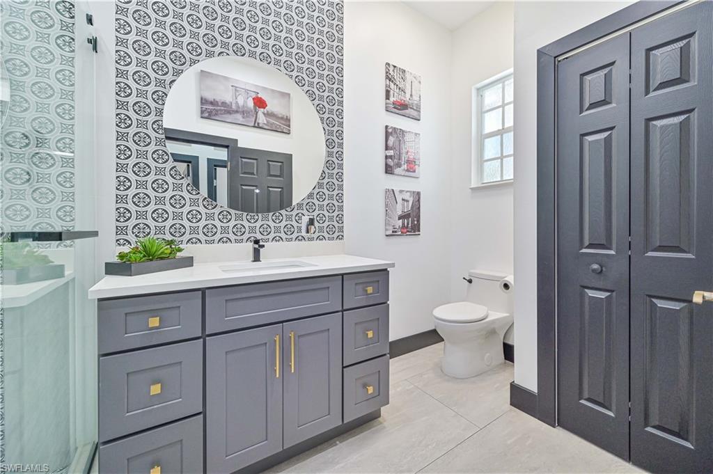 Welcome to this impeccably updated residence, which has 3BRs plus a versatile den, and 3BAs, an encompasses 2,396 square feet of indoor living space. Set on an oversized lot with beautifully landscaped grounds and white exterior, this home offers curb appeal and privacy. Step inside to discover the large porcelain tiles, with complementary interior paint, and stylish 5-inch baseboards that grace every room. The updated kitchen is a chef's delight, featuring sleek cabinets, quartz countertops, and top-of-the-line appliances including a refrigerator, range, dishwasher, microwave, and a wine fridge. The home's interior is illuminated by recessed lights and light fixtures, designed for both functionality and style. The primary bedroom is a haven of comfort with French doors that open to a covered lanai and sparkling pool, overlooking a serene pond. The primary bathroom is a serene retreat with its modern cabinets, quartz countertop, Bluetooth ventilation fan, and a glass-enclosed shower adorned with gold-accented faucets. The primary closet features a custom organizational system with shelves, drawers, and hangers, catering to all your wardrobe needs. The dining room captivates with its diamond-inspired feature wall and modern light fixture, while the living room offers a stunning focal point with grass cloth wallpaper, an electric fireplace, and lighted shelving. The guest bath has been transformed with contemporary updates, including cabinets, quartz countertops, black fixtures, Bluetooth ventilation fan, and a tiled shower with a sleek sliding glass door. Updates to the laundry room include cabinets, sink, quartz countertop, and a stylish tiled backsplash. The backyard is fully fenced, ideal for small dogs. Enjoy the privacy of your covered lanai, offered by the uniquely-shaped lot. This home is a perfect blend of elegance and practicality, designed to offer unparalleled comfort and style. Centrally located within SWFL, with a short drive along the major thoroughfares of I-75 and US-41 to malls, restaurants, shops, beaches, golf, and other fun activities. HOA is only $500/Year!