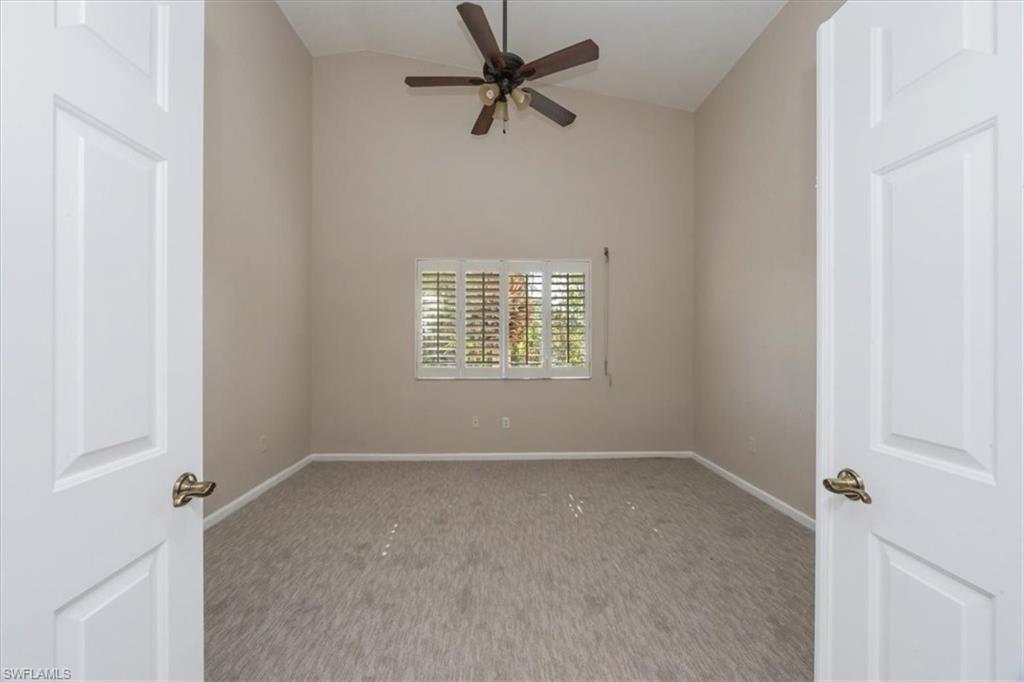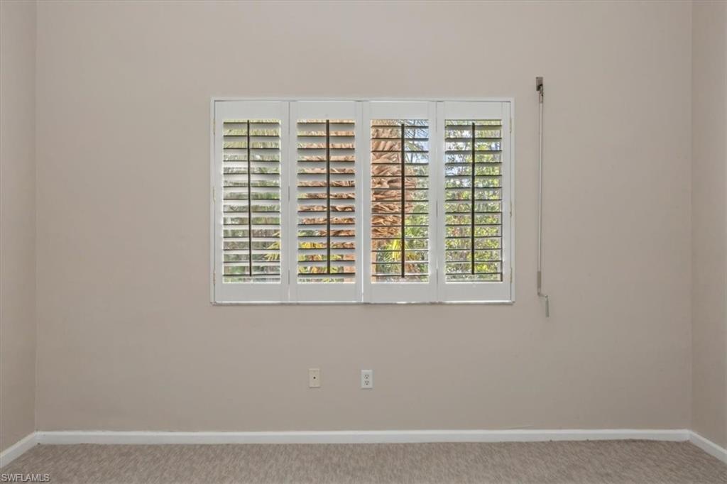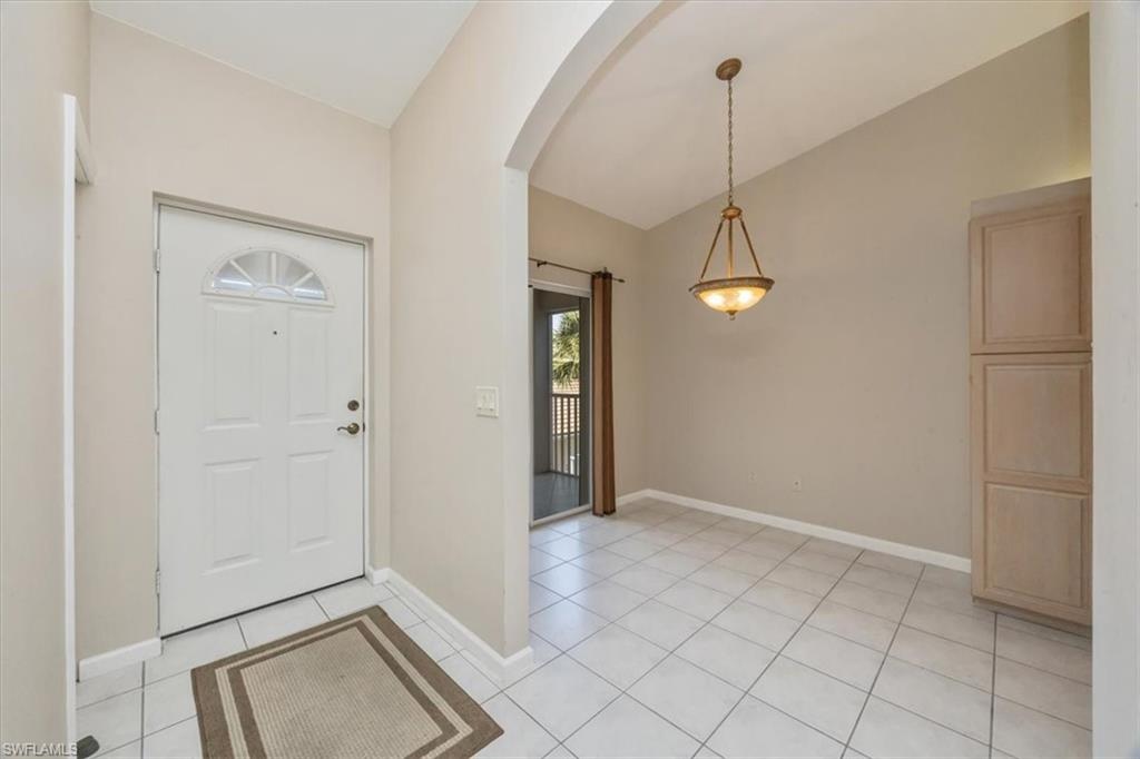 Located in the highly desirable Falling Waters Preserve in North Naples, this beautifully appointed second-floor end-unit residence offers privacy, natural light, and refined coastal living, complete with a detached single-car garage (#518). Situated at the end of a quiet cul-de-sac, the home features freshly painted exteriors, new landscaping and mulch, excellent guest parking, and close proximity to the community pool area. Inside, a welcoming tiled entryway with coat closet opens to an airy great room with vaulted ceilings, ceramic tile flooring, and a designated dining area highlighted by a decorative chandelier and neutral finishes throughout. The eat-in kitchen is thoughtfully designed with blonde ash wood cabinetry, cream countertops, an undermount porcelain sink, Whirlpool appliances, decorative pendant lighting, recessed lighting, and sliding doors leading to a charming front screened lanai with rattan window treatments. The living room offers new plush wall-to-wall carpeting, vaulted ceilings, neutral tones, and a three-panel slider opening to the covered, screened lanai. The owner’s suite is a tranquil retreat featuring new carpeting, vaulted ceilings, French doors to the lanai, and a spa-like en-suite bath with pocket door entry, floating double vanity, cream countertops, soaking tub, separate shower with bubbled privacy glass, accent tile detailing, private water closet, and mirrored doors to the walk-in closet. Two additional guest accommodations include a versatile den or third bedroom with French door entry, plantation shutters, ceiling fan, vaulted ceilings, and dual closets, along with a spacious guest suite featuring new carpeting, vaulted ceilings, plantation shutters, and ceiling fan, complemented by a guest bath with oversized floating vanity, cream countertops, tub and shower with privacy glass, and faux-finished walls. A dedicated laundry room offers LG front-loading washer and dryer on pedestals, utility sink, additional storage cabinetry, HVAC replaced in 2018, and a 40-gallon hot water heater. The screened rear lanai is ideal for relaxing or entertaining, featuring electric shutters, white ceramic tile flooring, serene preserve views, soft waterfall landscaping accents, and desirable eastern exposure for morning light. All of this is set within Falling Waters Preserve, a gated community offering resort-style amenities, scenic walking paths, and an unbeatable location just minutes from premier shopping, dining, Wiggins Pass, and the white-sand beaches of Bonita Beach Road.