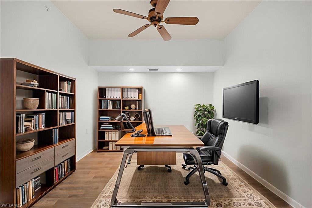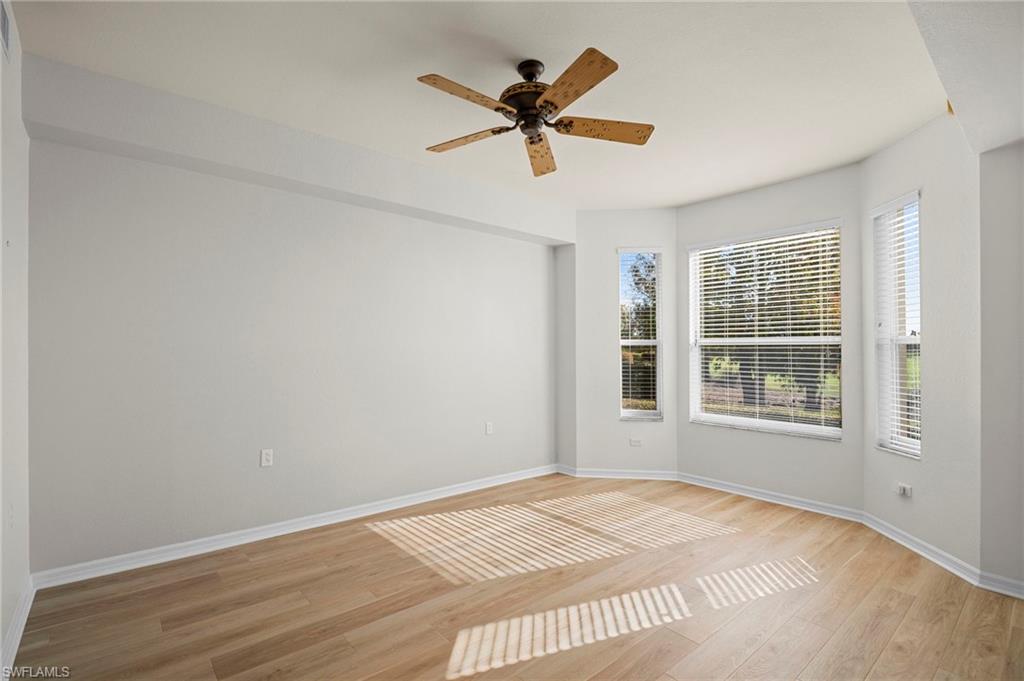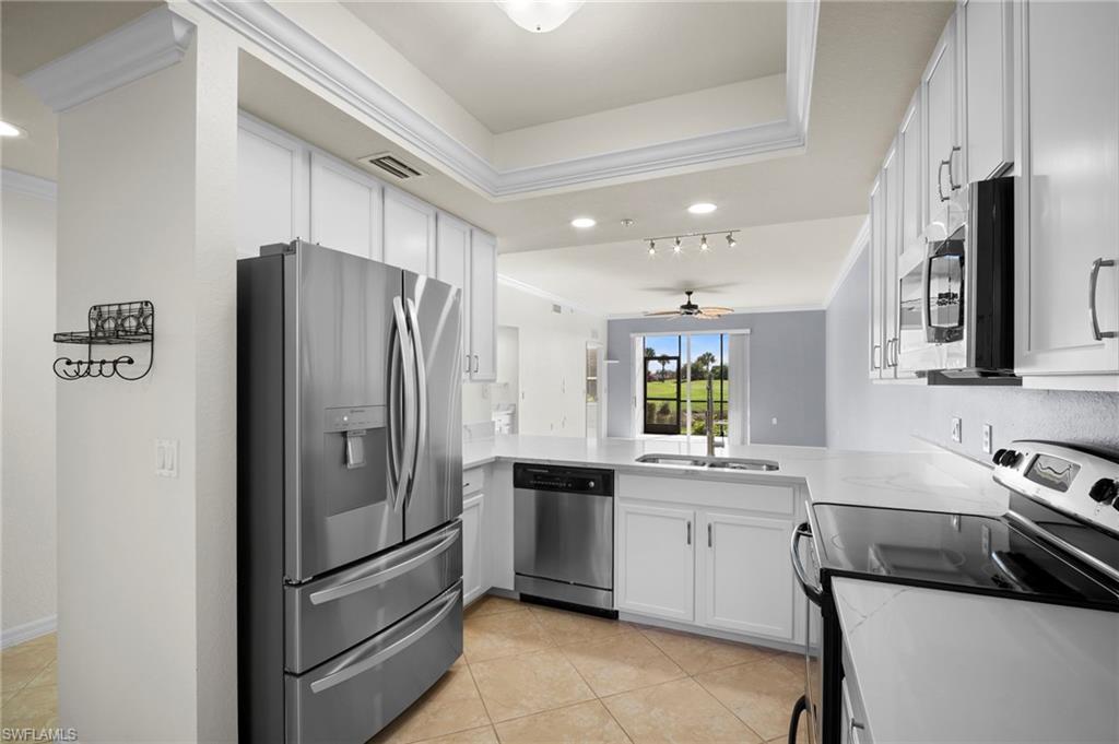 Very nicely updated Barrington model Veranda condo with southeastern lake & golf green views! The Barrington features 2 bedrooms, 2 baths, a den, a one car detached garage and both a front and back screened lanai! This condo has been well upgraded, including single level Quartz countertop and white kitchen cabinets, luxury VP flooring in both bedrooms and the den, newer AC, new fans and light fixtures, freshly painted walls and more! Heritage Bay features a stunning 27-hole Lewis-Azinger designed golf course and aqua driving range. The grand clubhouse offers diverse dining options, elegant event spaces, and a lively social scene. Have a bite to eat in The Grille Room— a casual indoor/outdoor bar & dining area, with an incredible southern view of the 27th green. Members can also enjoy a resort-style pool area with heated spa & 'The Cabana' poolside bar & grille with a full service kitchen. The community also includes a top-notch tennis program with 7 har-tru clay courts, pickleball & bocce courts, and a state-of-the-art fitness center. With a calendar full of events and activities, Heritage Bay ensures a vibrant and luxurious lifestyle for its members. Whether you're a golf enthusiast or simply looking for serene views and luxury living, Heritage Bay offers it all.