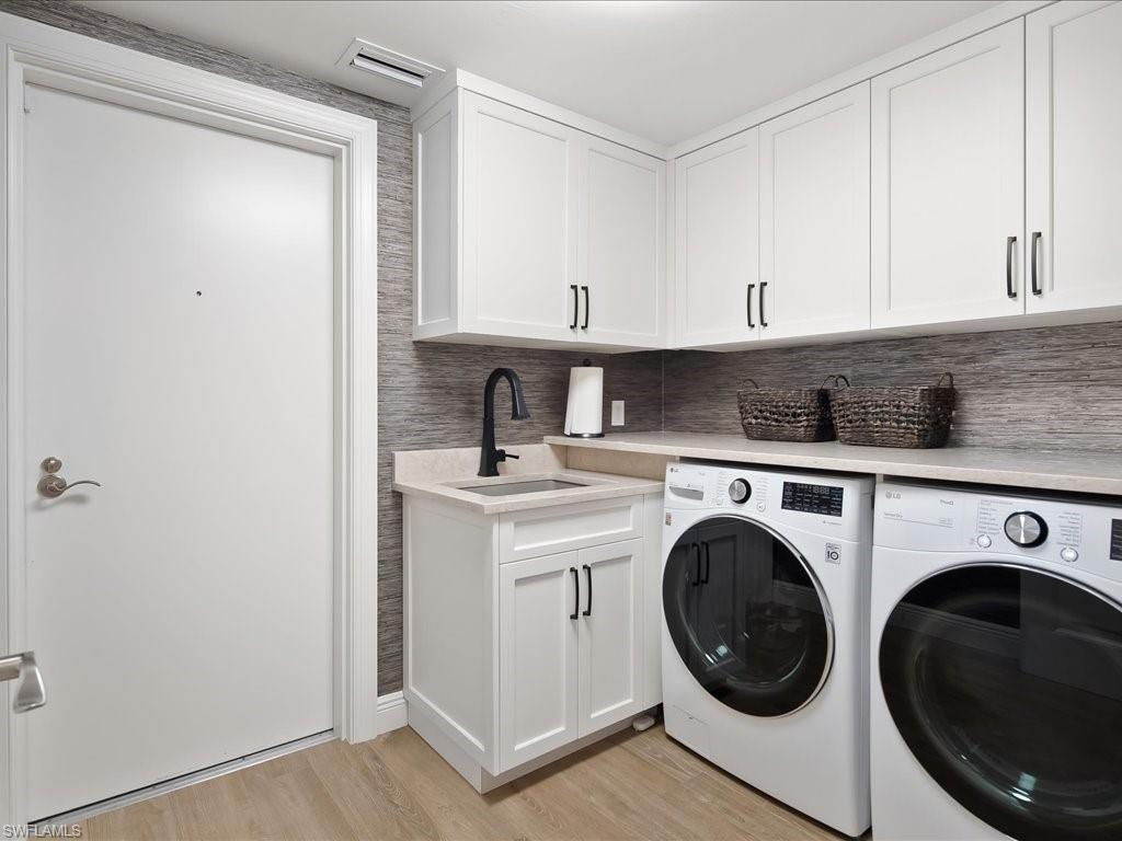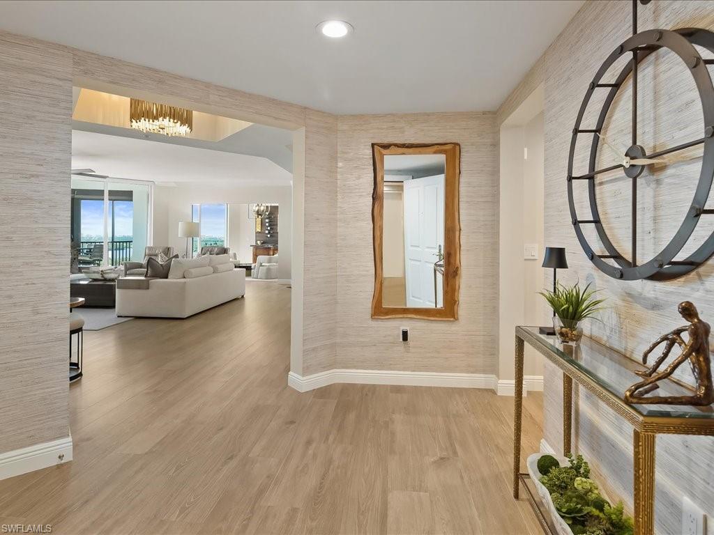 WOW! YOU HAVE NEVER SEEN A SKY HOME OF THIS MAGNITUDE AT HAMMOCK BAY. THIS RESIDENCE HAS BEEN COMPLETELY TRANSFORMED BOTH IN INFRASTRUCTURE AND AESTHETIC APPEAL. A PROFESSIONAL INTERIOR DESIGNER WAS USED HERE FOR ALL NEW FURNITURE, RUGS, AND DECOR THROUGHOUT INCLUDING ONE OF A KIND ARTWORK HAND PICKED FOR EACH SPACE. AS YOU STEP OFF THE PRIVATE ELEVATOR YOU WILL SEE GORGEOUS PORCELAIN TILE THROUGHOUT. THE KITCHEN WAS OPENED UP WITH AN MASSIVE QUARTZ ISLAND WITH ADDITIONAL STORAGE UNDERNEATH, STATE OF THE ART APPLIANCES, GRANITE SINK, LIVE EDGE WOOD SHELVING, WATER FILTRATION, ALL NEW HARDWARE AND PULLOUTS. JUST OFF THE KITCHEN IS A UNIQUE LIVE EDGE TABLE WITH ALL NEW POSH WINDOW SEATING WITH ADDITIONAL STORAGE. LOCATED IN THE FAMILY ROOM IS A CUSTOM BUILT IN BAR WITH LEATHERED CHISELED EDGE GRANITE COUNTER, FULL SIZE WINE REFRIGERATOR, REFRIGERATOR DRAWERS, GLASS SHELVING, AND ALSO FEATURES A WALL WINE RACK WITH DECORATIVE ART GLASS LED WALL SCONCES. THE SPACIOUS LIVING ROOM WITH WINDOW WALLS SHOWCASES A HAND CRAFTED BUILT IN WALL UNIT WITH A LINEAR 82" ELECTRIC FIREPLACE AND LIGHTED WOOD SHELVING WITH A 75" TV WITH SOUND BAR. THE LUXURIOUS PRIMARY SUITE HAS A DESIGNER KING BED AND HANGING 65" TV WITH SOUND BAR. THE CLOSETS IN THIS SUITE HAVE PROFESSIONAL BUILT IN DRESSERS AND MIRRORS. ON THE OTHER END OF THIS SPACIOUS CONDO IS 3 ADDITIONAL BEDROOMS AND 2 LUXURIOUS BATHROOMS. THE FOURTH BEDROOM HAS A BUILT IN DESK WITH LEATHERED GRANITE COUNTERTOP, WINDOW SEAT, STORAGE DRAWERS AND A MOUNTED 55" TV WITH SOUND BAR. THE POWDER ROOM WILL SURELY IMPRESS WITH THE ONE OF A KIND SINK AND MATCHING DECOR. ADDITIONALLY THE RESIDENCE HAS GUARDIAN ELECTRIC SHUTTERS ON THE LANAI AND BOTH OPEN LANAIS, AND HUNTER DOUGLAS PIROUETTE ELECTRIC WINDOW SHADES ON EVERY WINDOW. LESINA IS A 5 STAR LUXURY TOWER WITH AMENITIES INCLUDING RESORT STYLE POOL AND SPA, POOL PAVILION, DOG PARK, GRAND SALON, LIBRARY, SOCIAL ROOM, THEATER, FITNESS CENTER, UNDER BUILDING PARKING STORAGE AND MORE.