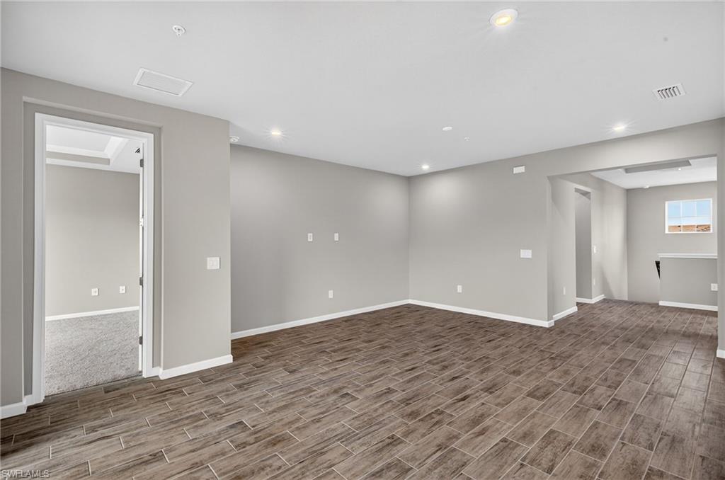 This bright and airy second-floor coach home offers 1,721sq. ft. of thoughtfully designed living space, featuring 2 bedrooms, 2 baths and a den, a 2-car garage, and a screened lanai. The open layout is ideal for both everyday living and entertaining, with a dining area that flows seamlessly into the kitchen. The kitchen showcases white quartz countertops with subtle gray veining, a glass tile backsplash, 42" white cabinetry, and a spacious island with seating for 5–6. Gray tile flooring runs throughout the main living areas, with carpeted bedrooms and staircase. Three large windows over the staircase and expansive sliders in the great room fill the home with natural light. The second bedroom includes its own private balcony—perfect for morning coffee or evening relaxation. Additional highlights include smart home features such as a video doorbell, touchscreen keypad, and an Ecobee smart thermostat compatible with Alexa. Conveniently located near shopping, dining, recreation, beaches, and schools.