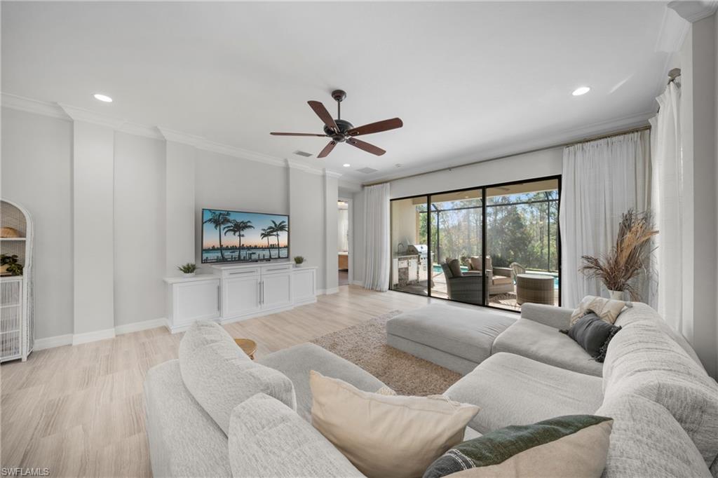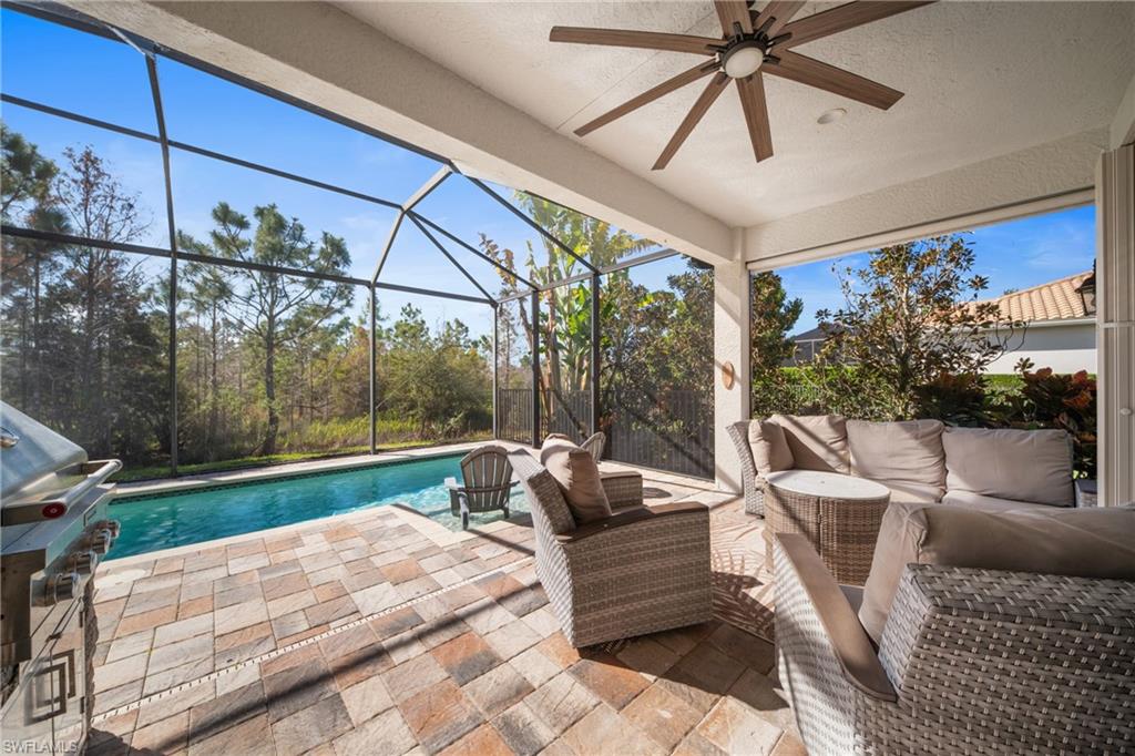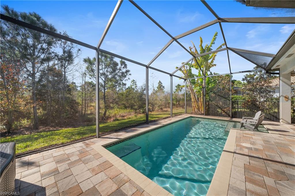 Nestled overlooking a private and protected preserve, this meticulously maintained "Tribeca" floorplan home offers 2234 sq. ft. of luxurious living space in the amenity rich community of Riverstone in North Naples. With 3 bedrooms, den, 2.5 baths, and a 2 car garage, this residence provides ample room for family living and entertaining. The split floorplan includes an open Great Room floorplan with a 14’ slider to the lanai and separate formal dining room. The updated Kitchen includes solid raised panel cabinetry with pull outs, china display cabinet, and over/under cabinet lighting. Enjoy the Florida sun around the heated pool with sunshelf and al fresco dining under the covered lanai complete with outdoor kitchen. Southern rear exposure makes this home light and bright all day long! A long list of notable features include: BRAND NEW HVAC & HOT WATER HEATER; 12x24 tile floors throughout the common areas and high end engineered wood floors in the bedrooms; plantation shutters; crown & detail moldings throughout; easy to use accordion hurricane shutters; widened brick paver driveway; recessed lights in each room; and more! Located in Riverstone, North Naples' premier community, this home offers access to incredible amenities, including a clubhouse with a fitness center, indoor/outdoor basketball courts, a resort-style pool, lap pool, kiddie water park, playground, 5 tennis courts, billiards room, social hall, game room, and more. Riverstone’s prime location is just minutes from I-75, the beach, Mercato, RSW, and downtown Naples. Top-rated schools are nearby, including Laurel Oak Elementary, Oakridge Middle School, and Aubrey Rogers High School. Low HOA Fees of just $1,515/quarter which includes all clubhouse amenities, gated entry, home landscaping, home irrigation water, and home irrigation system maintenance.